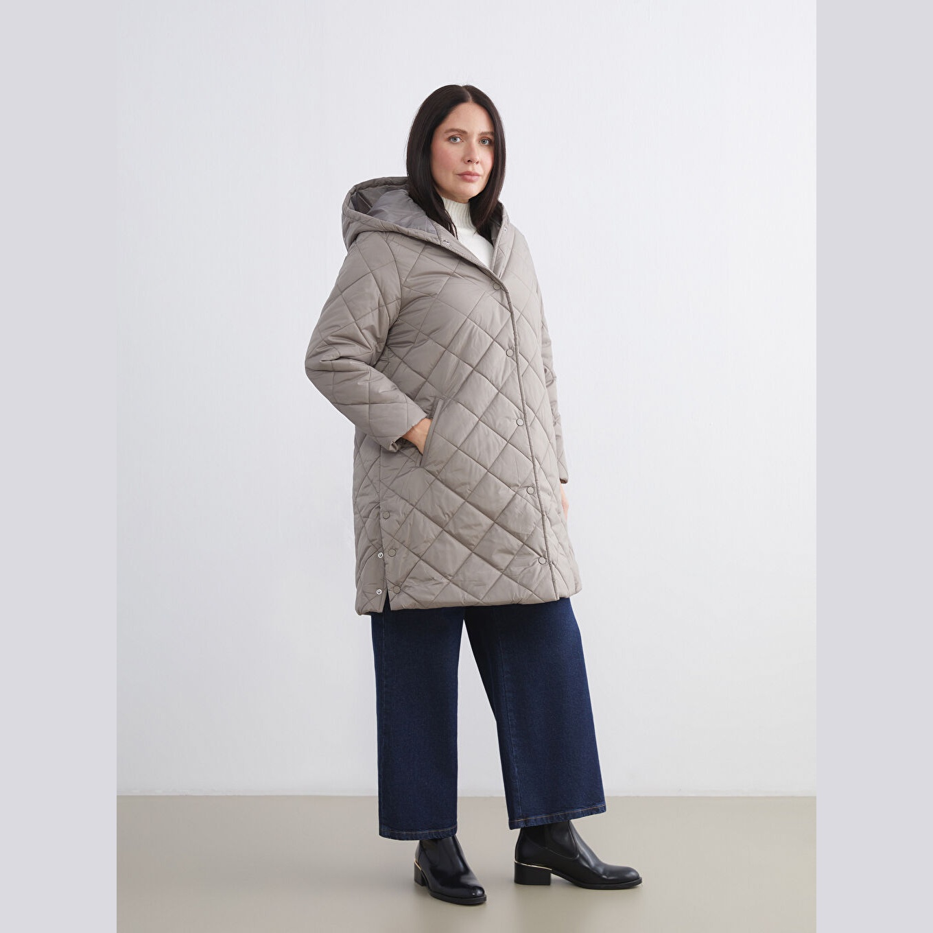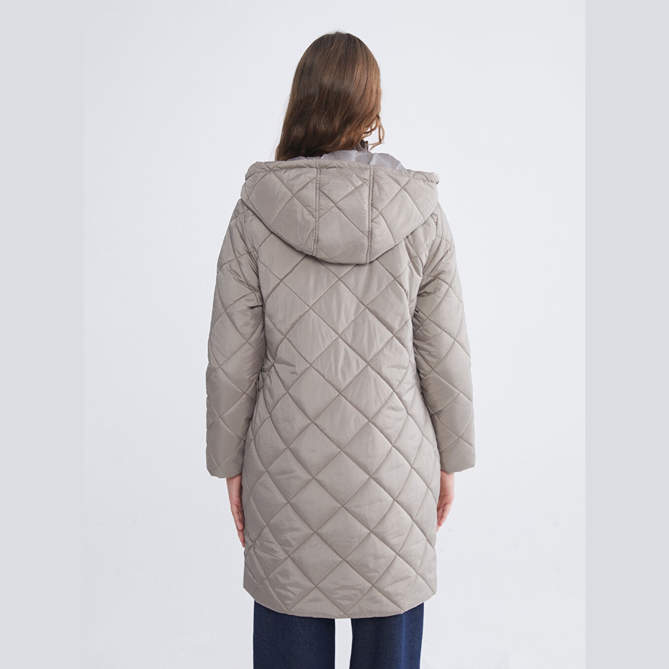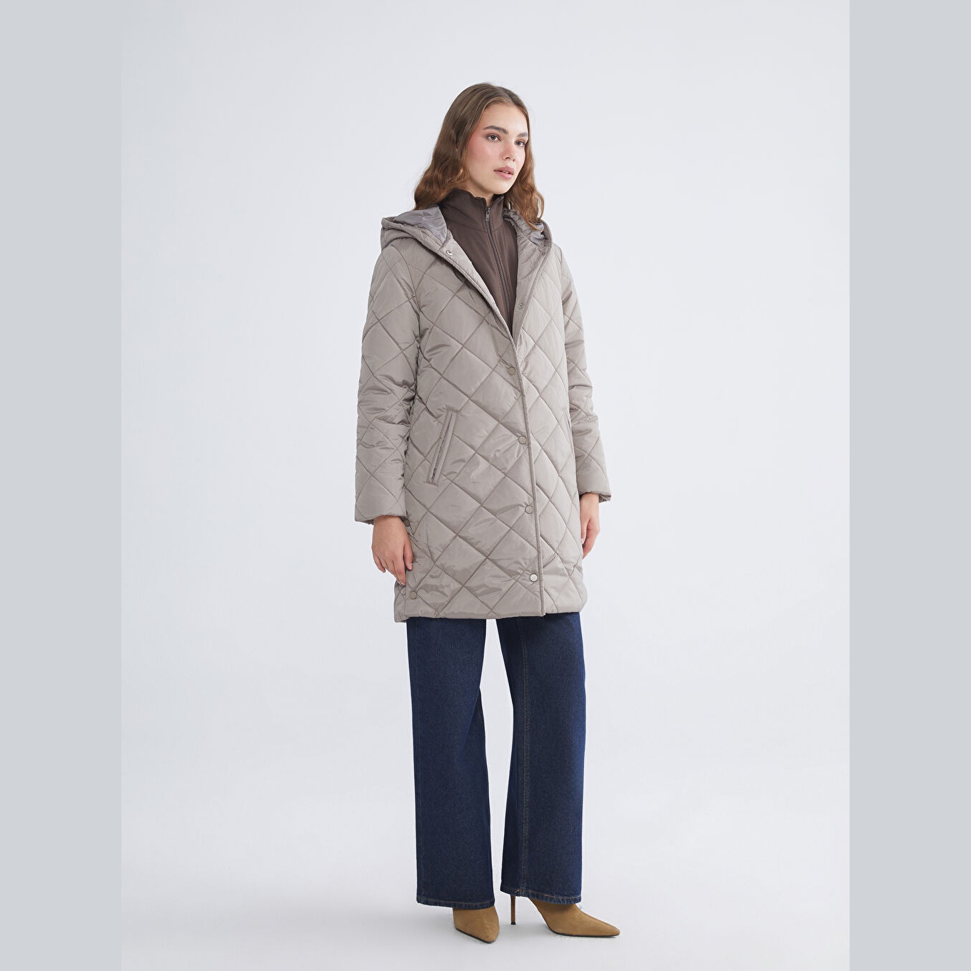 جاكيت شتوي بلون بيج من مجموعة LCW Modest، تصميم بقبعة ثابتة للحماية من الرياح، قصة واسعة تمنحك راحة وأناقة، خامة خارجية من %100 بوليستر بنمط كابيتوني مبطن، مبطّنة بالكامل بـ%100 بوليستر، مع حشوة داخلية من %100 بوليستر، بطول ميدي يُقاس من الكتف، مزود بسحاب أمامي عملي، مثالي للإطلالات اليومية في الطقس البارد بأسلوب محتشم وخفيف.