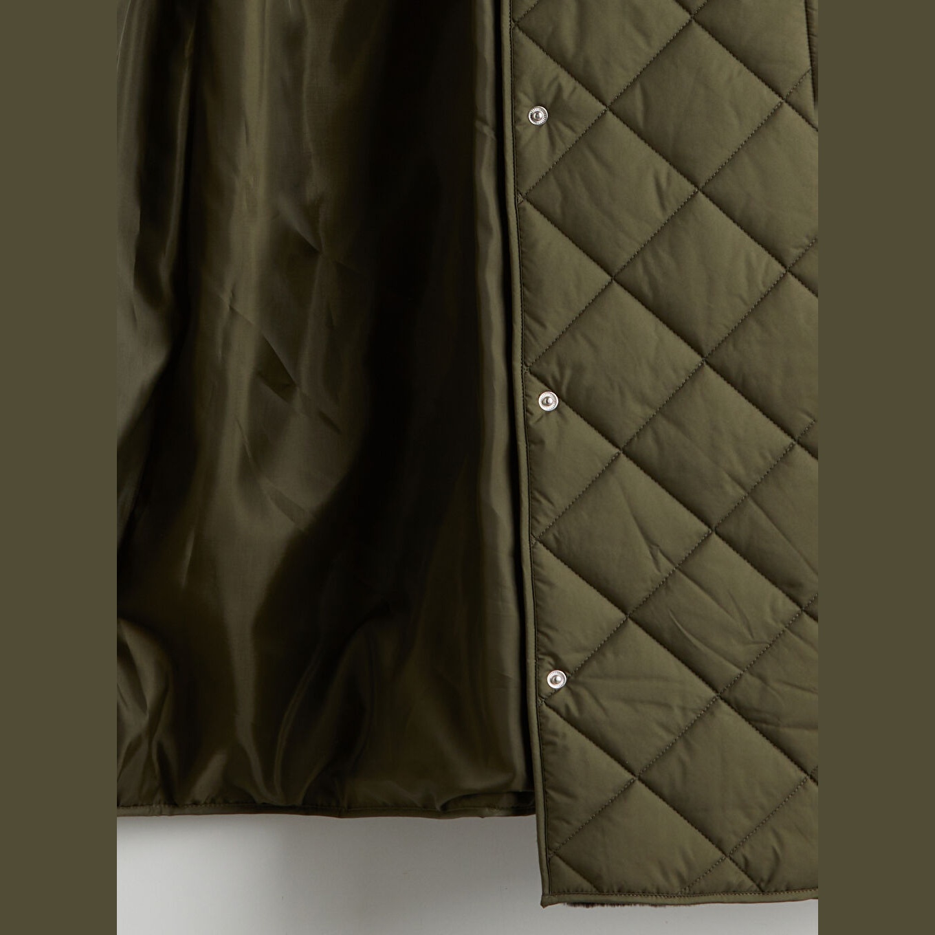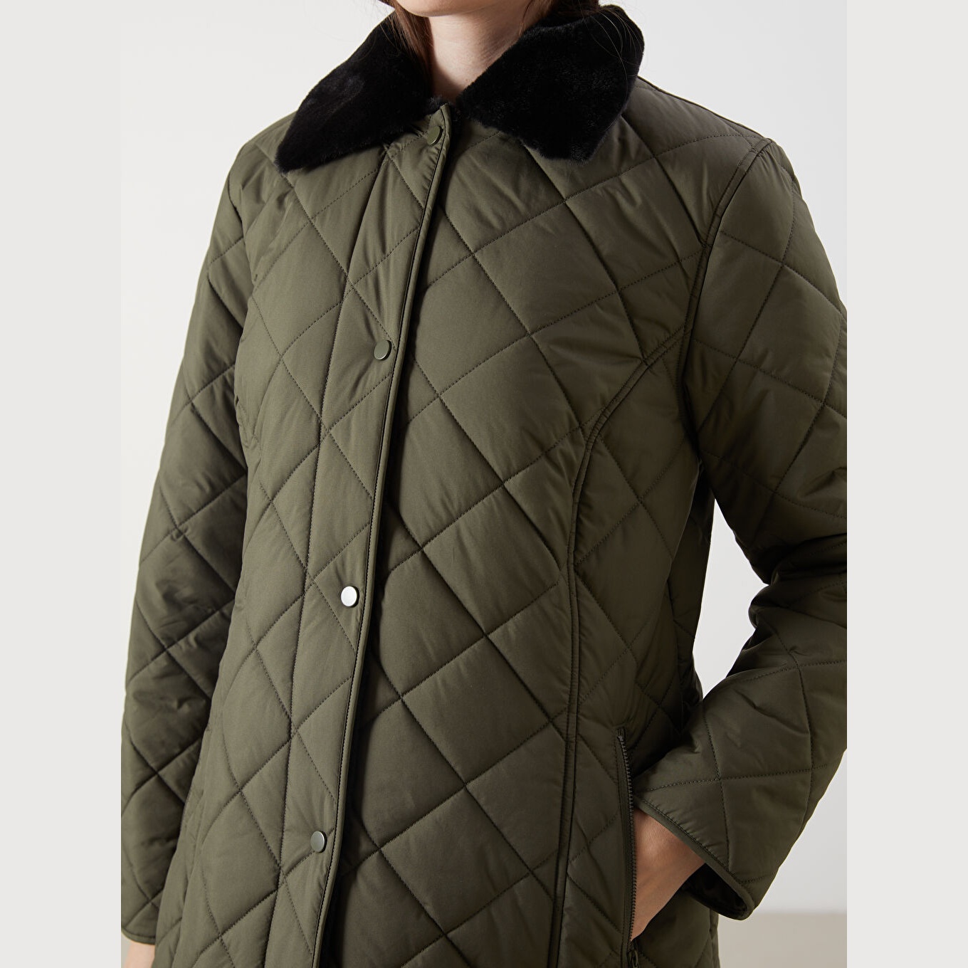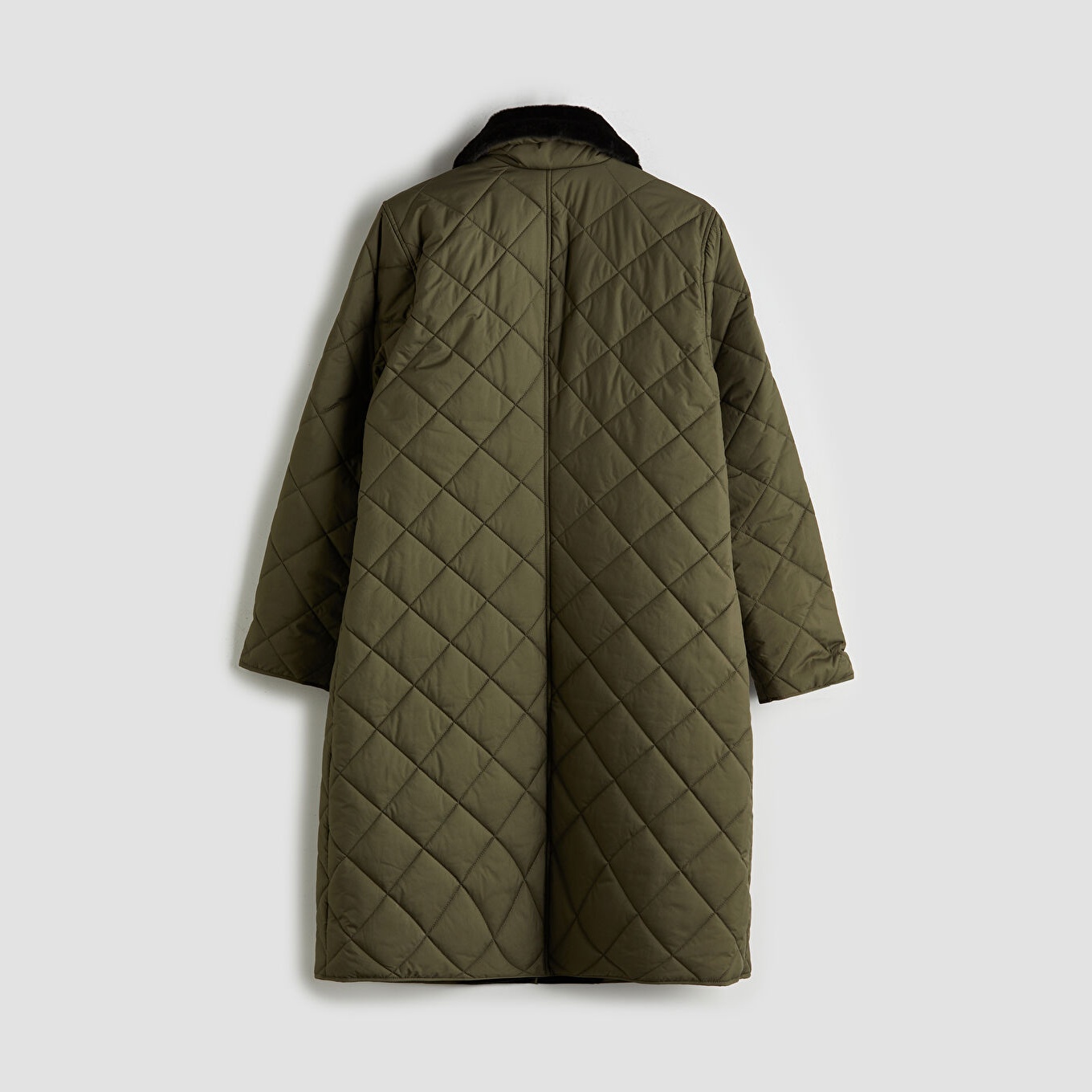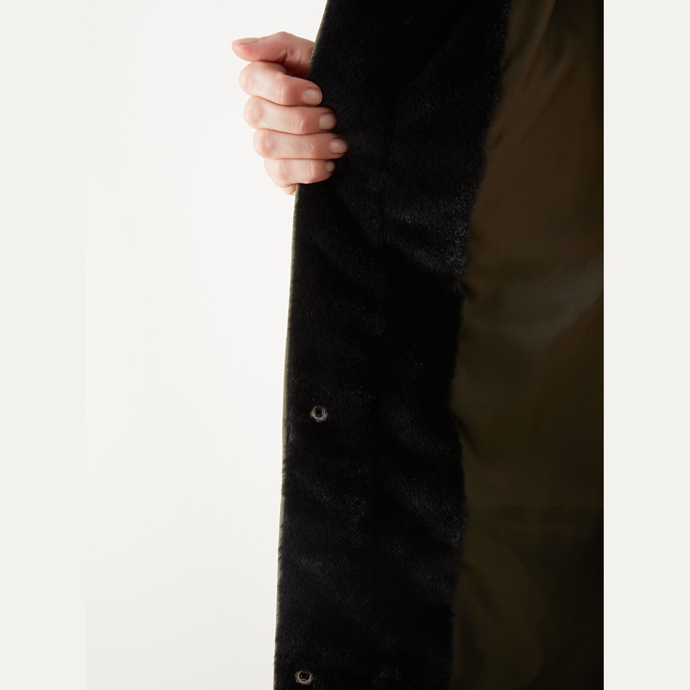 جاكيت شتوي بلون زيتي (هاكي) من مجموعة LCW Grace – كبير الحجم، تصميم بياقة قميص مزينة بالفرو يمنحك دفئًا وأناقة، قصة قياسية توفر مظهرًا متوازنًا وراحة مثالية، خامة خارجية من %100 بوليستر بنمط كابيتوني مبطن، مبطّنة بالكامل بـ%100 بوليستر، مع حشوة داخلية من %100 بوليستر، بطول ميدي يُقاس من الكتف، بدون قبعة، مزود بسحاب أمامي عملي، مثالي للإطلالات اليومية أو الرسمية في الطقس البارد بأسلوب أنيق وفاخر.