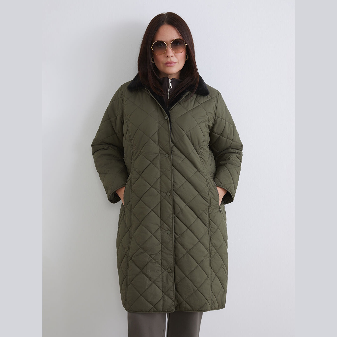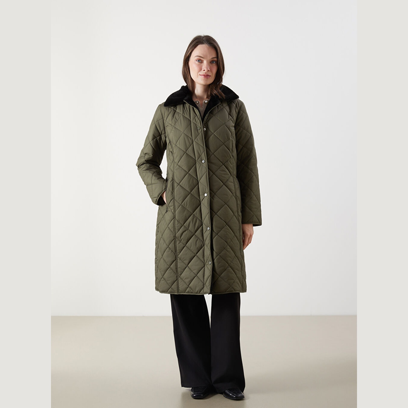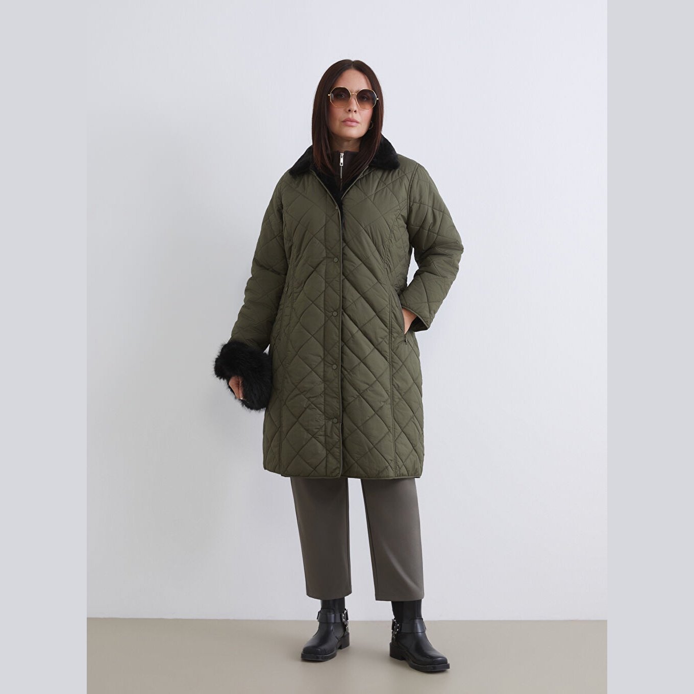 جاكيت نسائي شتوي من LCW Grace – زيتي (قصة قياسية، تصميم ميدي، خامة بوليستر كابيتوني، بياقة قميص مزينة بالفرو، بدون قبعة، مثالي للإطلالات الشتوية الأنيقة ضمن مجموعة "بـيـغ سـايـز")