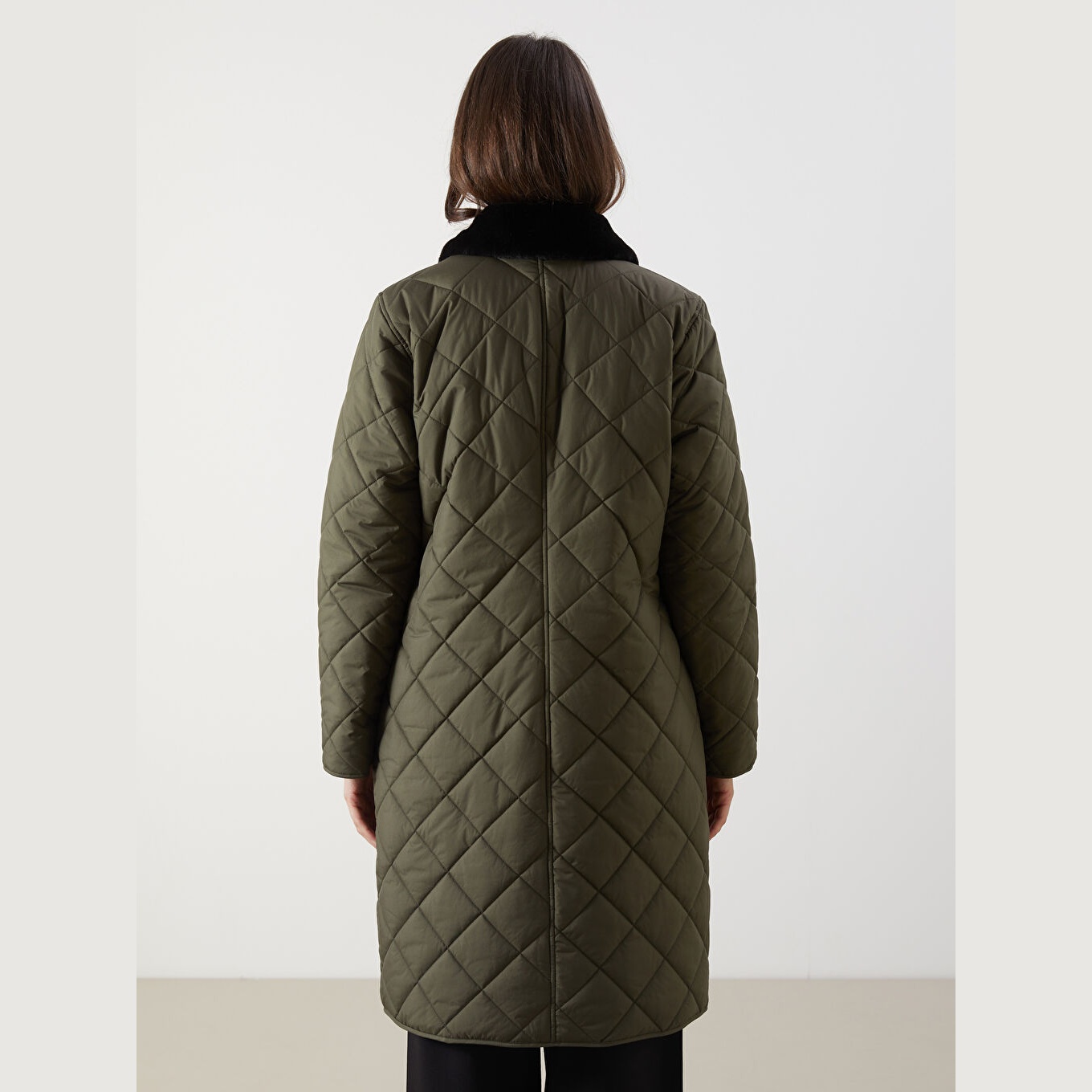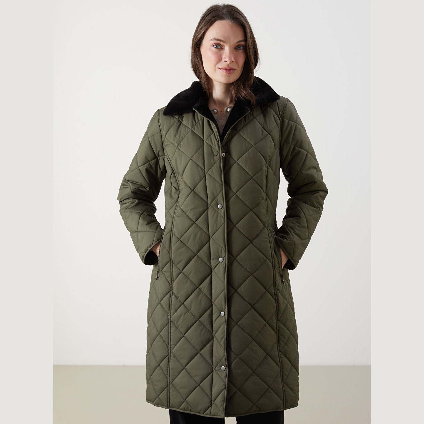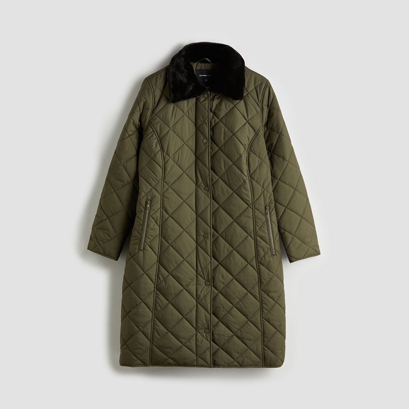 جاكيت نسائي شتوي من LCW Grace – زيتي (قصة قياسية، تصميم ميدي، خامة بوليستر كابيتوني، بياقة قميص مزينة بالفرو، بدون قبعة، مثالي للإطلالات الشتوية الأنيقة ضمن مجموعة "بـيـغ سـايـز")