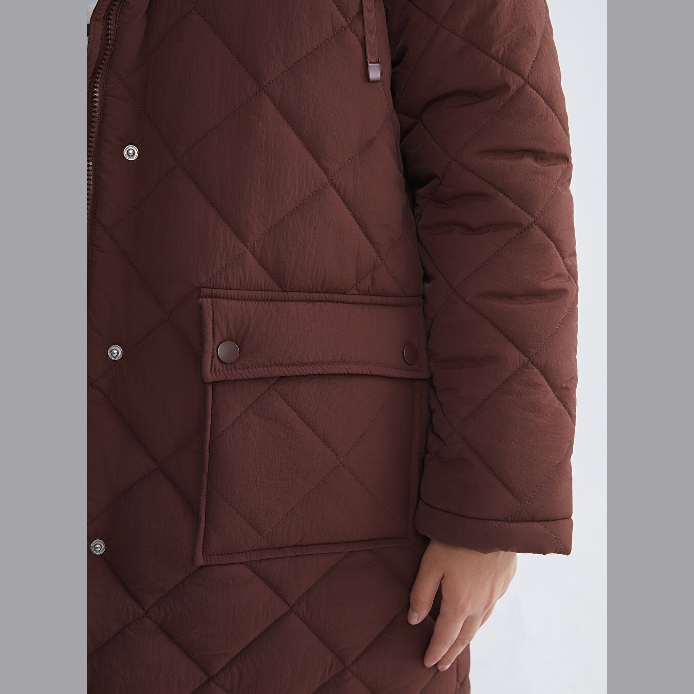 جاكيت شتوي بلون بني من مجموعة LCW Modest، تصميم بقبعة ثابتة للحماية من الرياح، قصة Oversize واسعة تمنحك راحة وأناقة، خامة خارجية من %100 بولياميد بنمط كابيتوني مبطن، مبطّنة بالكامل بـ%100 بوليستر، مع حشوة داخلية من %100 بوليستر، بطول ميدي يُقاس من الكتف، مزود بسحاب أمامي عملي، مثالي للإطلالات اليومية في الطقس البارد بأسلوب محتشم وعصري.