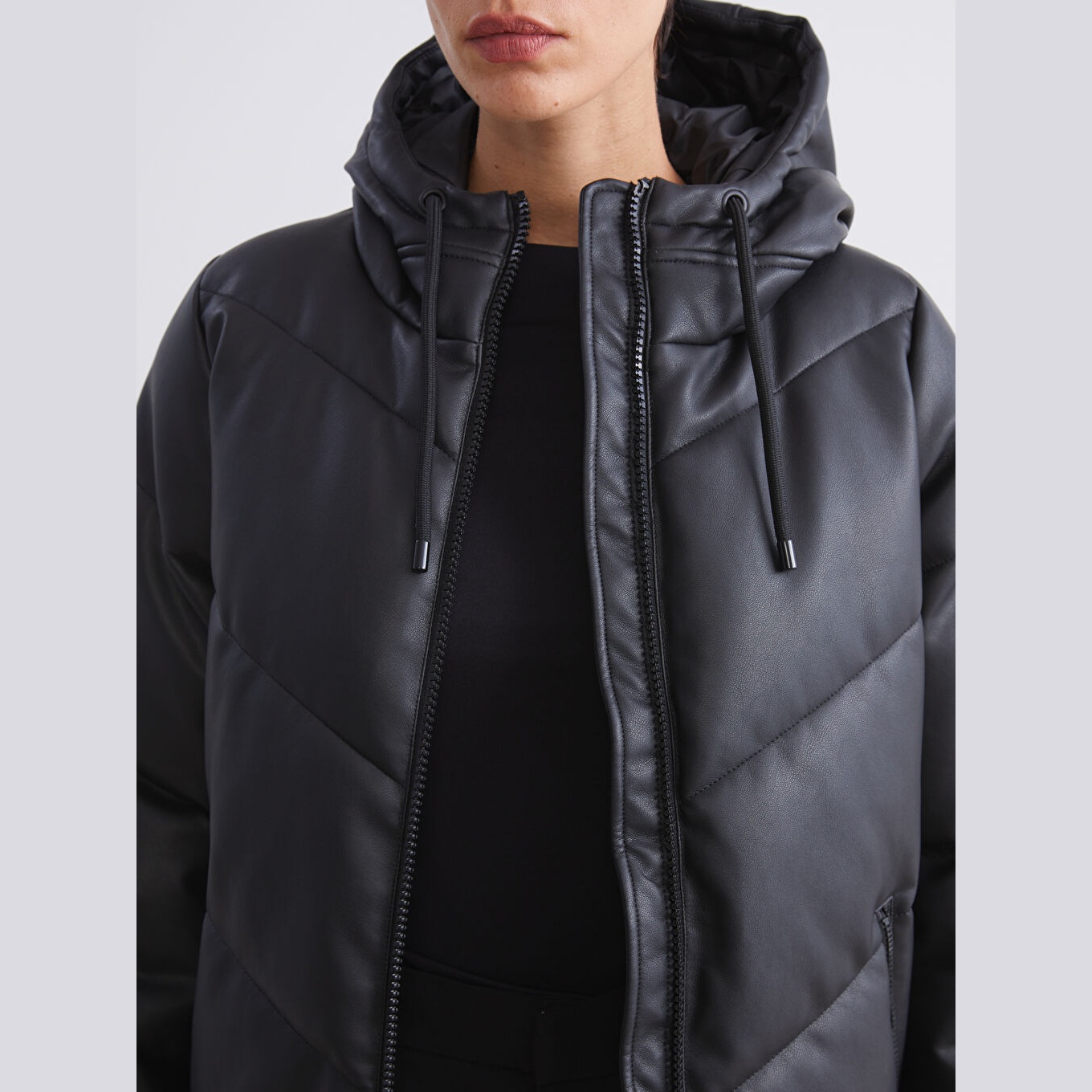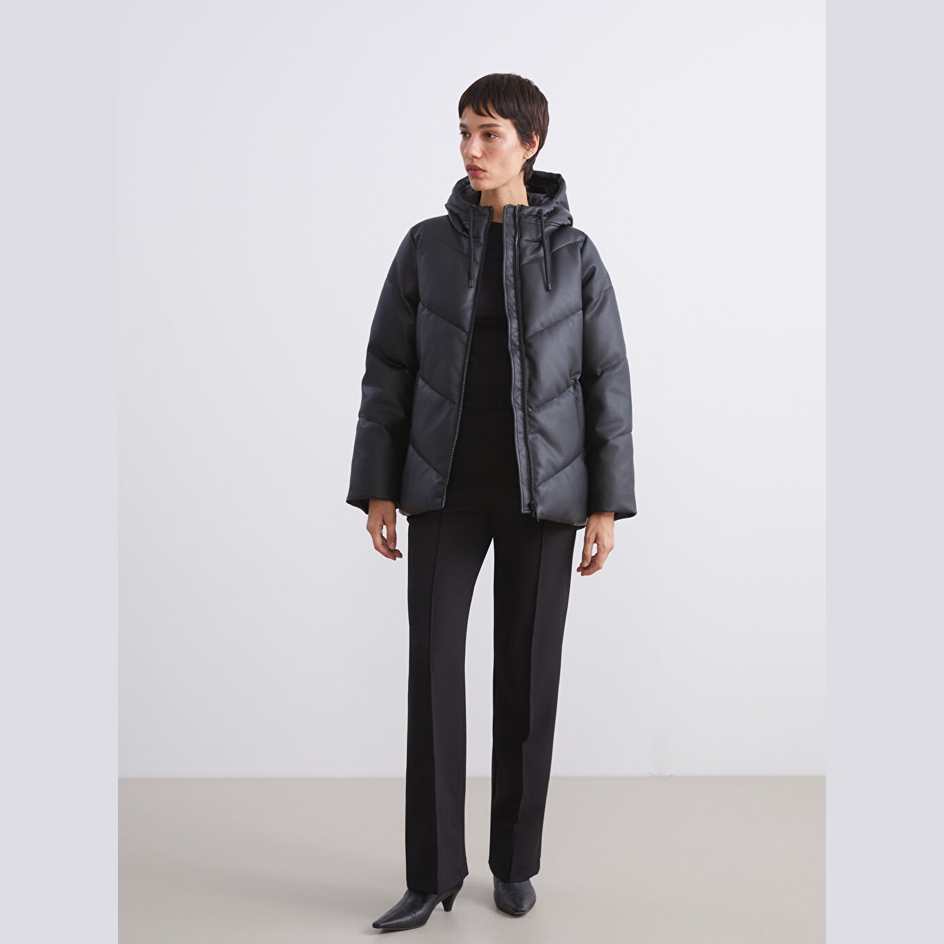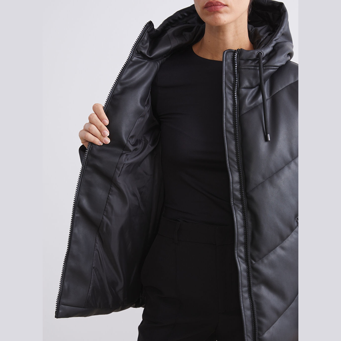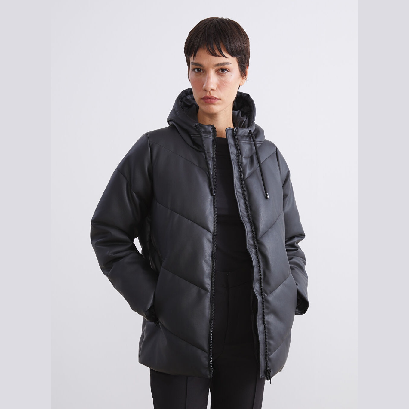 جاكيت نسائي شتوي من LCW Vision – أسود (قصة واسعة، تصميم ميدي، خامة جلد صناعي، قبعة ثابتة، بطانة مبطنة، سحاب أمامي، مثالي للإطلالات الشتوية الفاخرة والعصرية)