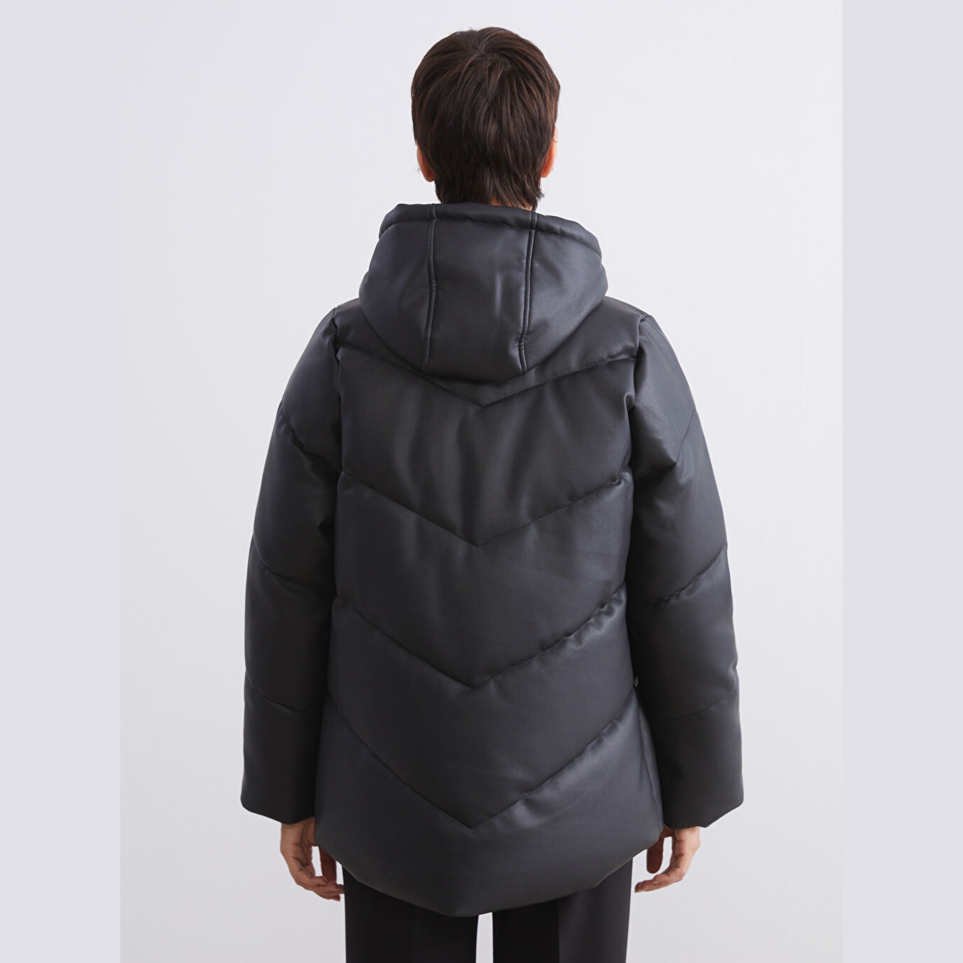 جاكيت شتوي بلون أسود من مجموعة LCW Vision، تصميم بقبعة ثابتة للحماية من الرياح، قصة واسعة (Loose & Bol) تمنحك راحة وأناقة، خامة خارجية بملمس جلد صناعي أنيق (طبقة من %100 بولي يوريثان على أرضية من %100 بوليستر)، مبطّنة بالكامل بـ%100 بوليستر، مع حشوة داخلية من %100 بوليستر، بطول ميدي يُقاس من الكتف، مزود بسحاب أمامي عملي، مثالي للإطلالات اليومية أو الرسمية في الطقس البارد بأسلوب أنيق وفاخر.
