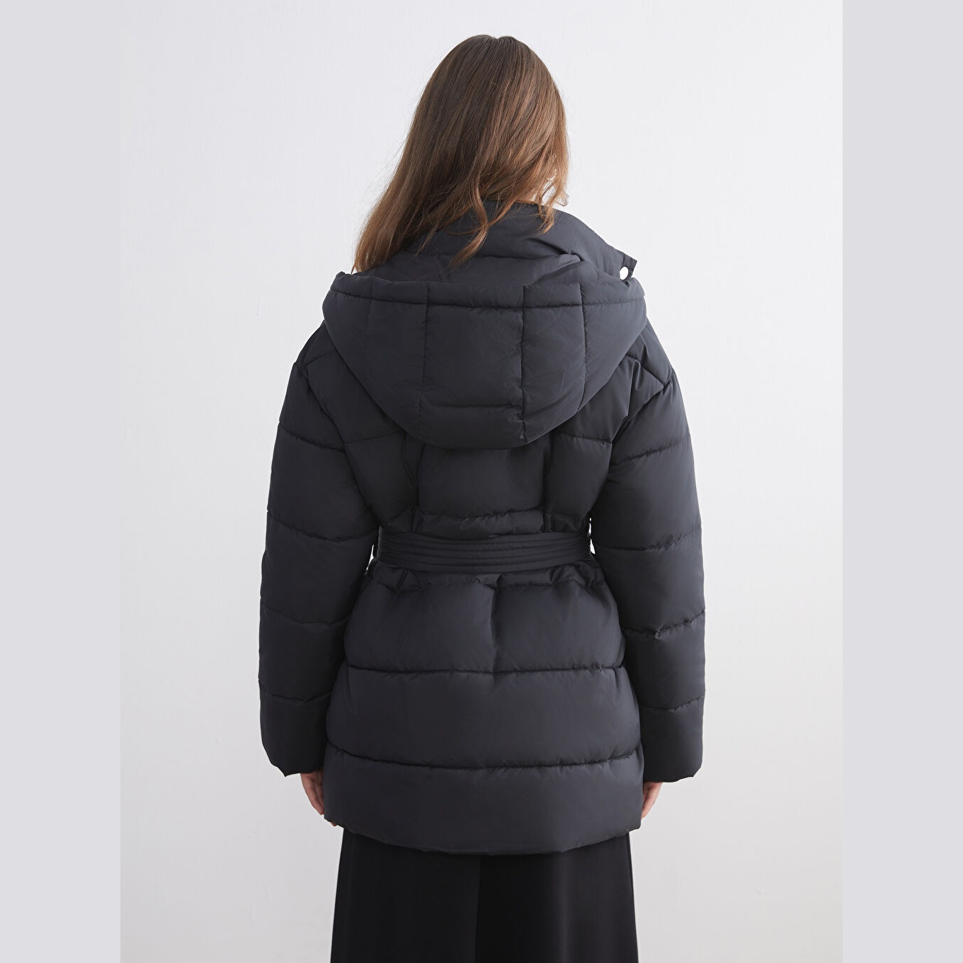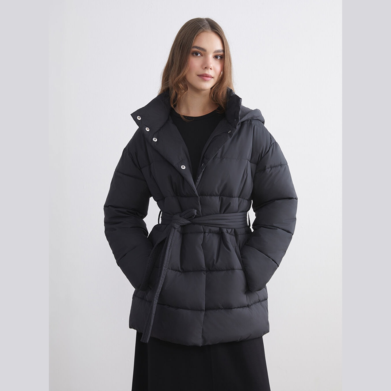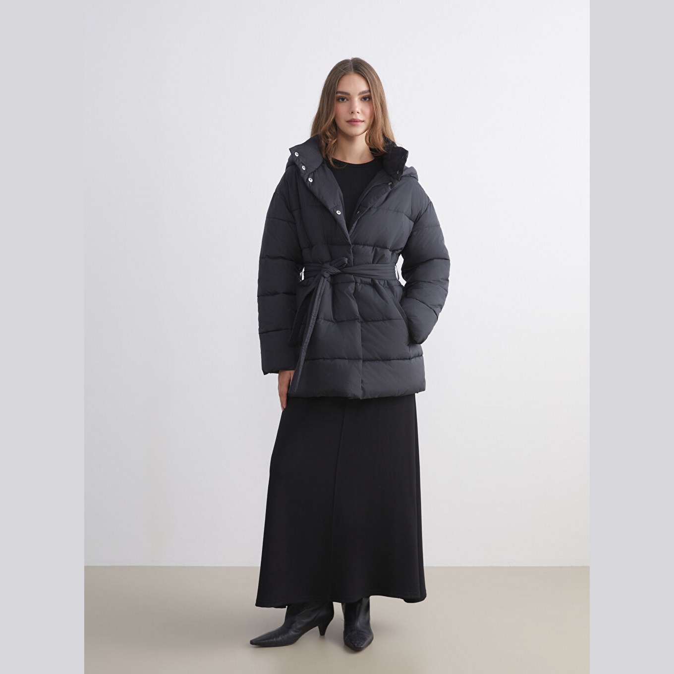 جاكيت نسائي شتوي من LCW Modest – أسود (قصة واسعة، تصميم ميدي، خامة بوليستر كابيتوني، قبعة ثابتة، حزام خصر، سحاب أمامي، مثالي للإطلالات المحتشمة بأسلوب أنيق ومحدد)