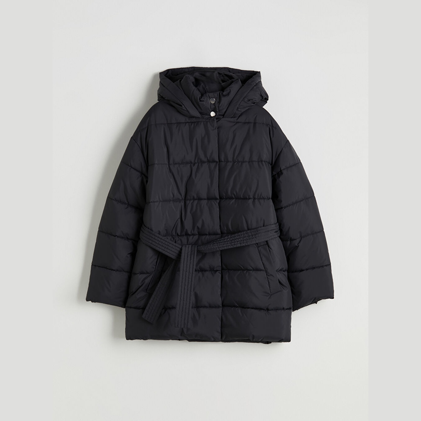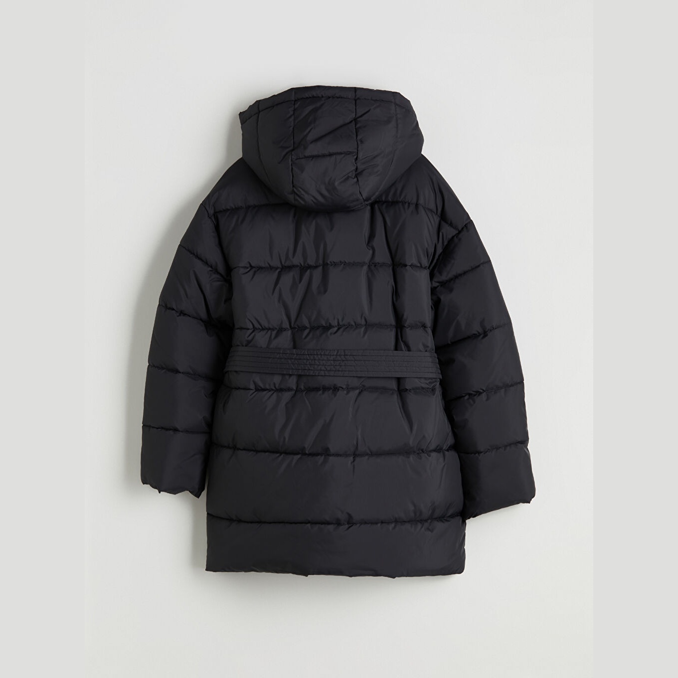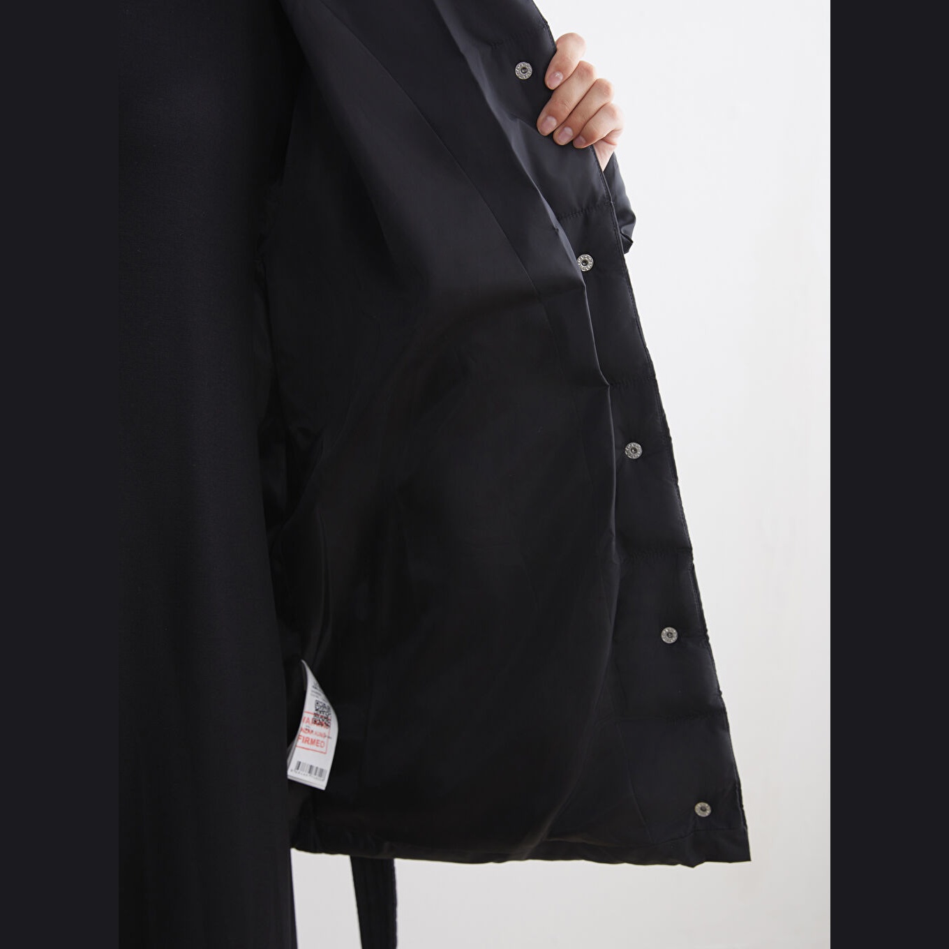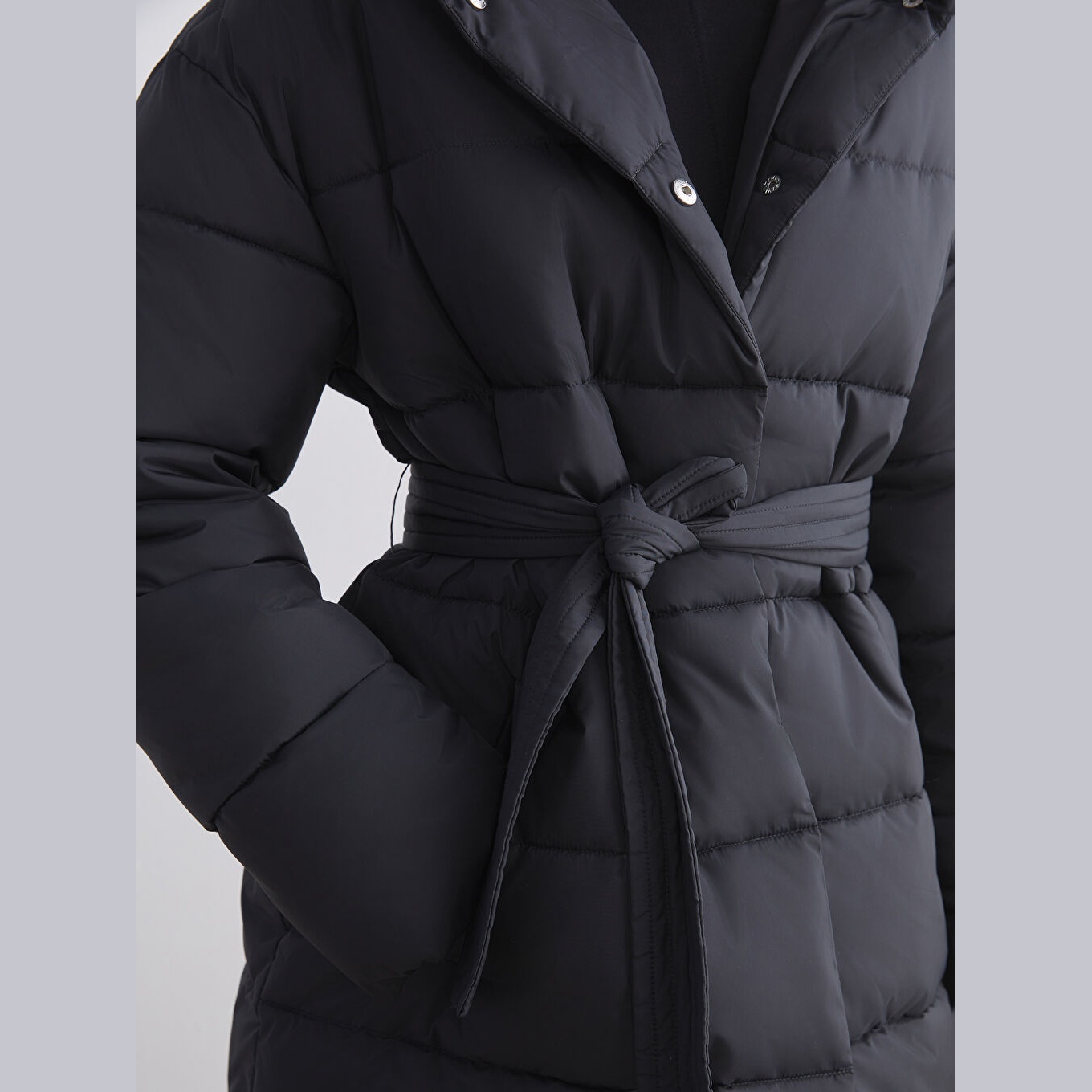 جاكيت نسائي شتوي من LCW Modest – أسود (قصة واسعة، تصميم ميدي، خامة بوليستر كابيتوني، قبعة ثابتة، حزام خصر، سحاب أمامي، مثالي للإطلالات المحتشمة بأسلوب أنيق ومحدد)