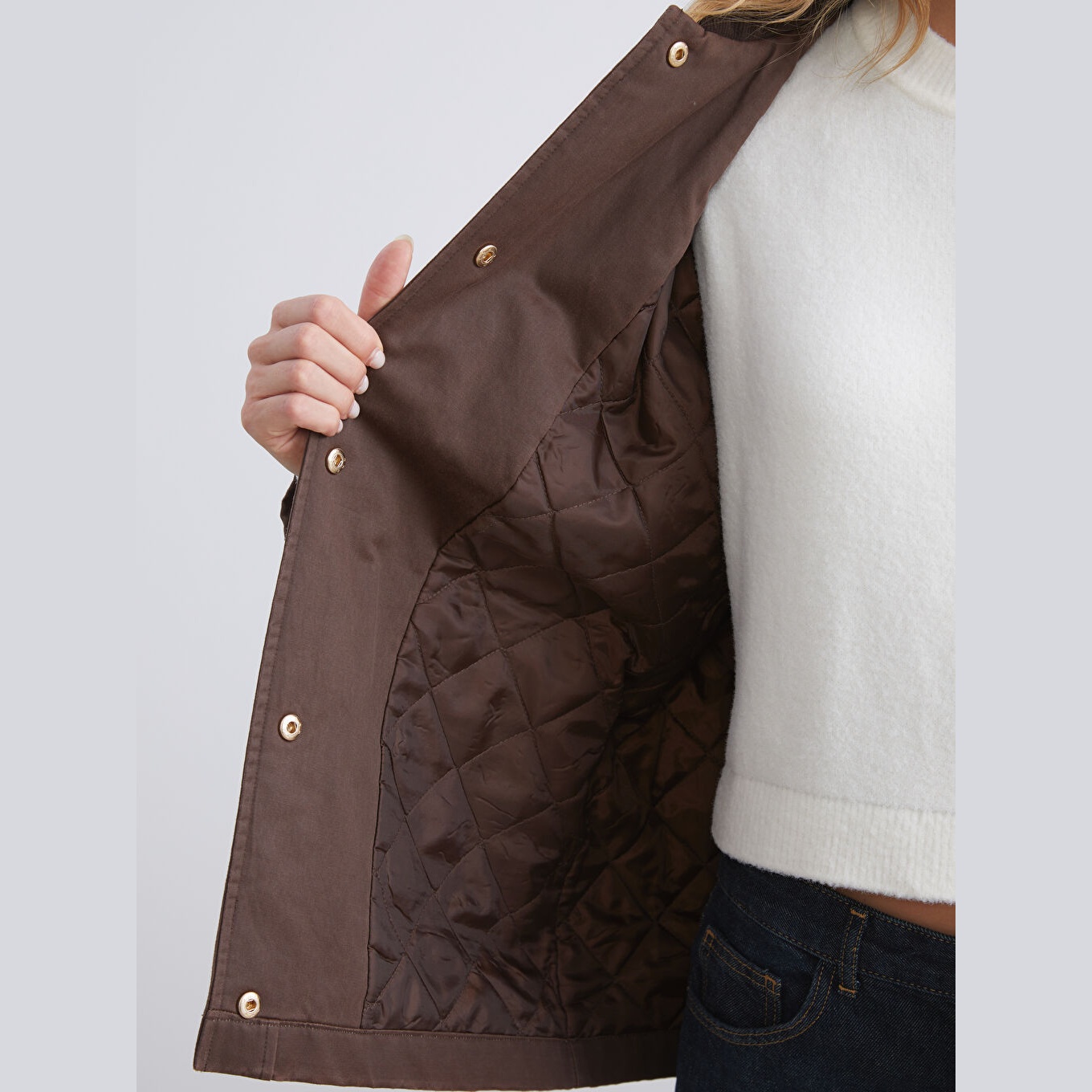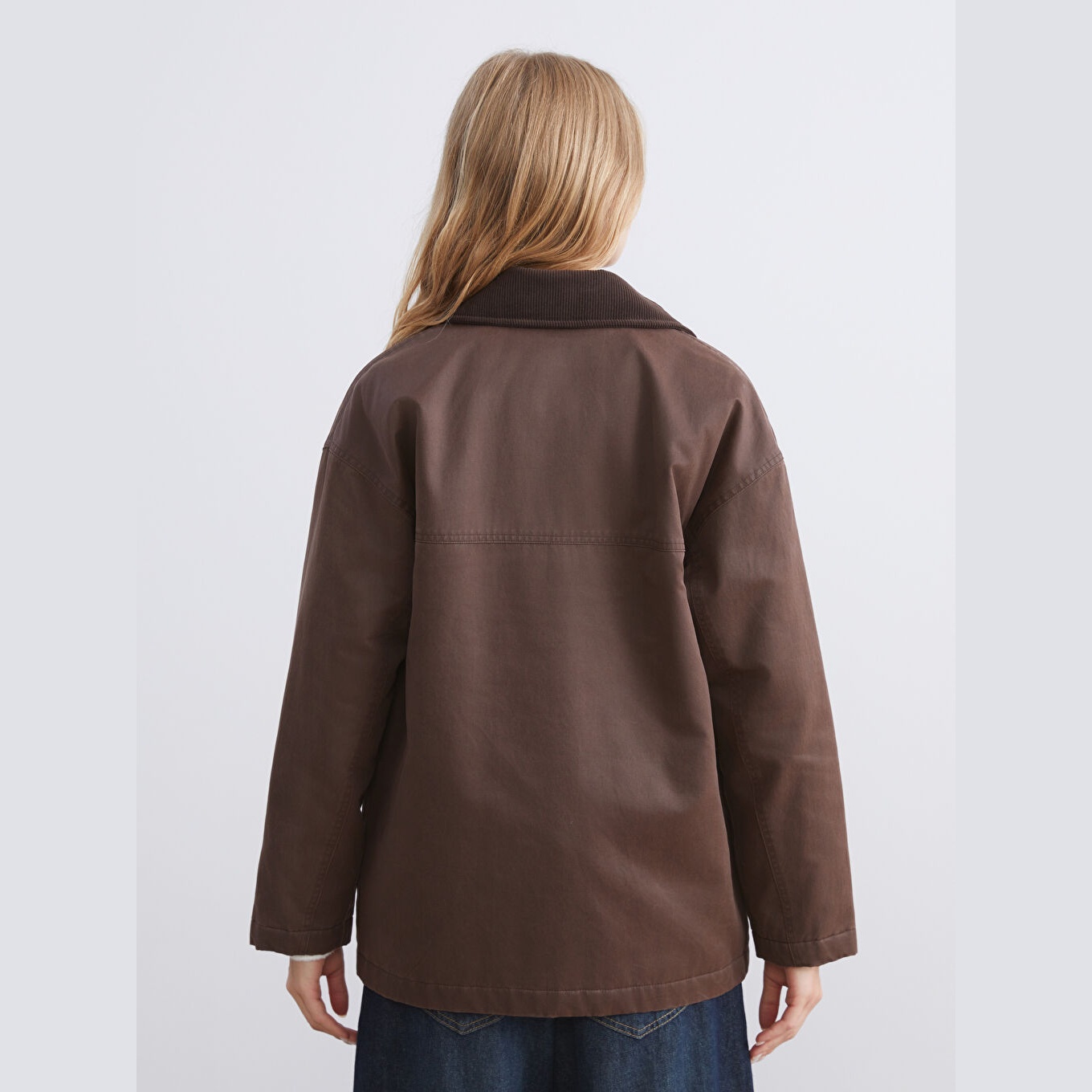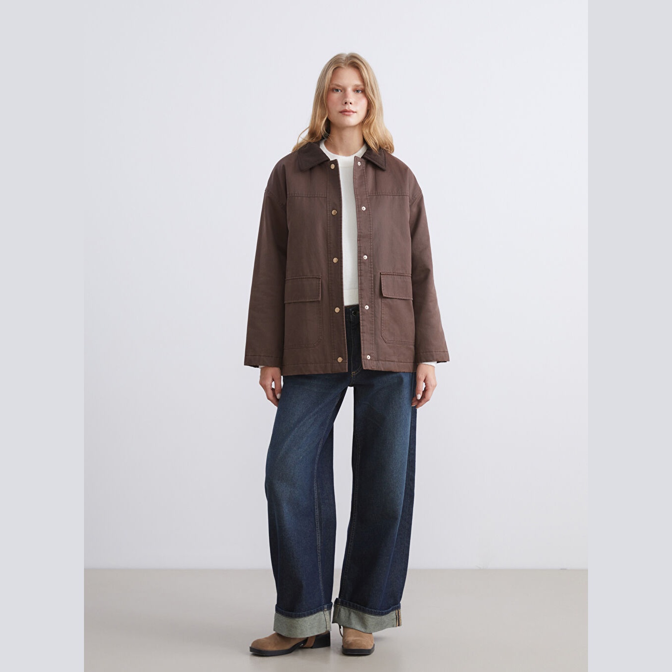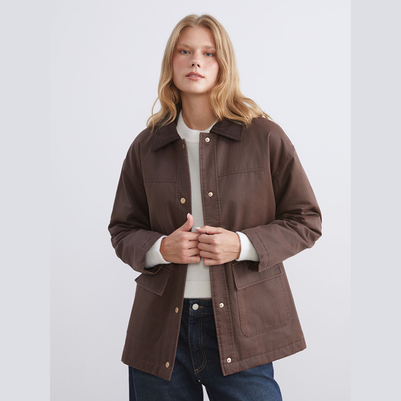 جاكيت شتوي بلون بني من مجموعة LCW Vision، تصميم بياقة قميص (Gömlek Yaka) تضيف لمسة كلاسيكية أنيقة، قصة واسعة (Loose & Bol) توفر راحة وانسيابية، خامة خارجية مكوّنة من %66 قطن و%34 بوليستر، مع تفاصيل إضافية من قماش %100 بوليستر، مبطّن بالكامل بـ%100 بوليستر، مع حشوة داخلية من %100 بوليستر، بطول ميدي يُقاس من الكتف، بدون قبعة، مزود بسحاب أمامي عملي، مثالي للإطلالات اليومية أو الرسمية في الطقس البارد بأسلوب محتشم وفاخر.