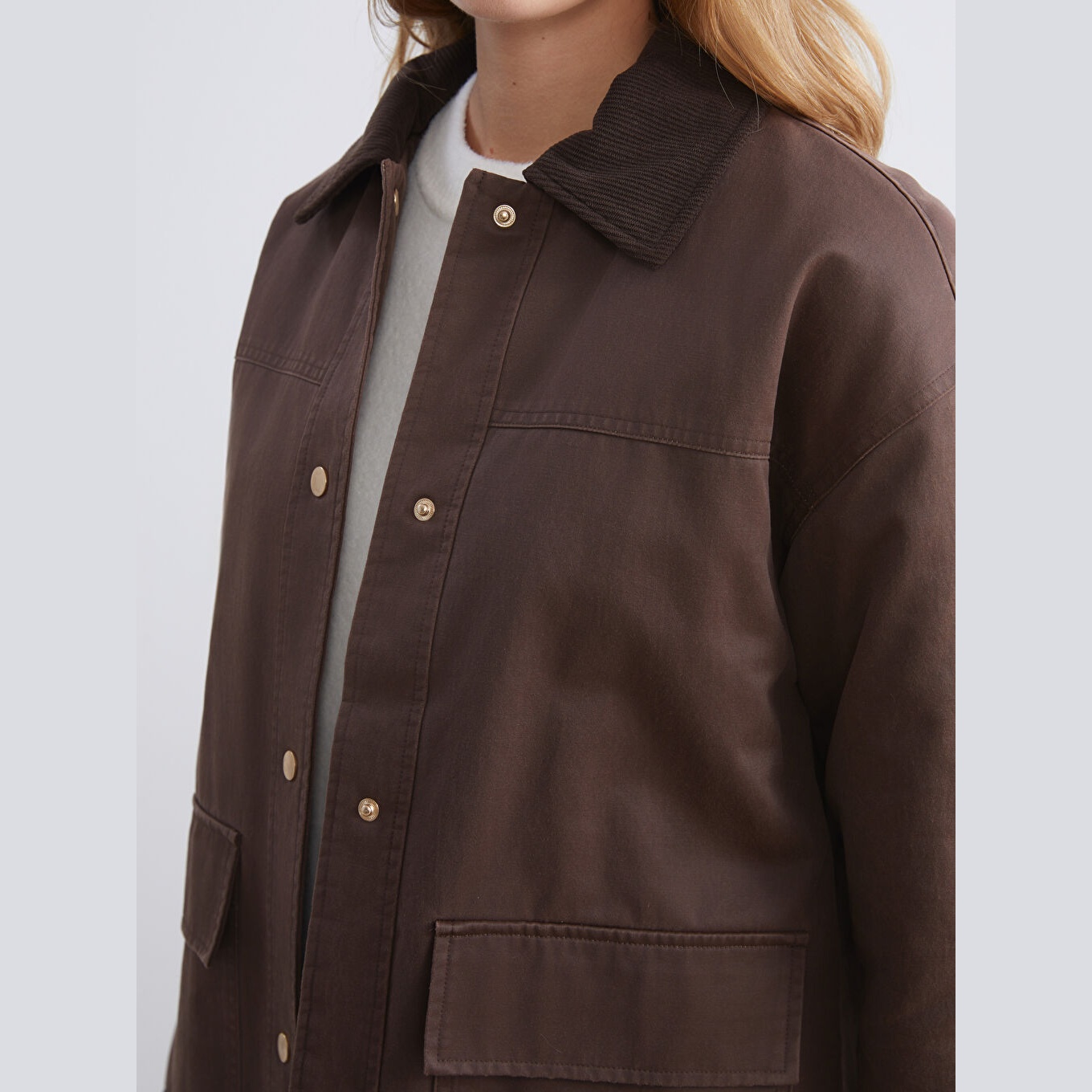 جاكيت نسائي شتوي من LCW Vision – بني (قصة واسعة، تصميم ميدي، خامة قطنية بمظهر فاخر، ياقة قميص، بدون قبعة، سحاب أمامي، مثالي للإطلالات الشتوية الكلاسيكية والأنيقة)