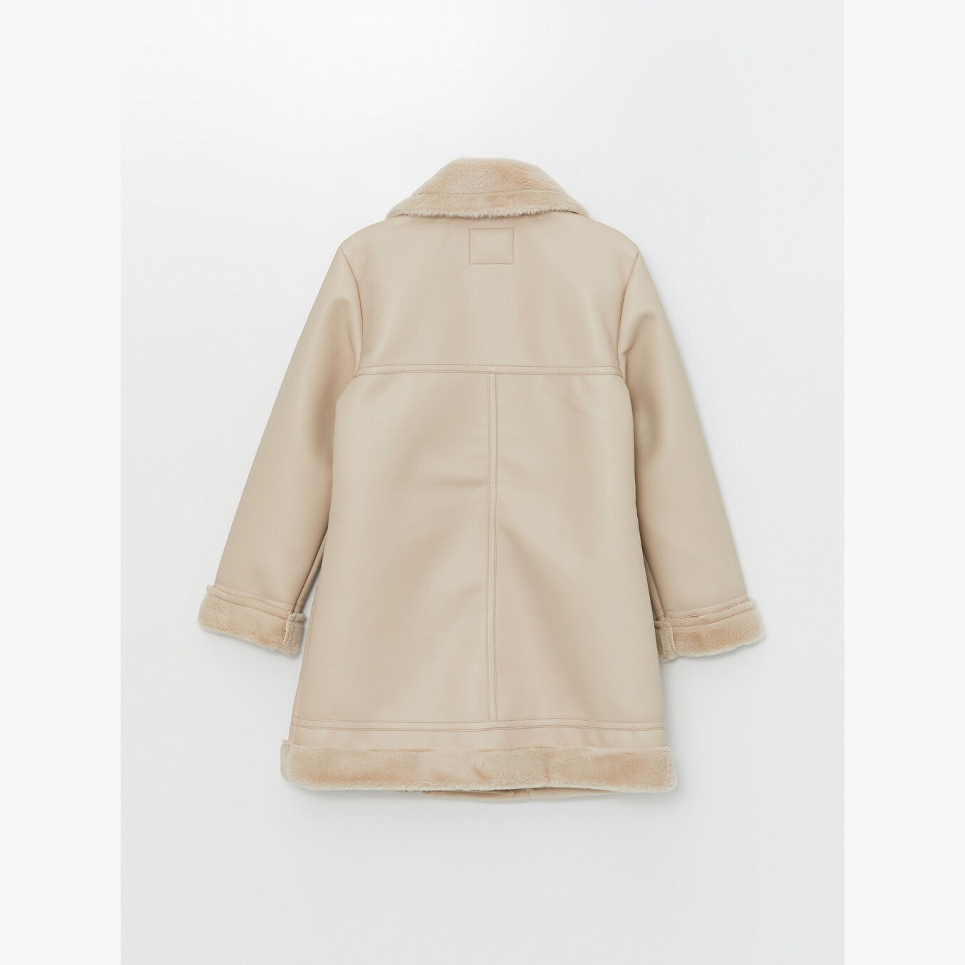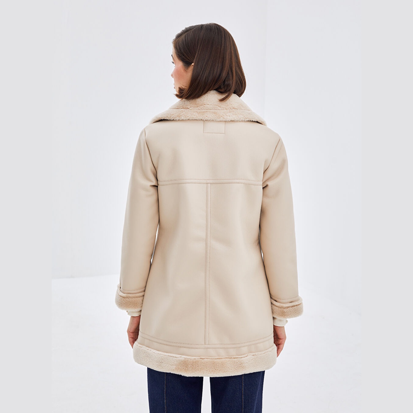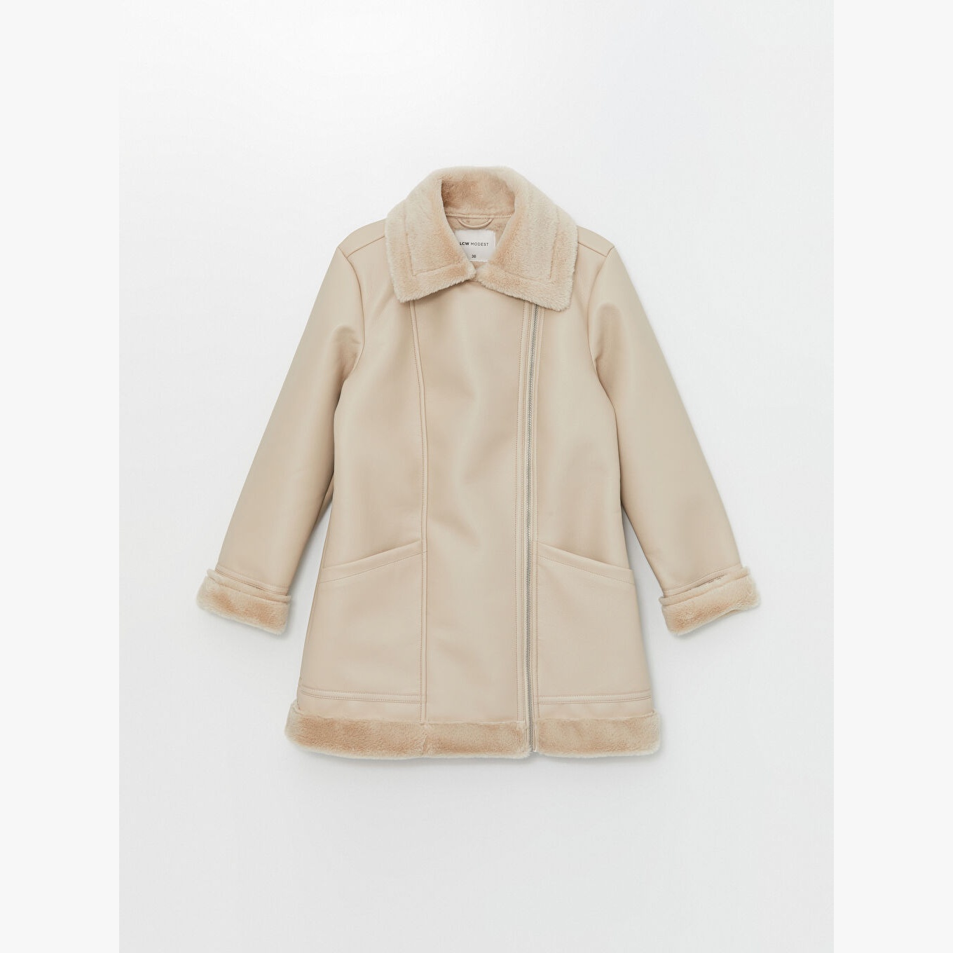 جاكيت نسائي بستايل Biker من LCW Modest – بيج (خامة جلد صناعي، ياقة بايكر، تصميم ميدي، بدون قبعة، بطانة فرو، قصة واسعة، مثالي للإطلالات العصرية المحتشمة)