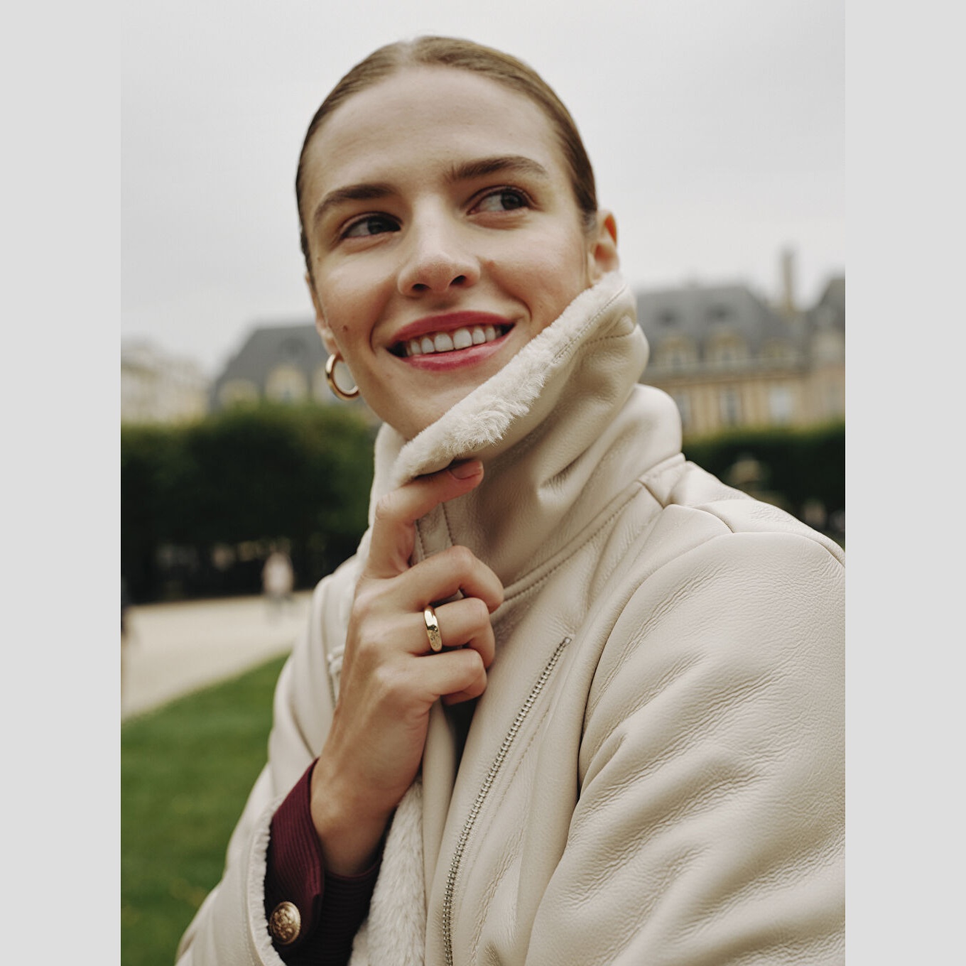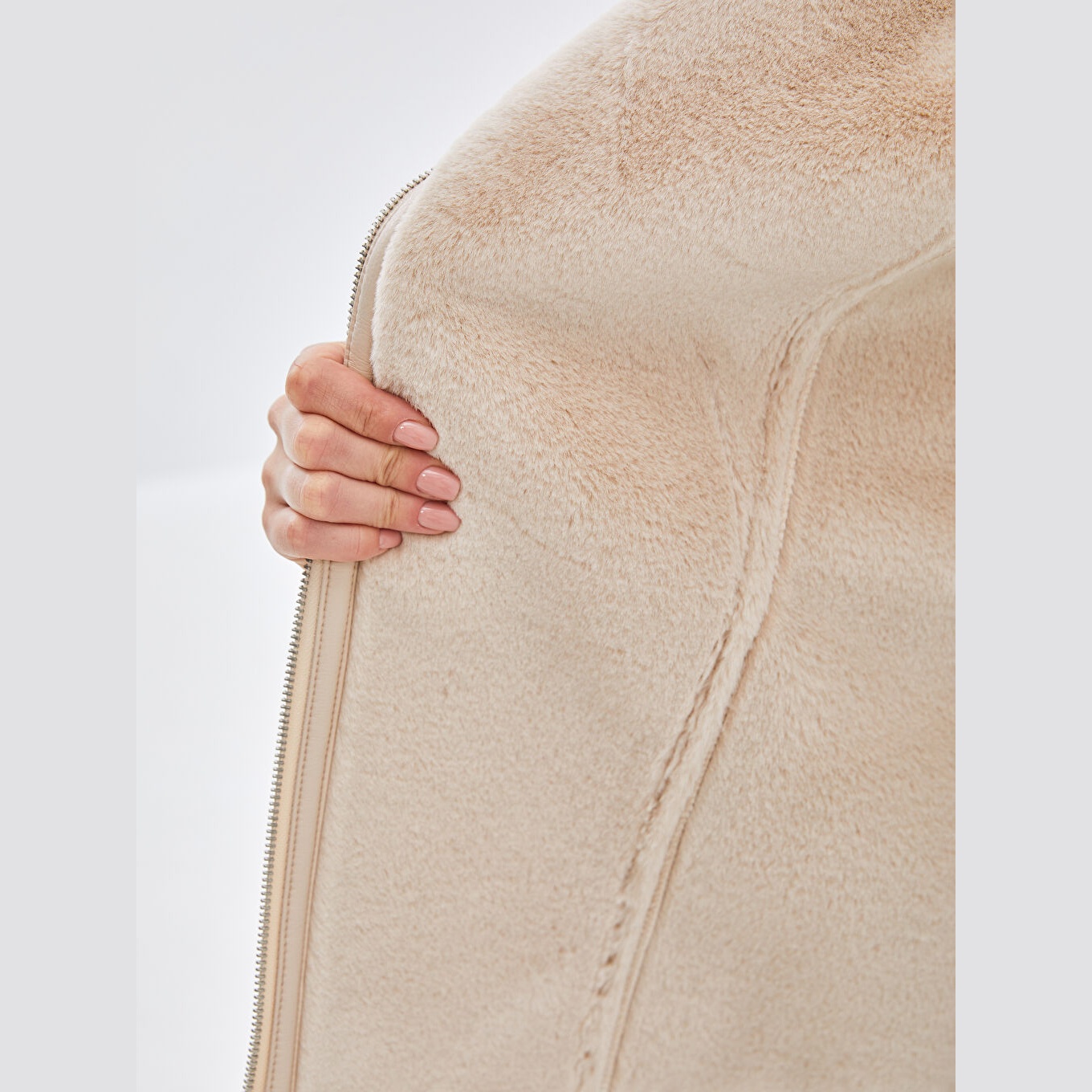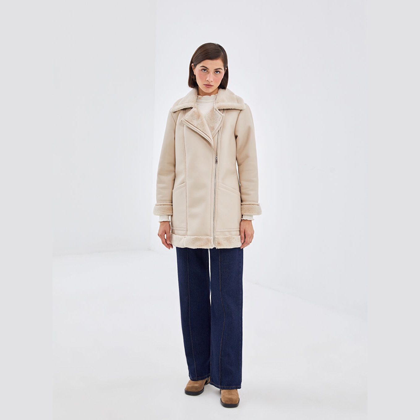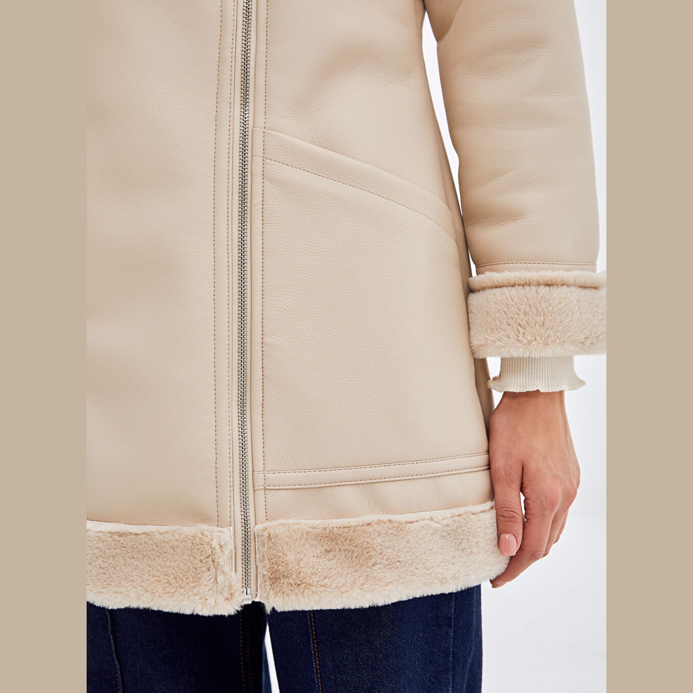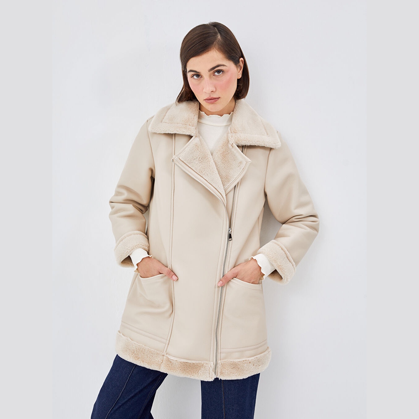 جاكيت شتوي بلون بيج من مجموعة LCW Modest، تصميم بياقة بايكر (Biker Yaka) تضيف لمسة جريئة وعصرية، قصة واسعة (Loose & Bol) تمنحك راحة وأناقة، خامة خارجية بمظهر الجلد الصناعي مكوّنة من طبقة علوية %100 بولي يوريثان وقاعدة من %100 بوليستر، مبطّن بالكامل بـ%100 بوليستر، مع بطانة داخلية من الفرو الصناعي، بطول ميدي يُقاس من الكتف، بدون قبعة، مزود بسحاب أمامي عملي، مثالي للإطلالات اليومية أو الرسمية بأسلوب محتشم وفاخر.