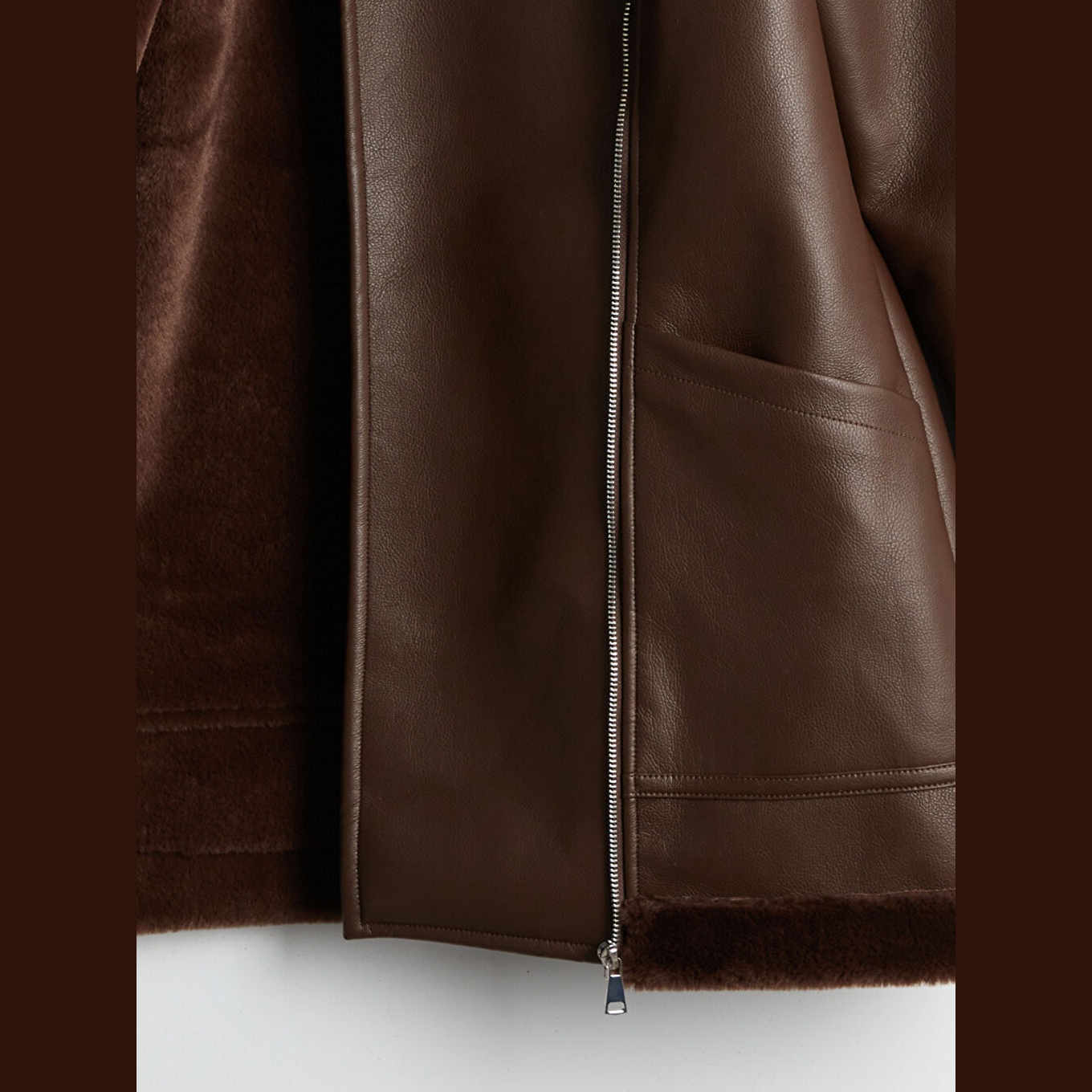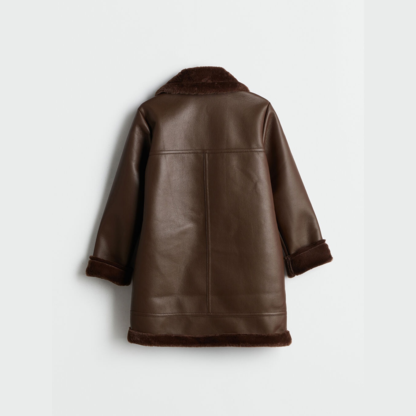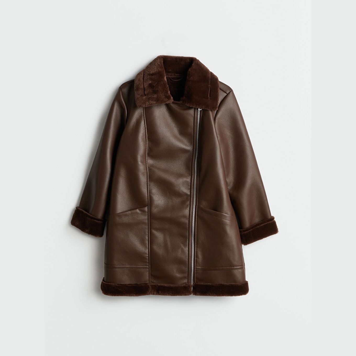 جاكيت شتوي بلون بني من مجموعة LCW Modest، تصميم بياقة بايكر (Biker Yaka) تضيف لمسة جريئة وعصرية، قصة واسعة (Loose & Bol) تمنحك راحة وأناقة، خامة خارجية بمظهر الجلد الصناعي مكوّنة من طبقة علوية %100 بولي يوريثان وقاعدة من %100 بوليستر، مبطّن بالكامل بـ%100 بوليستر، مع بطانة داخلية من الفرو الصناعي، بطول ميدي يُقاس من الكتف، بدون قبعة، مزود بسحاب أمامي عملي، مثالي للإطلالات اليومية أو الرسمية بأسلوب محتشم وفاخر.