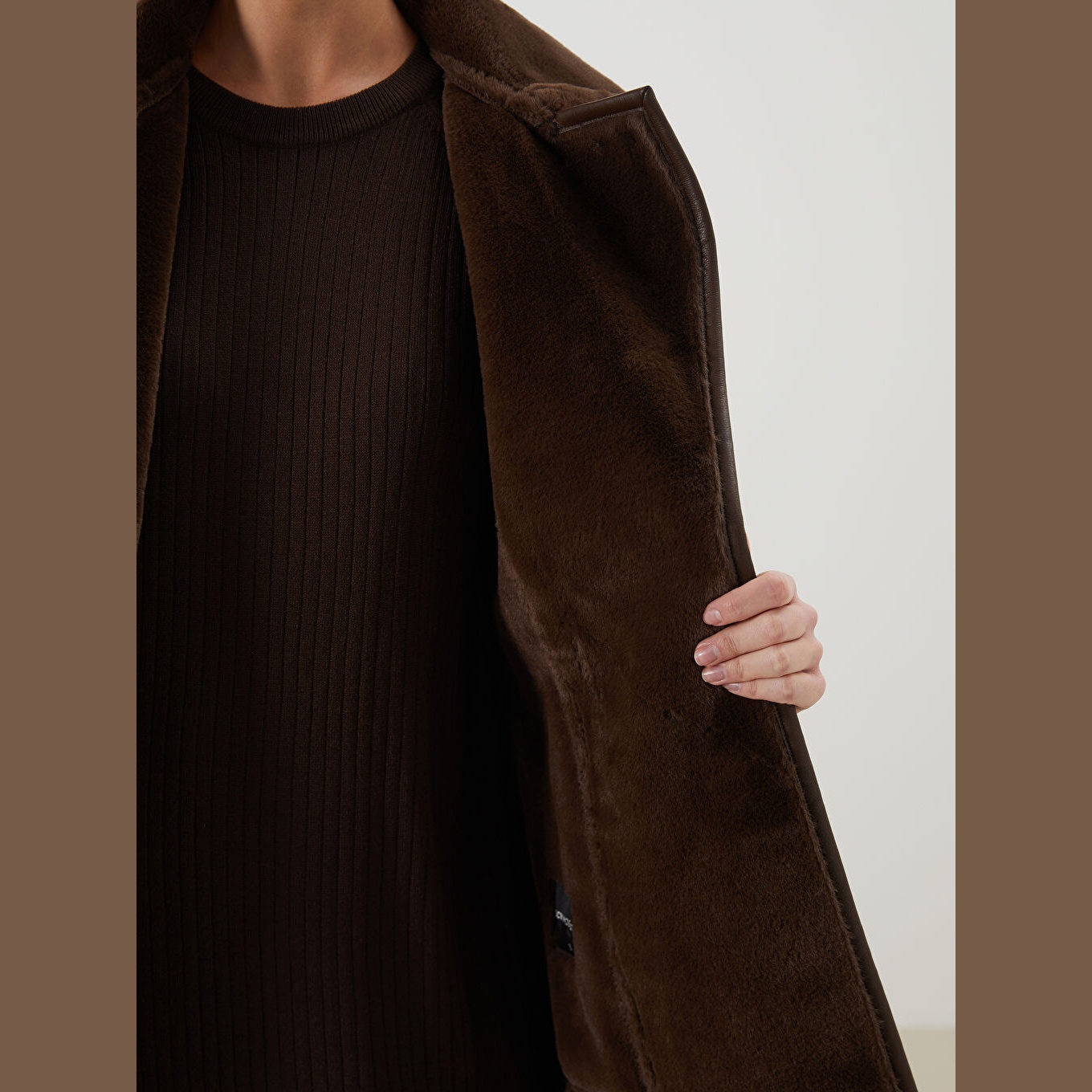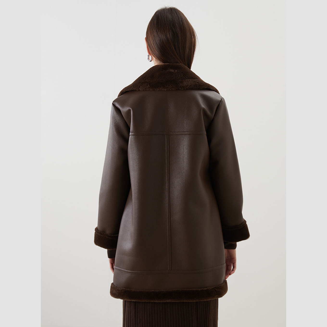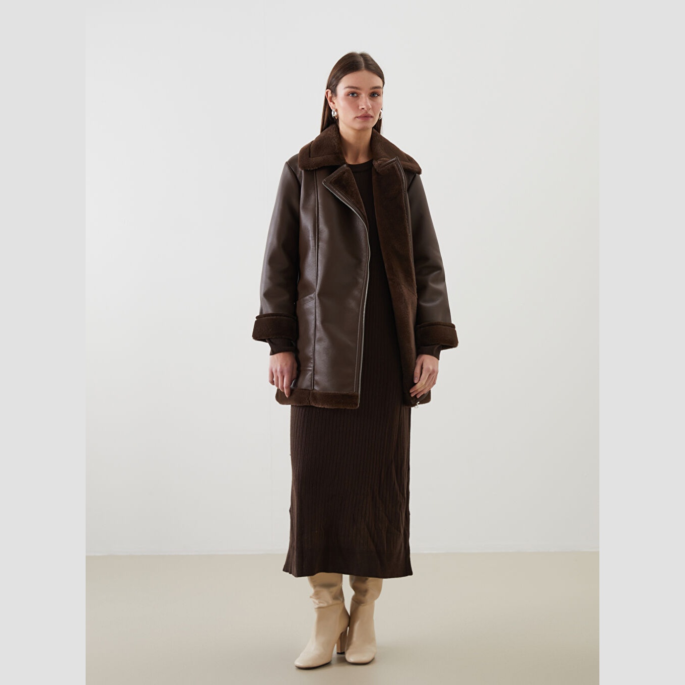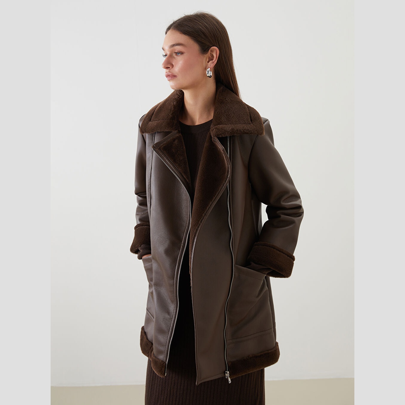 جاكيت نسائي بستايل Biker من LCW Modest – بني (خامة جلد صناعي، ياقة بايكر، بطانة فرو، تصميم ميدي، بدون قبعة، قصة واسعة، مثالي للإطلالات الشتوية المحتشمة والعصرية)