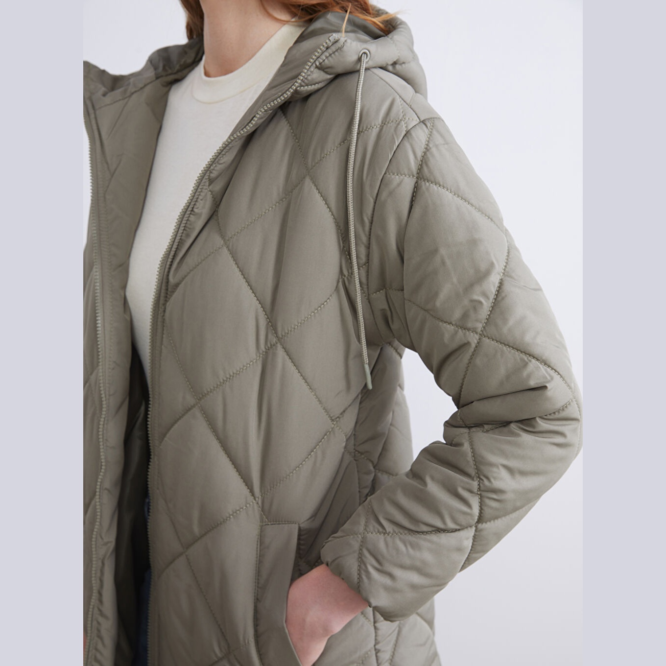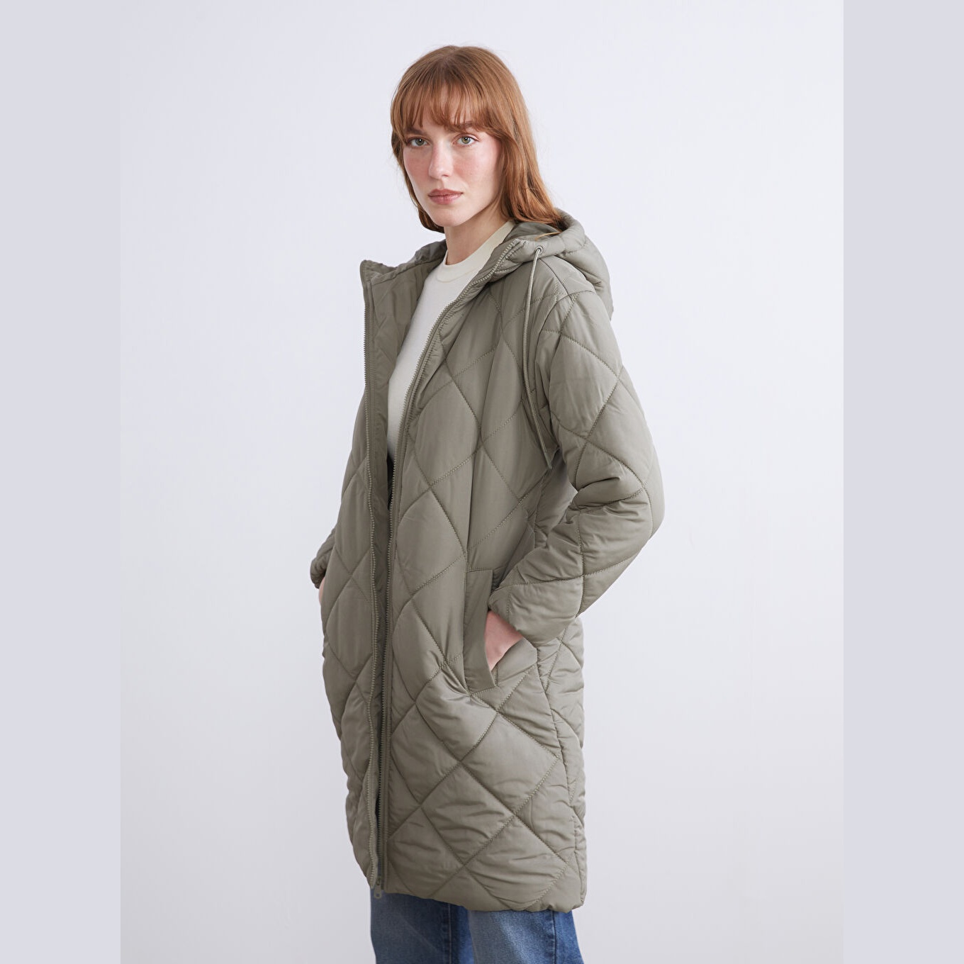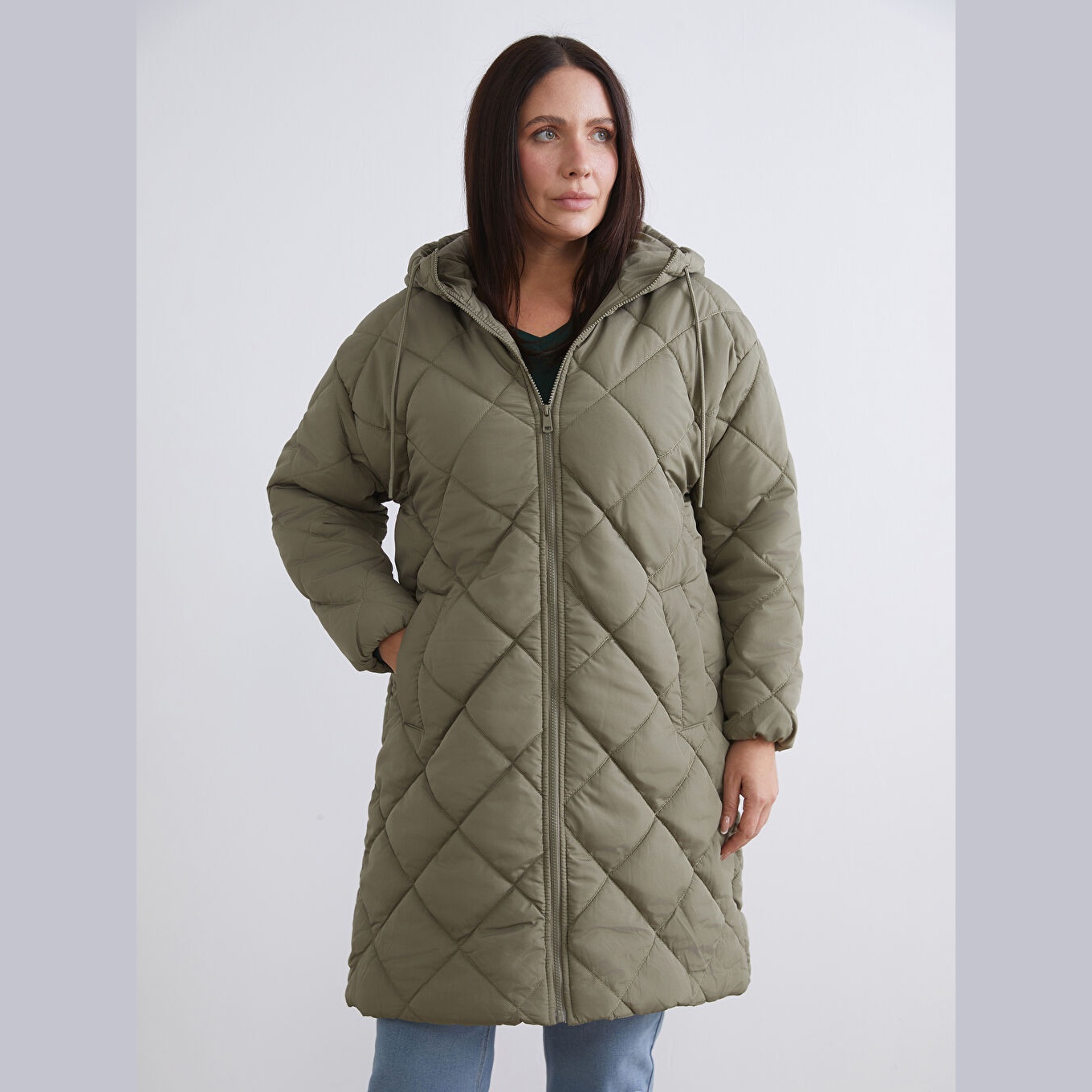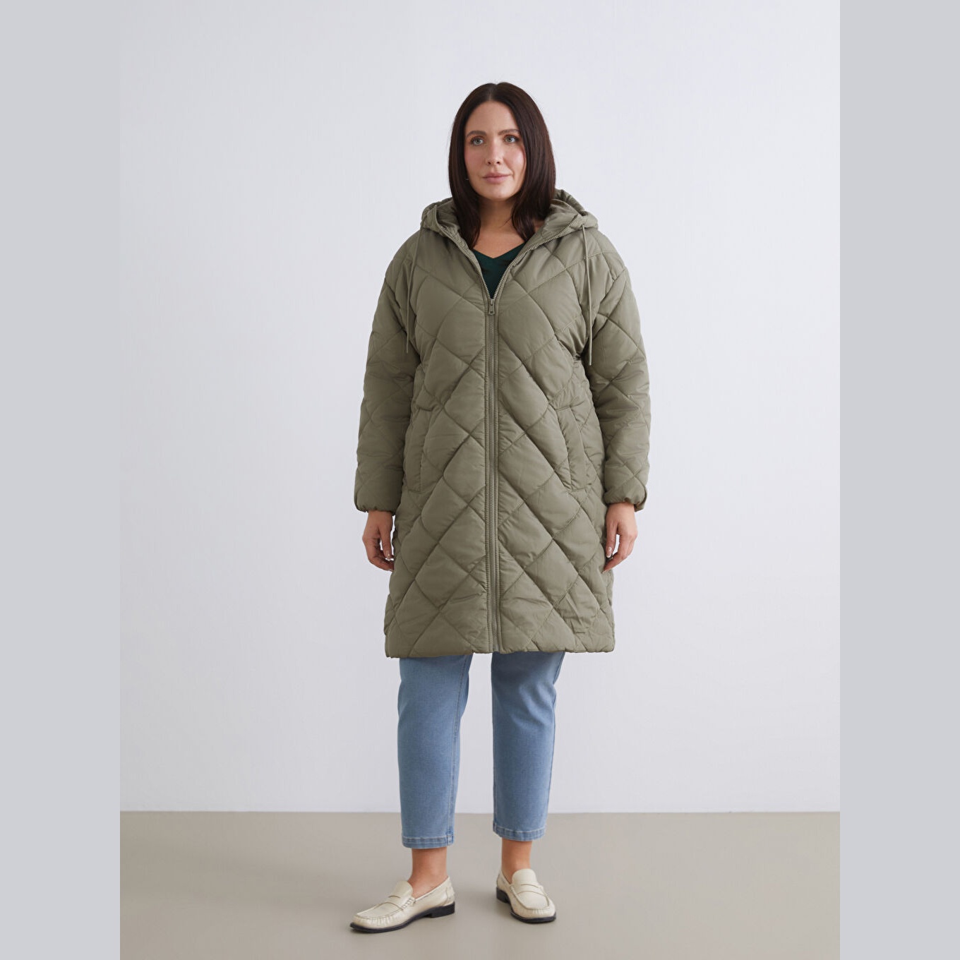 جاكيت نسائي شتوي كابيتوني من LCWAIKIKI Classic – زيتي (قصة قياسية، تصميم طويل، خامة بوليستر، قبعة ثابتة، تطريز كابيتوني، سحاب أمامي، مثالي للإطلالات الشتوية المحتشمة ضمن مجموعة المقاسات الكبيرة)