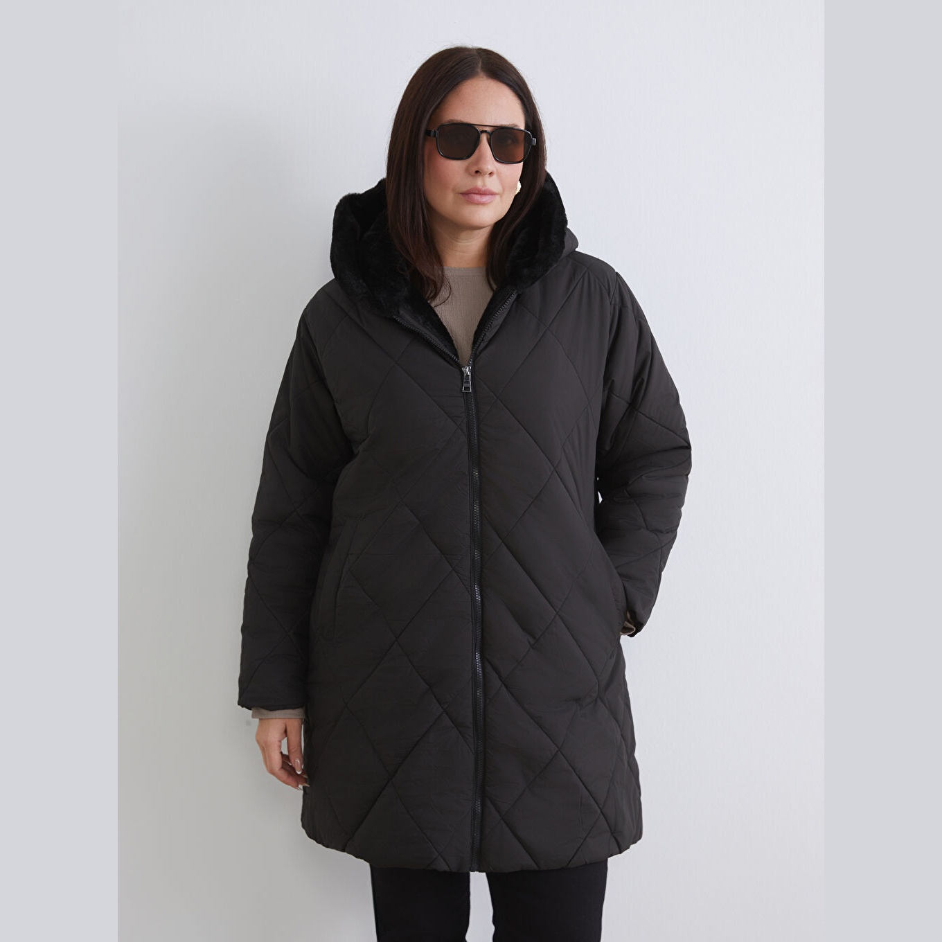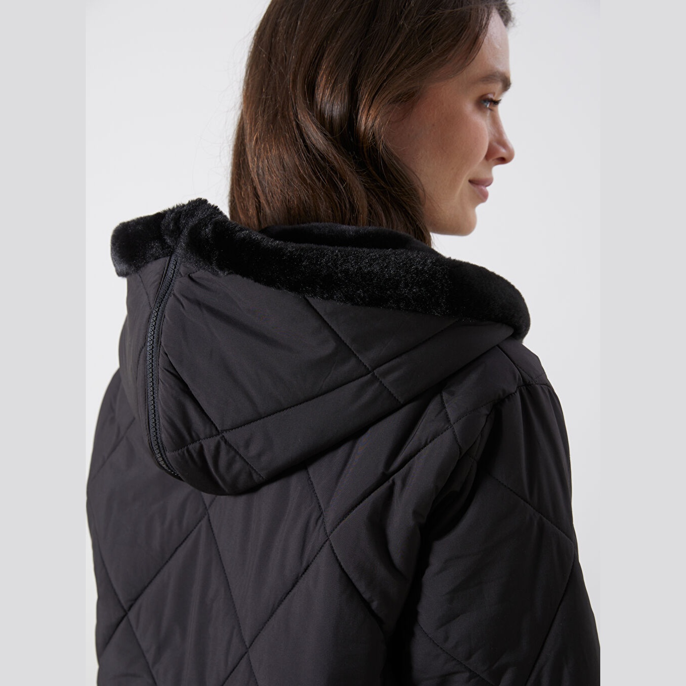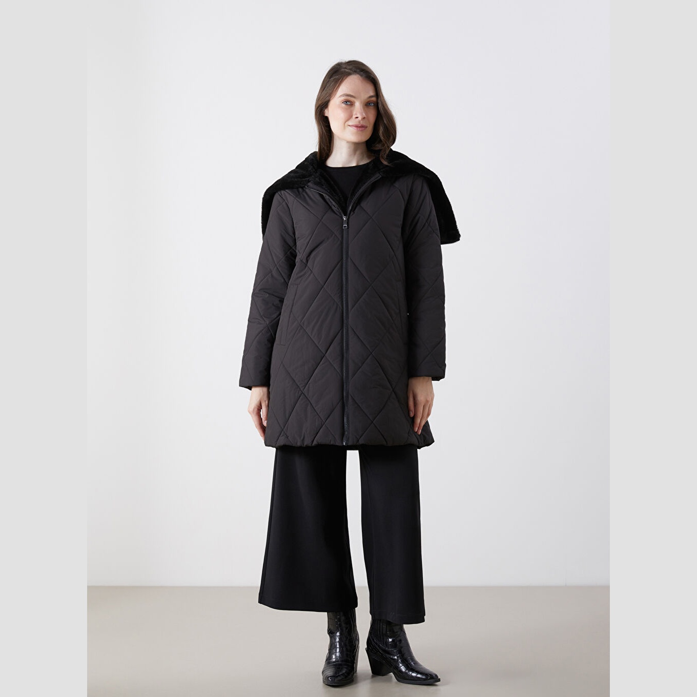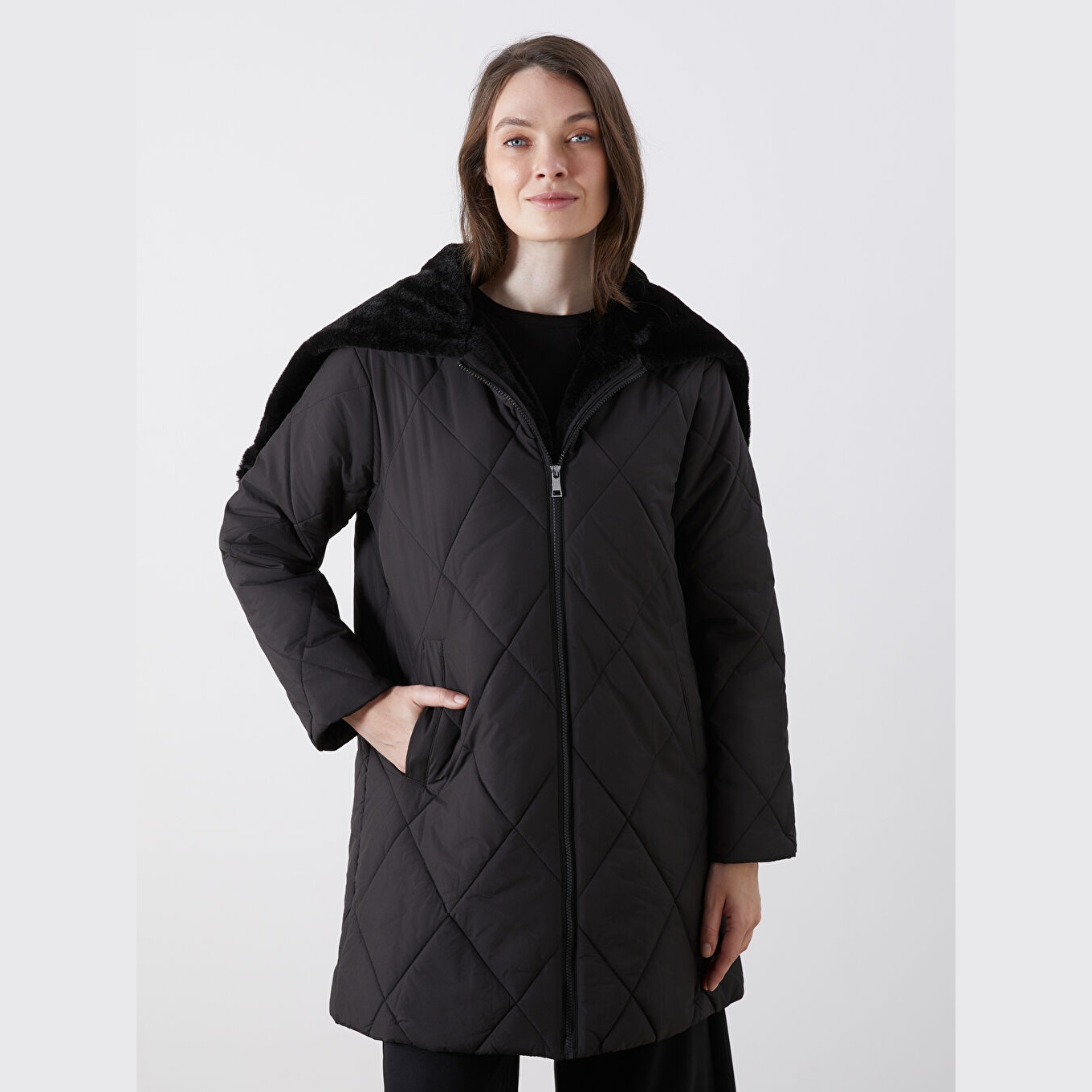 جاكيت نسائي شتوي من LCW Grace – أسود (قصة واسعة، تصميم ميدي، خامة بوليستر، قبعة ثابتة، نقشة باكلافا، سحاب أمامي، مثالي للإطلالات الشتوية المحتشمة ضمن مجموعة المقاسات الكبيرة)