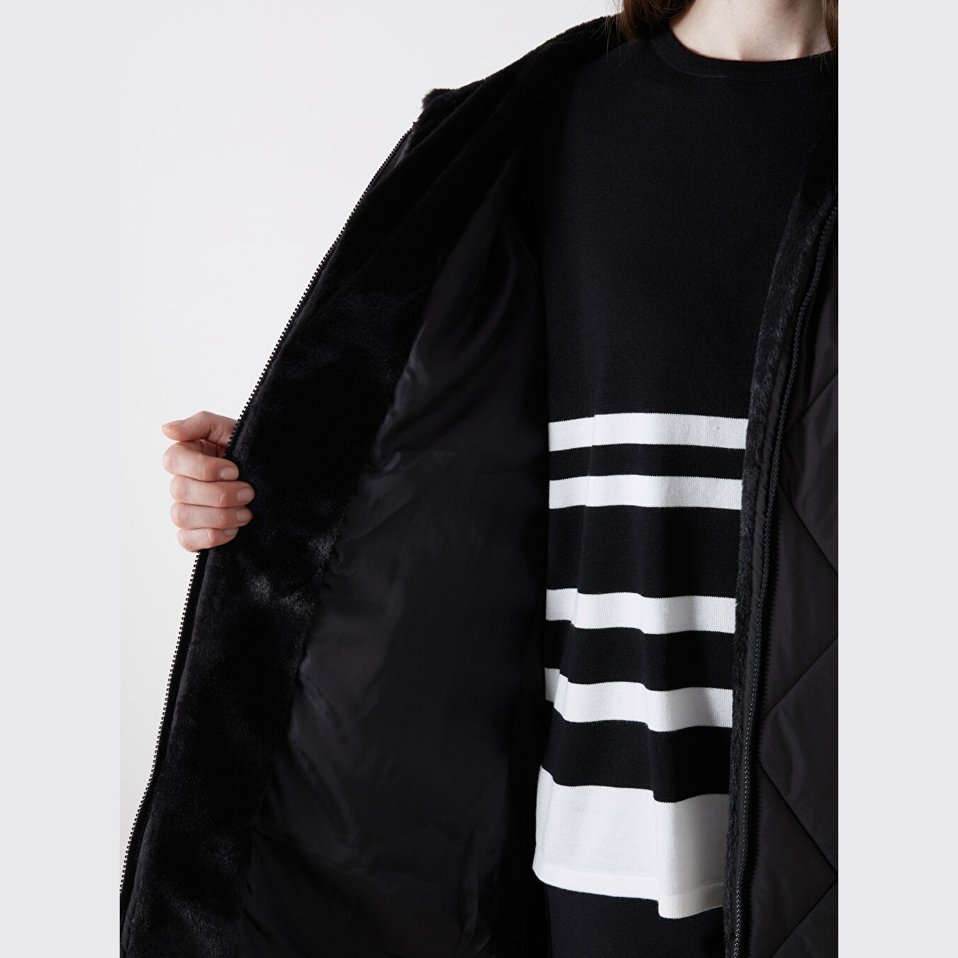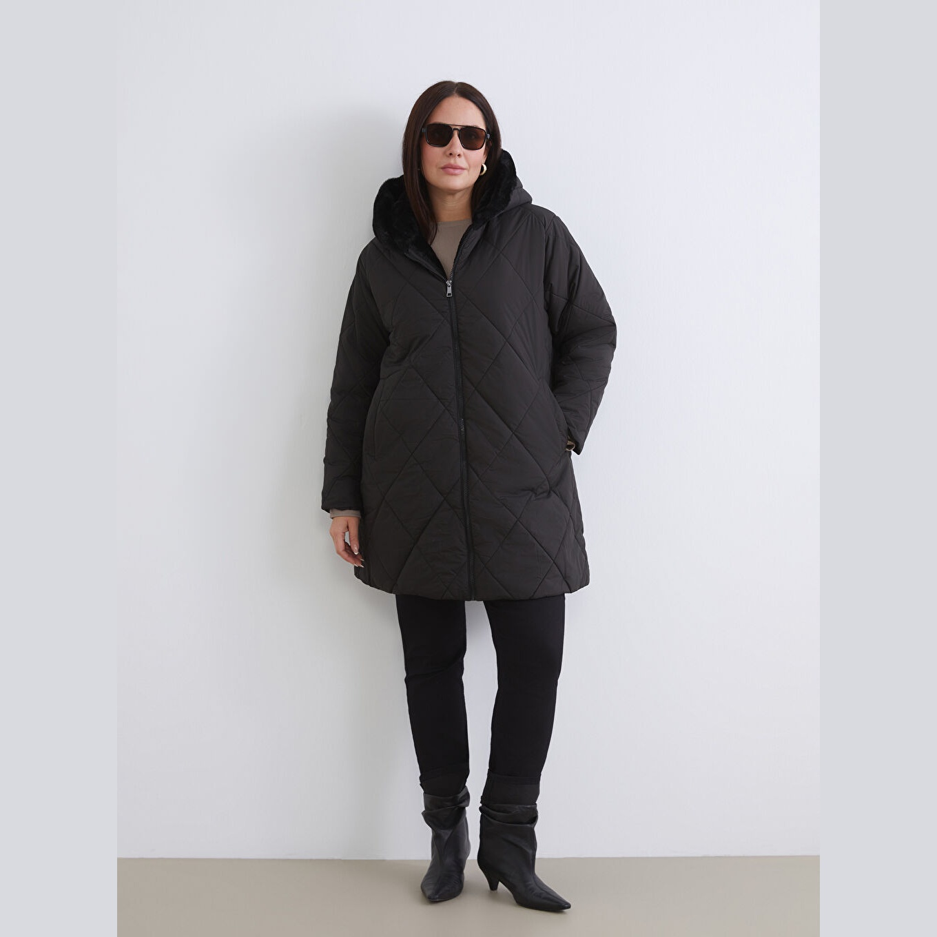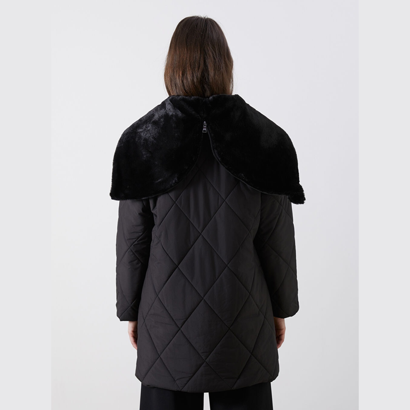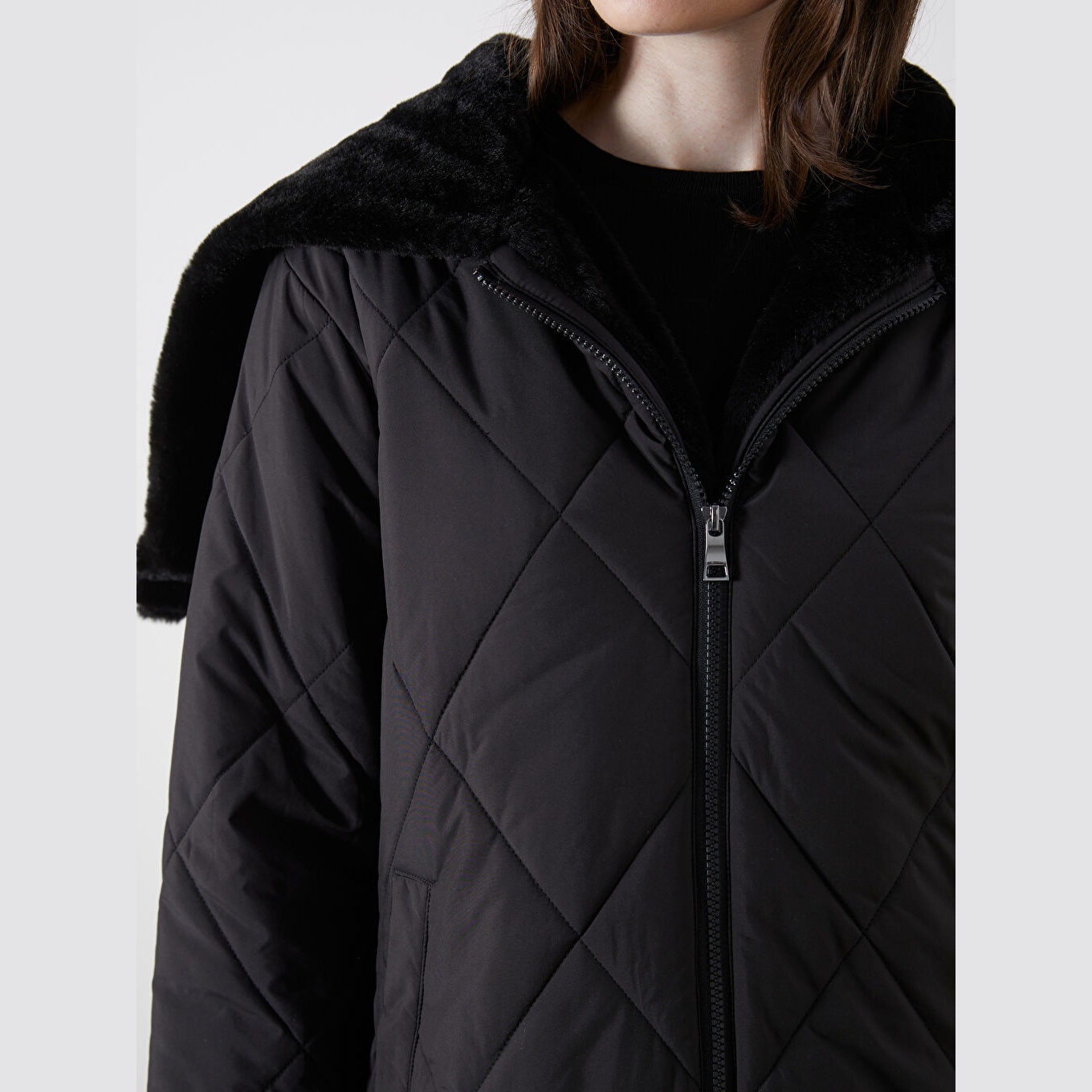جاكيت نسائي شتوي من LCW Grace – أسود (قصة واسعة، تصميم ميدي، خامة بوليستر، قبعة ثابتة، نقشة باكلافا، سحاب أمامي، مثالي للإطلالات الشتوية المحتشمة ضمن مجموعة المقاسات الكبيرة)