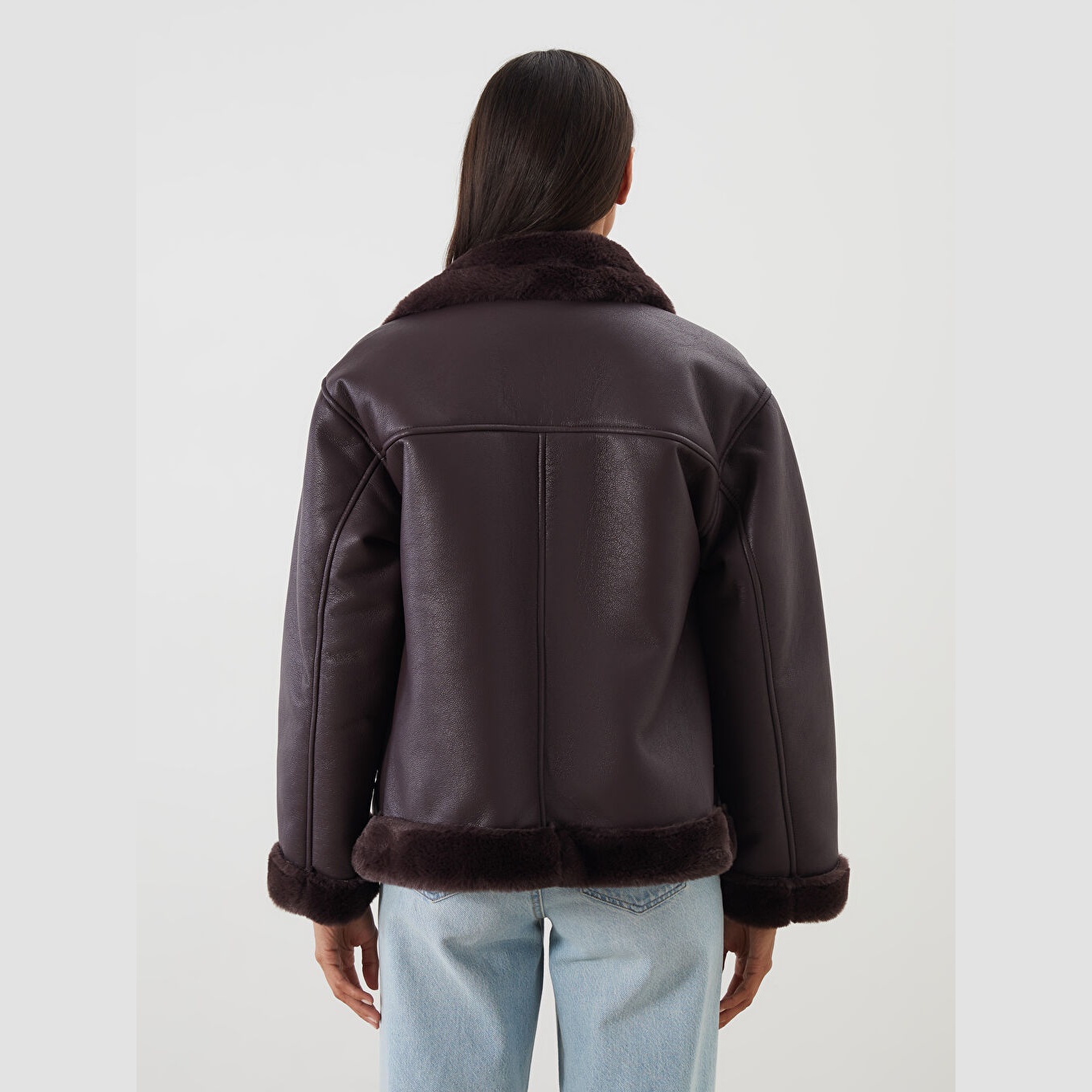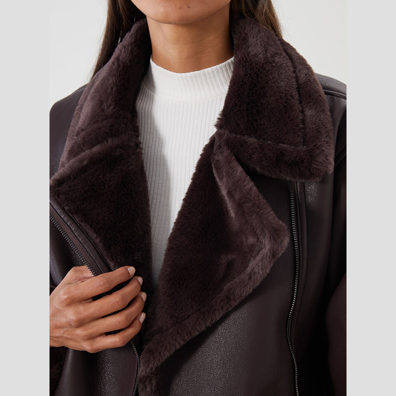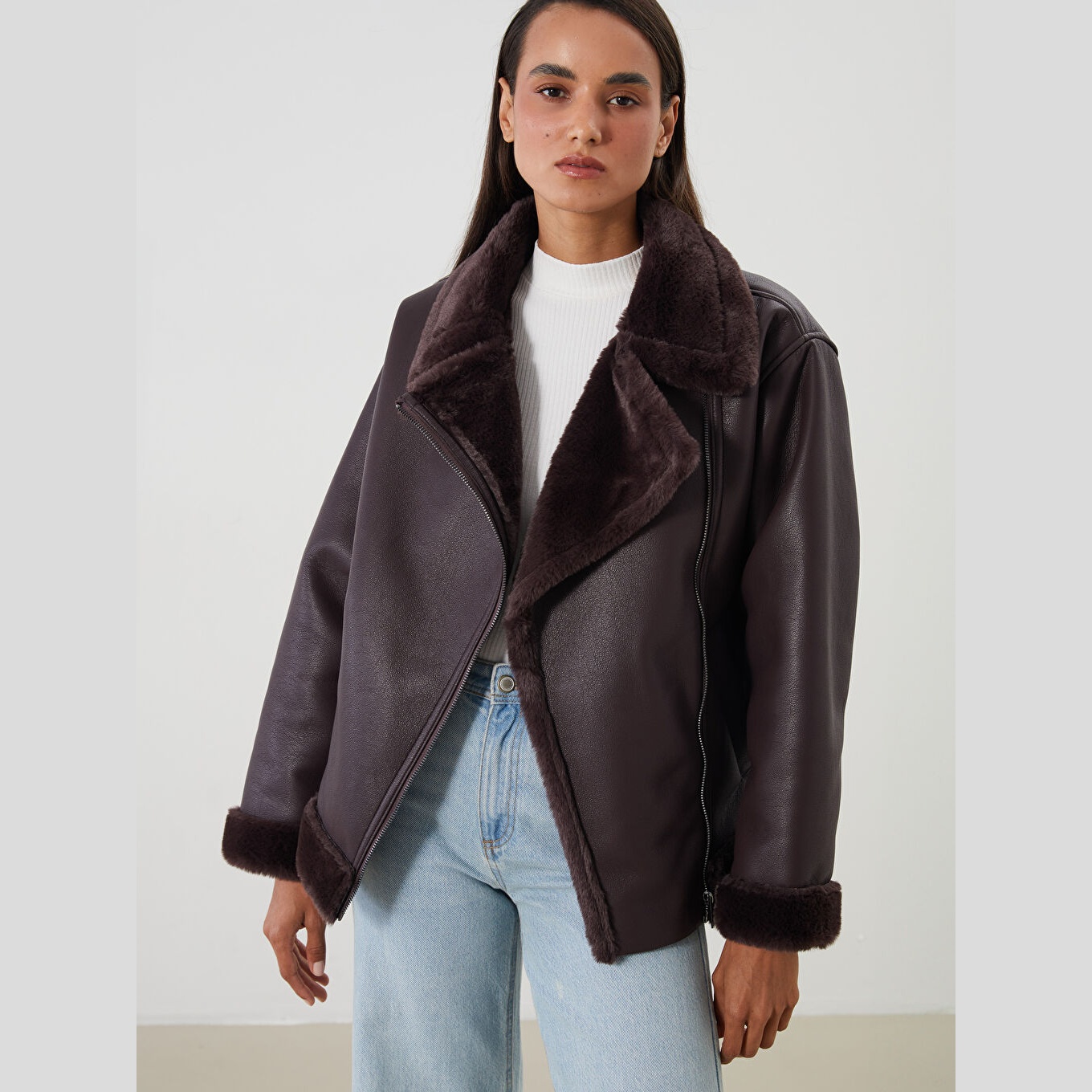 جاكيت نسائي شتوي من LCWAIKIKI Classic – بني (خامة جلد صناعي، ياقة بايكر مبطنة بالفرو، تصميم ميدي، قصة واسعة، مثالي للإطلالات الشتوية الجريئة ضمن مجموعة المقاسات الكبيرة)