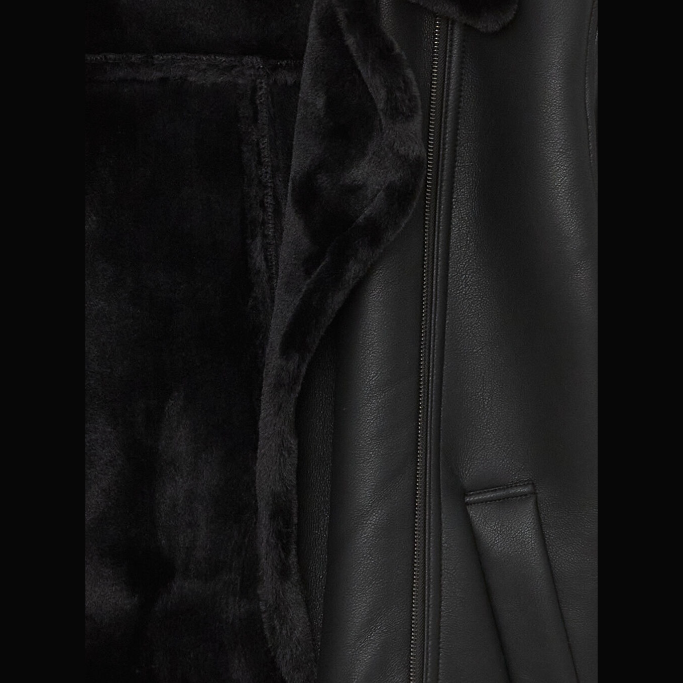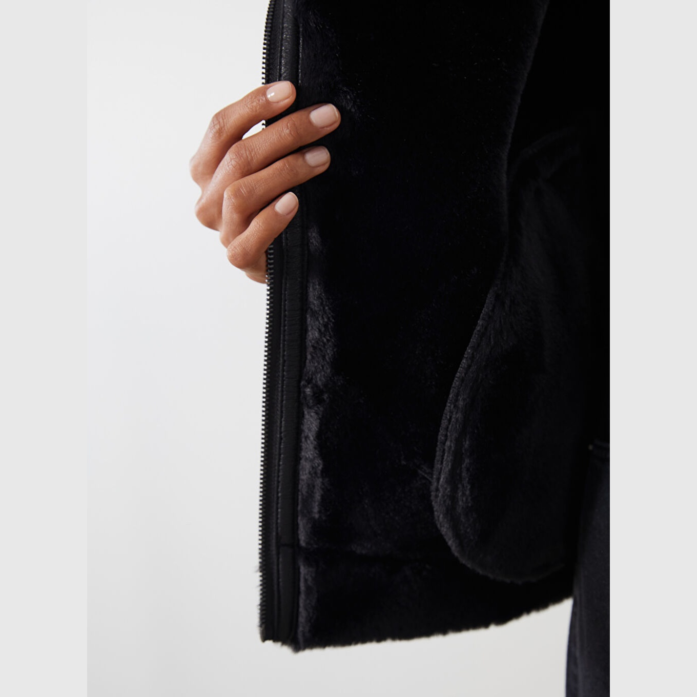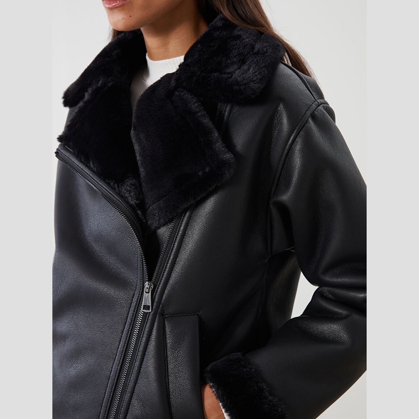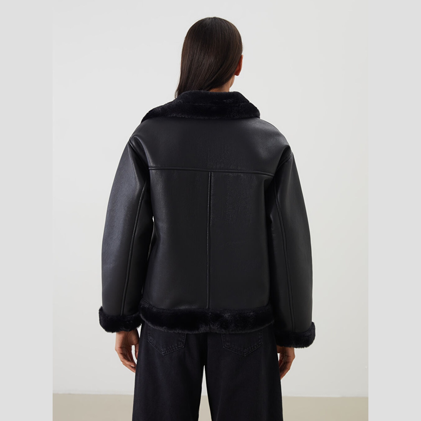 جاكيت نسائي شتوي من LCWAIKIKI Classic – أسود (خامة جلد صناعي، ياقة بايكر مبطنة بالفرو، تصميم ميدي، قصة واسعة، مثالي للإطلالات الشتوية المحتشمة ضمن مجموعة المقاسات الكبيرة)