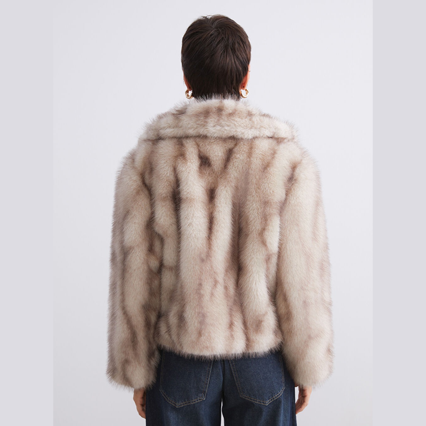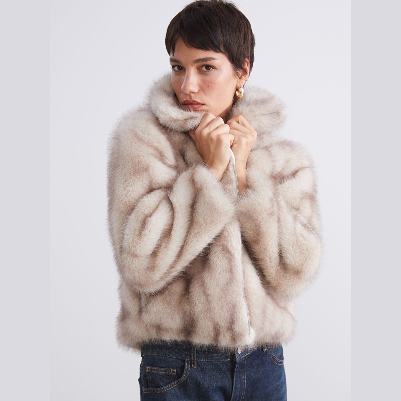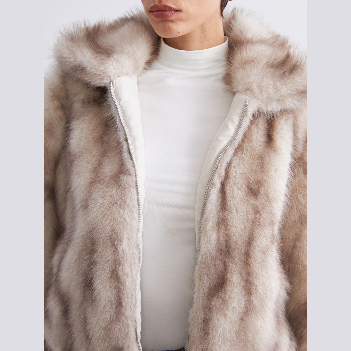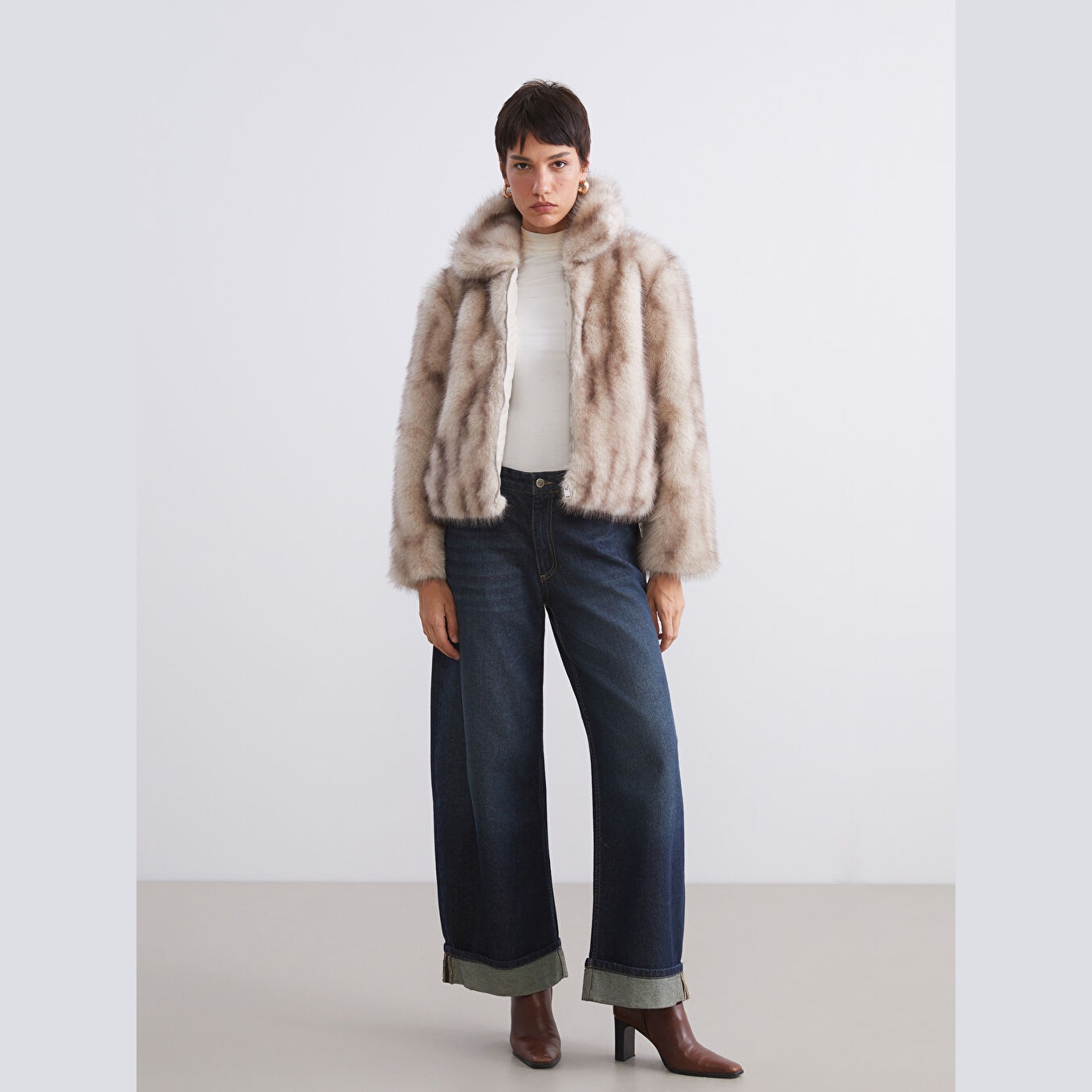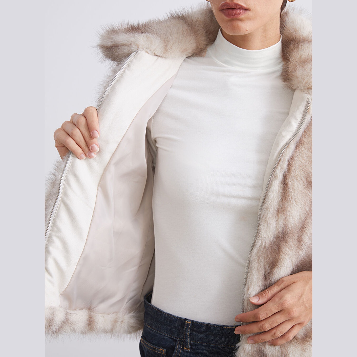 جاكيت نسائي شتوي من LCW Vision – بيج (خامة فرو صناعي، ياقة مستقيمة، تصميم قصير، قصة قياسية، سحاب أمامي، مثالي للإطلالات الشتوية الأنيقة)