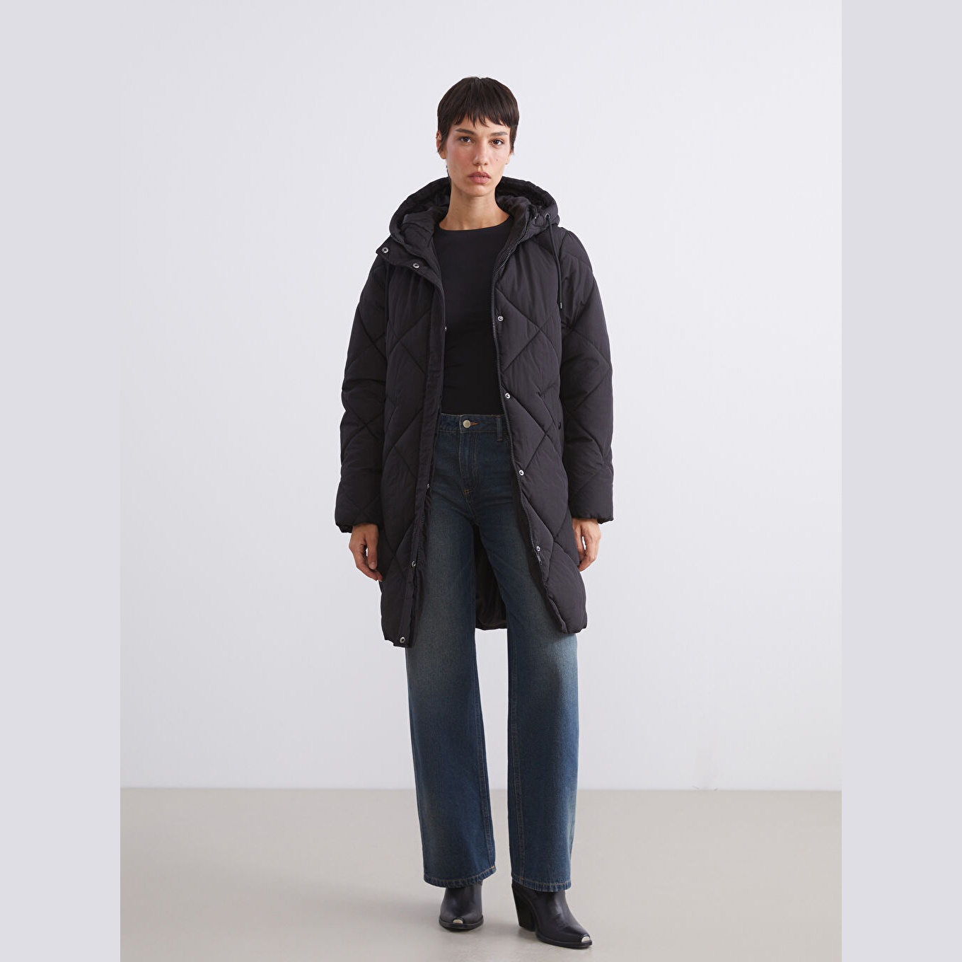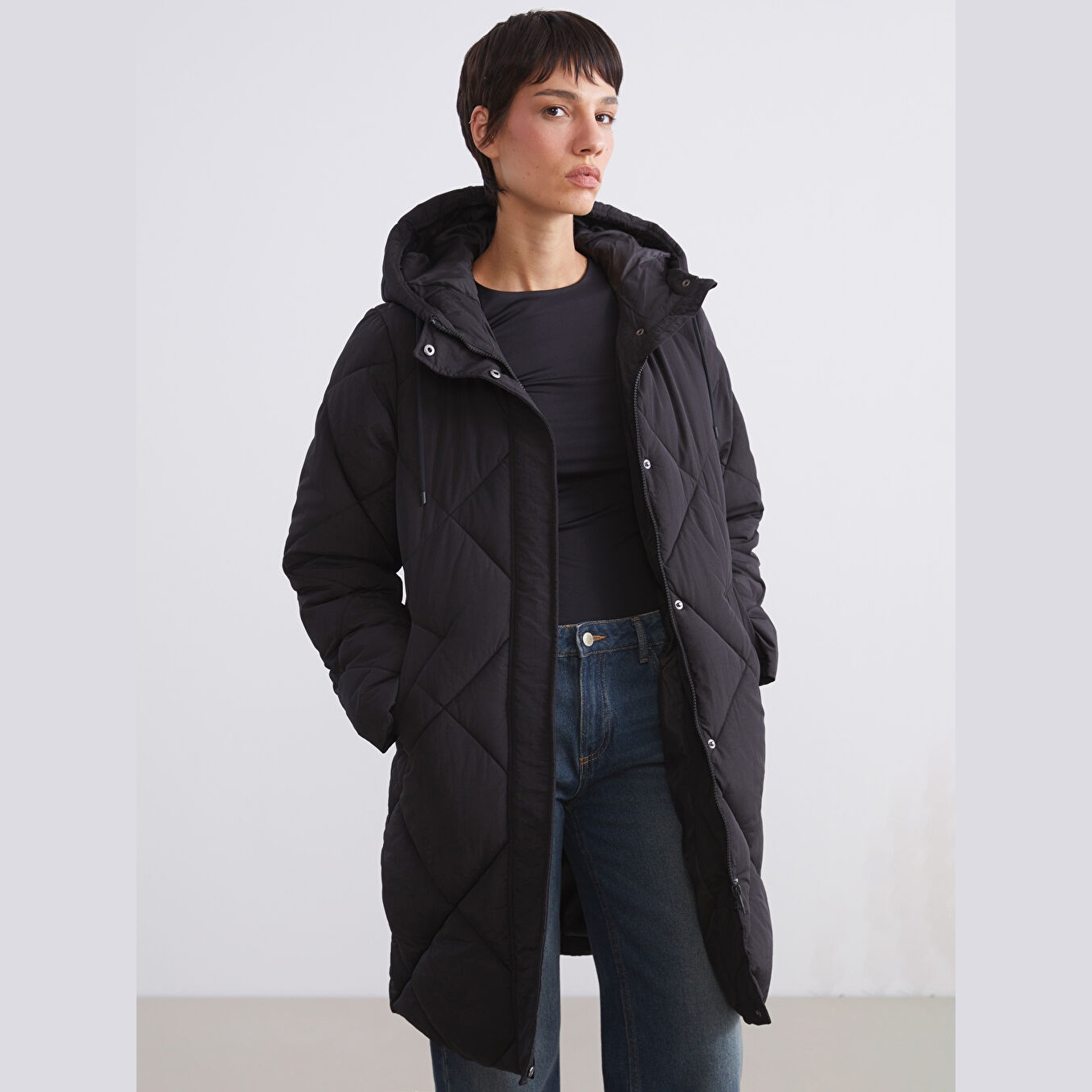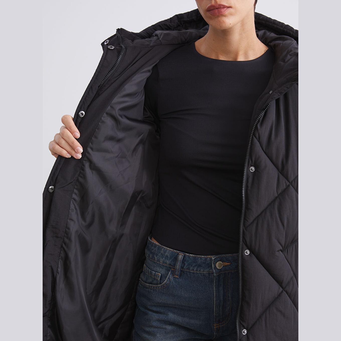 جاكيت شتوي بلون أسود من مجموعة LCW Vision، تصميم مبطّن بنمط كابيتوني (Kapitone) يمنحك مظهرًا أنيقًا ودفئًا مثاليًا، قصة قياسية (Standart & Regular) توفر راحة وانسيابية، غطاء رأس ثابت (Sabit Kapüşonlu) للحماية من الرياح، خامة خارجية من %100 بولياميد، مع بطانة داخلية وحشوة دافئة من %100 بوليستر، بطول ميدي يُقاس من الكتف، مثالي للإطلالات اليومية أو الخارجية في الشتاء بأسلوب عملي وراقي.