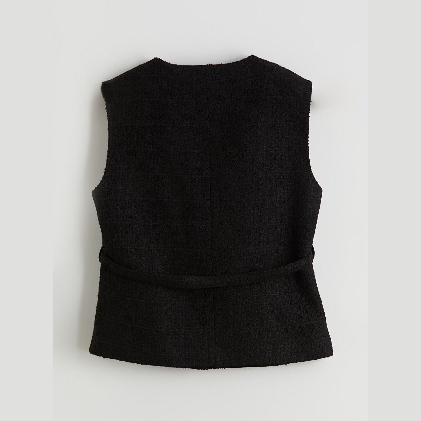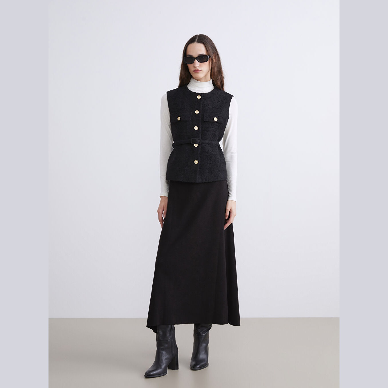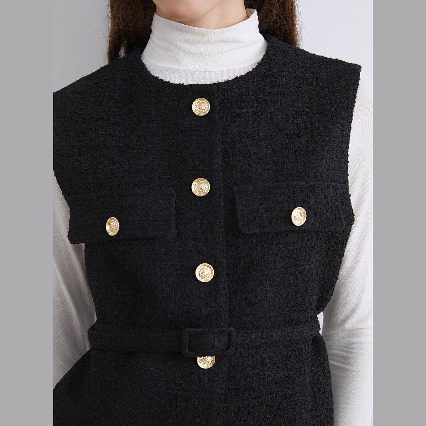 فيست نسائي شتوي – أسود (ياقة دائرية، خامة تويد، قصة كلاسيكية، تصميم بأزرار، مناسب للإطلالات المحتشمة)