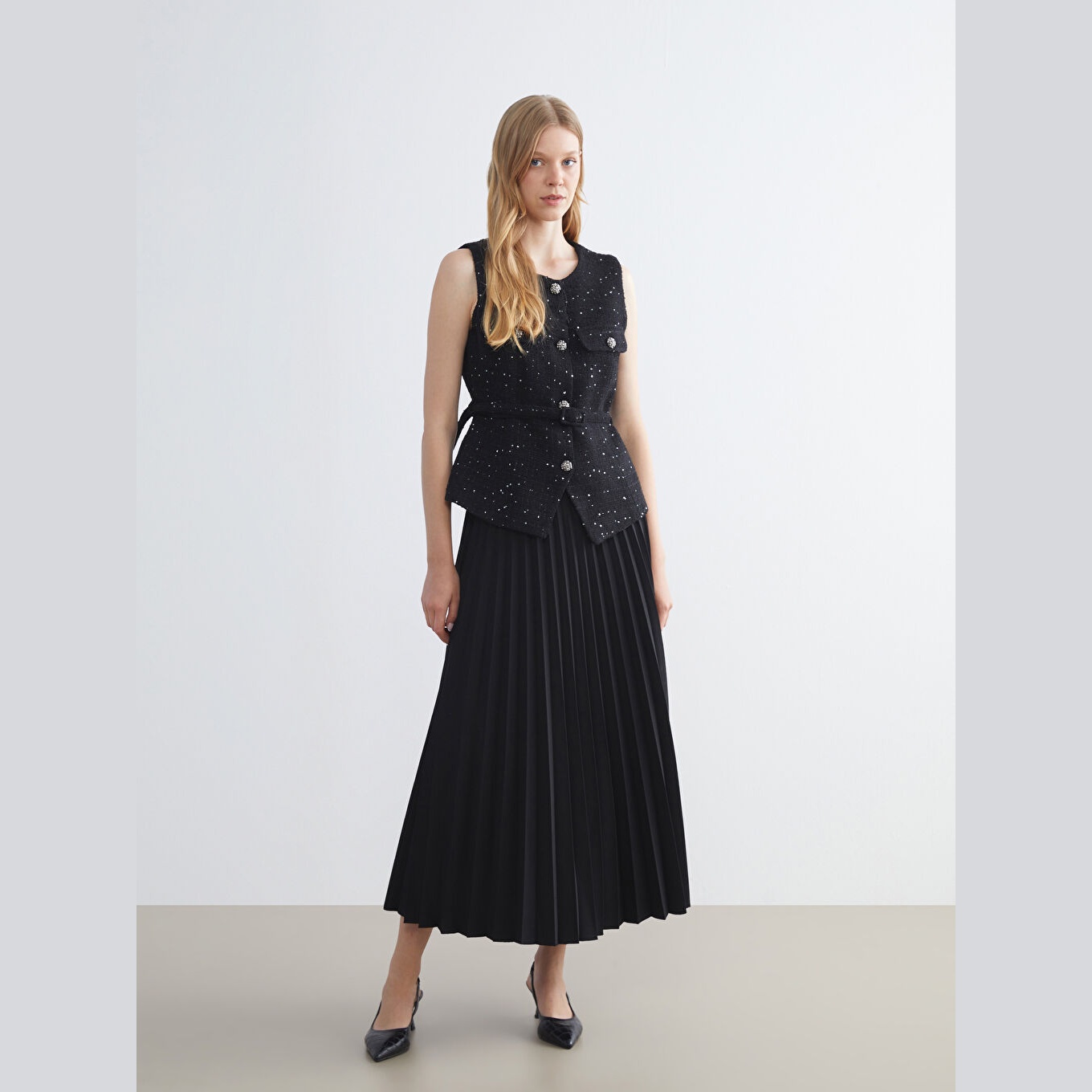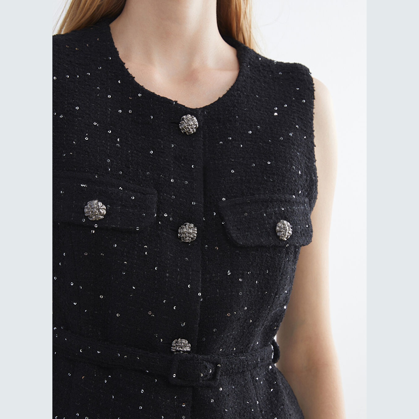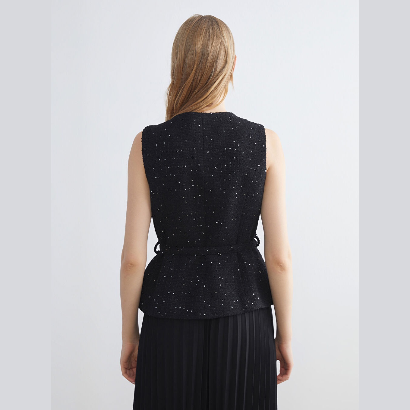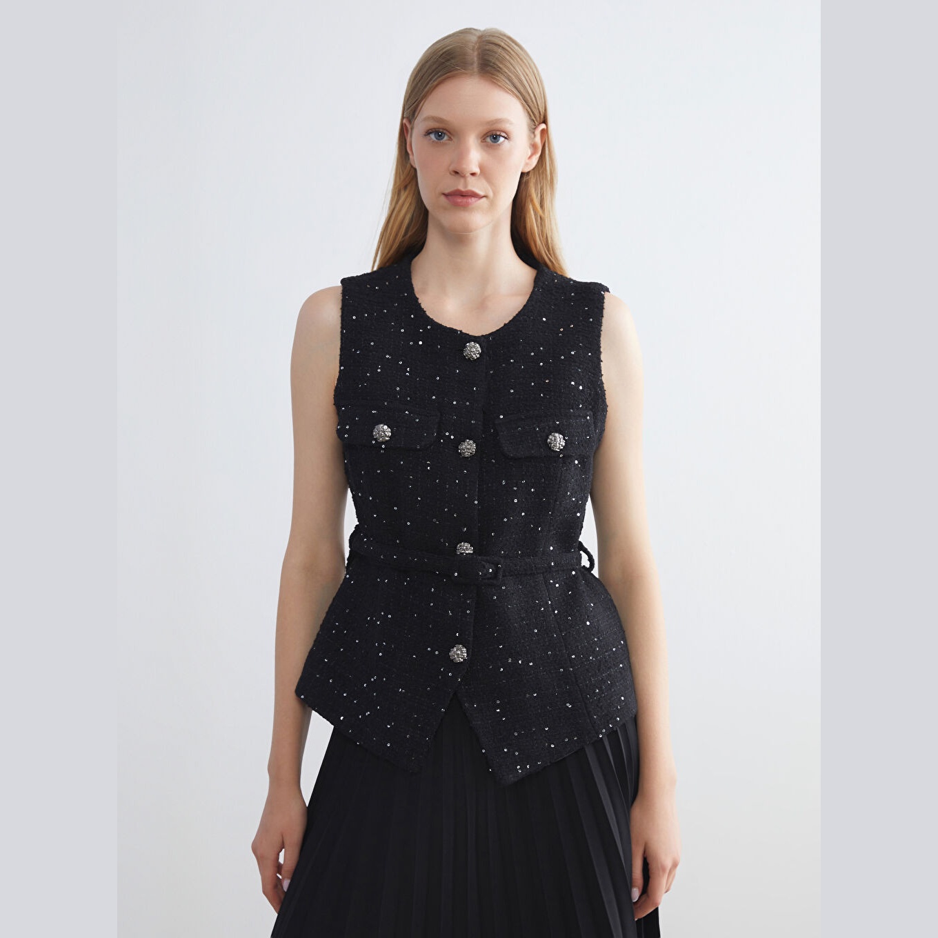 فيست نسائي شتوي – أسود مزين بحبيبات لامعة (ياقة دائرية، تصميم بكِمر وأزرار، خامة بوليڤيسكون، بطول قصير)