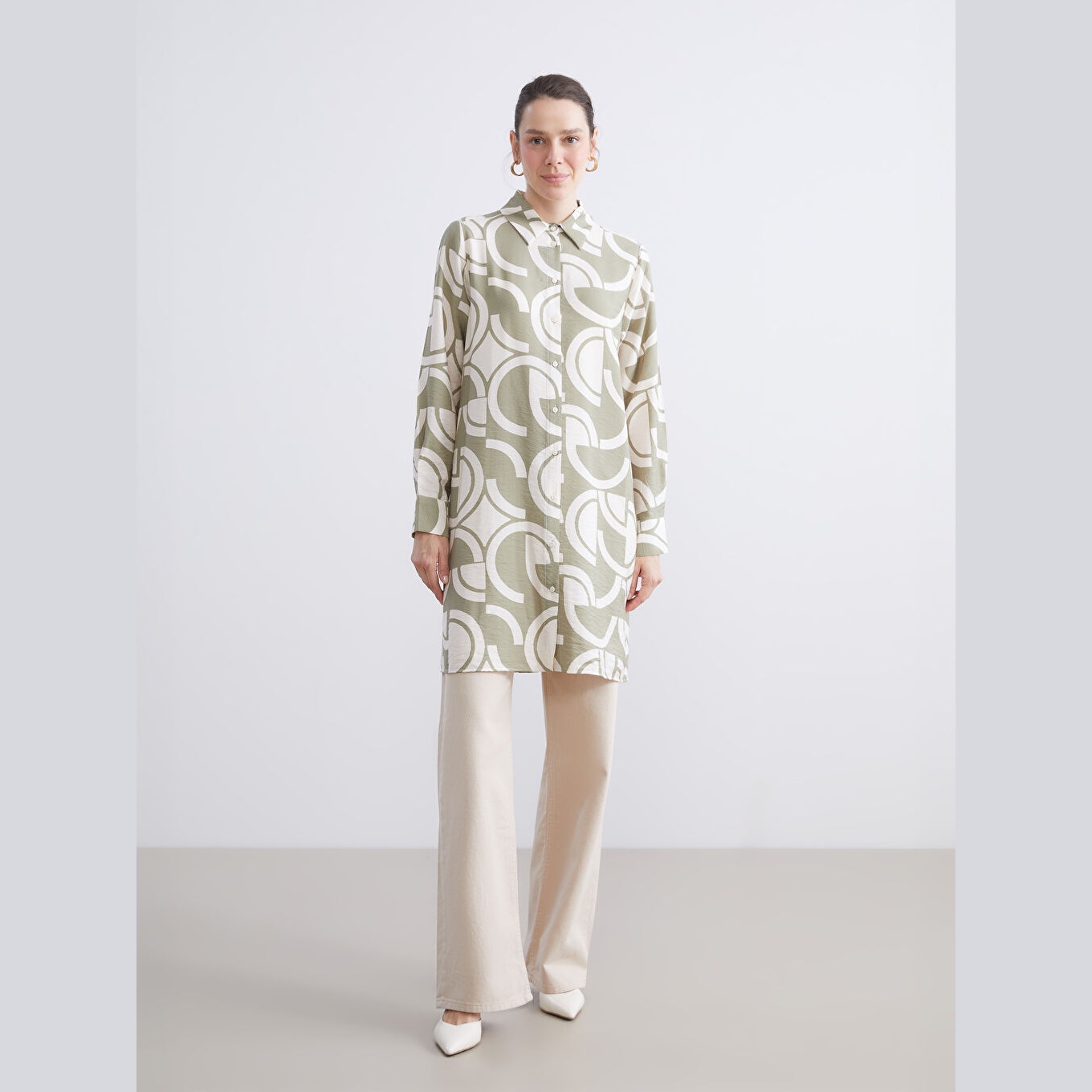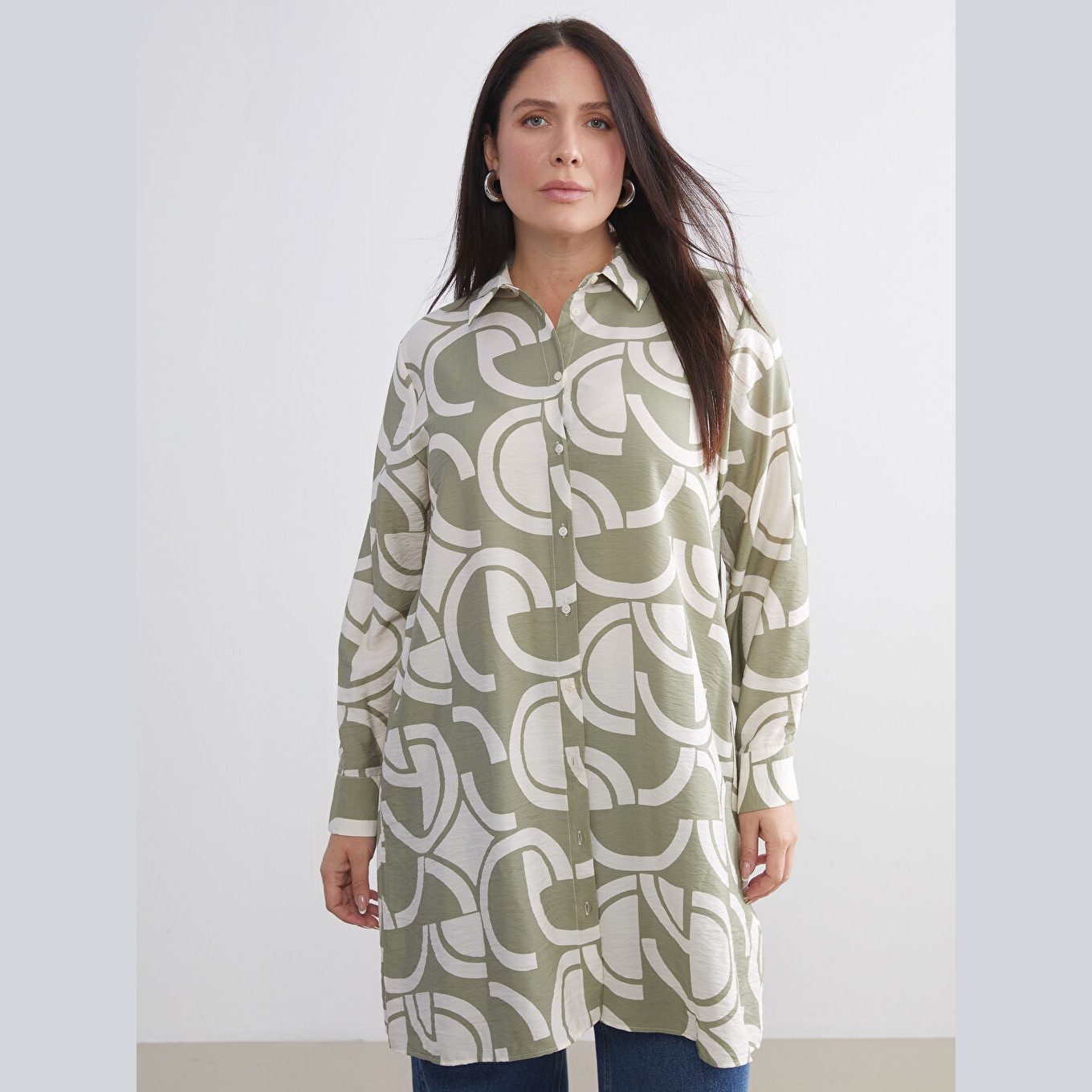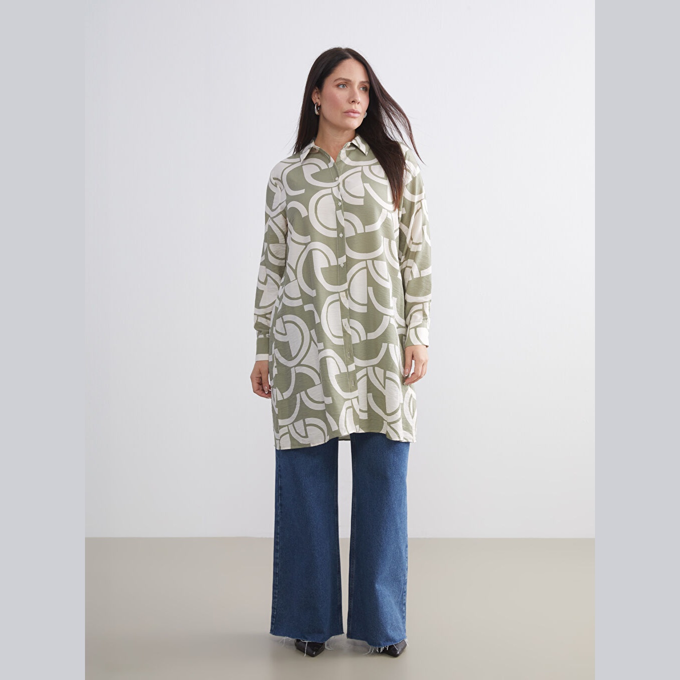 تونيك قميص نسائي – أخضر مزخرف (ياقة قميص، خامة فسكوز، قصة قياسية، تصميم بأزرار، بطول الورك)