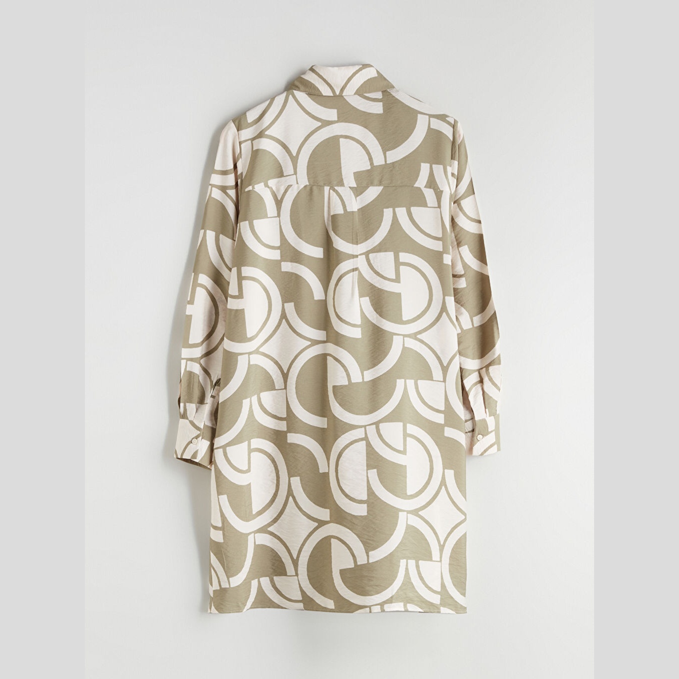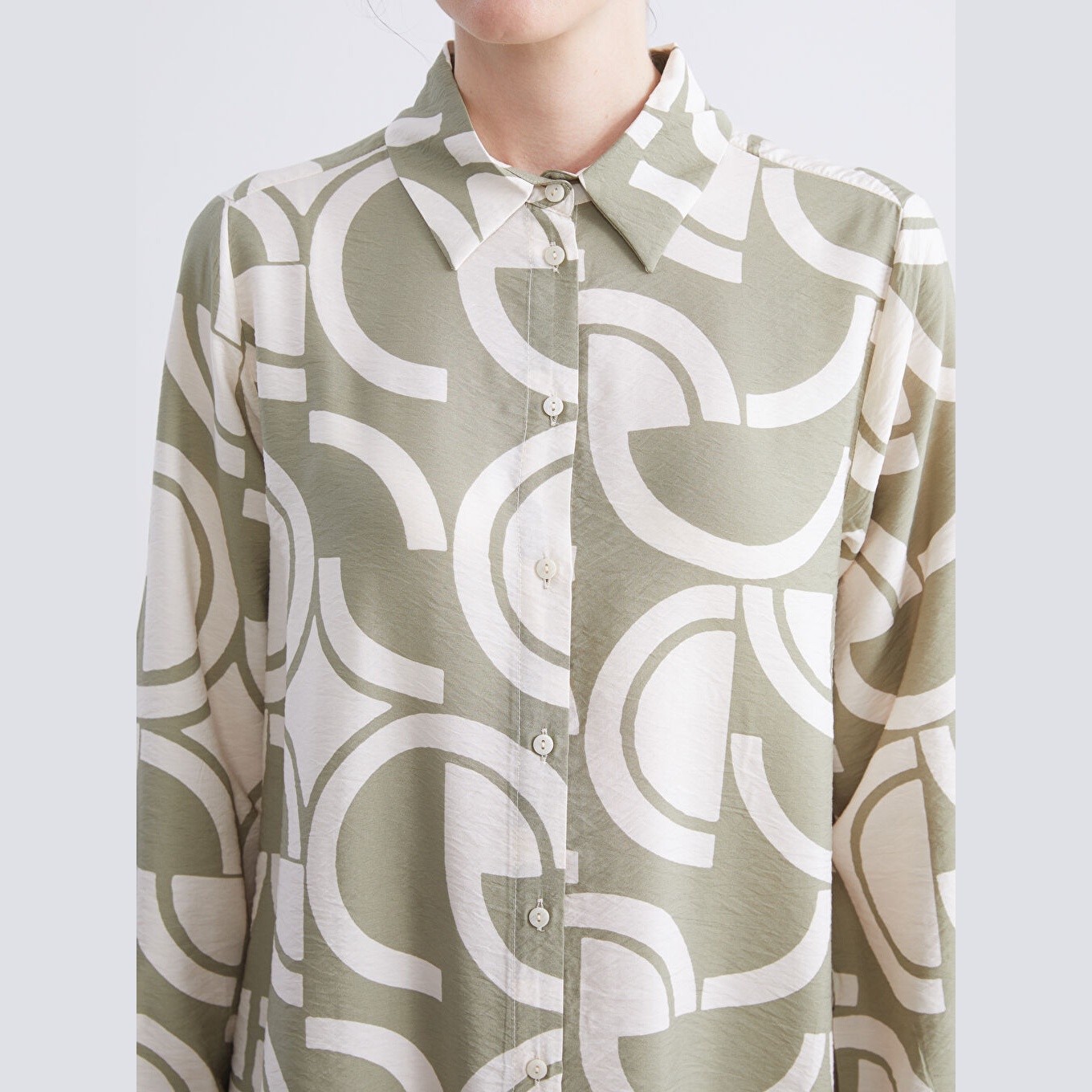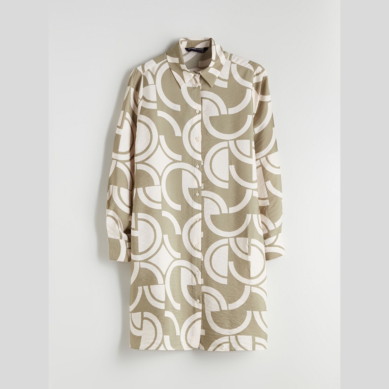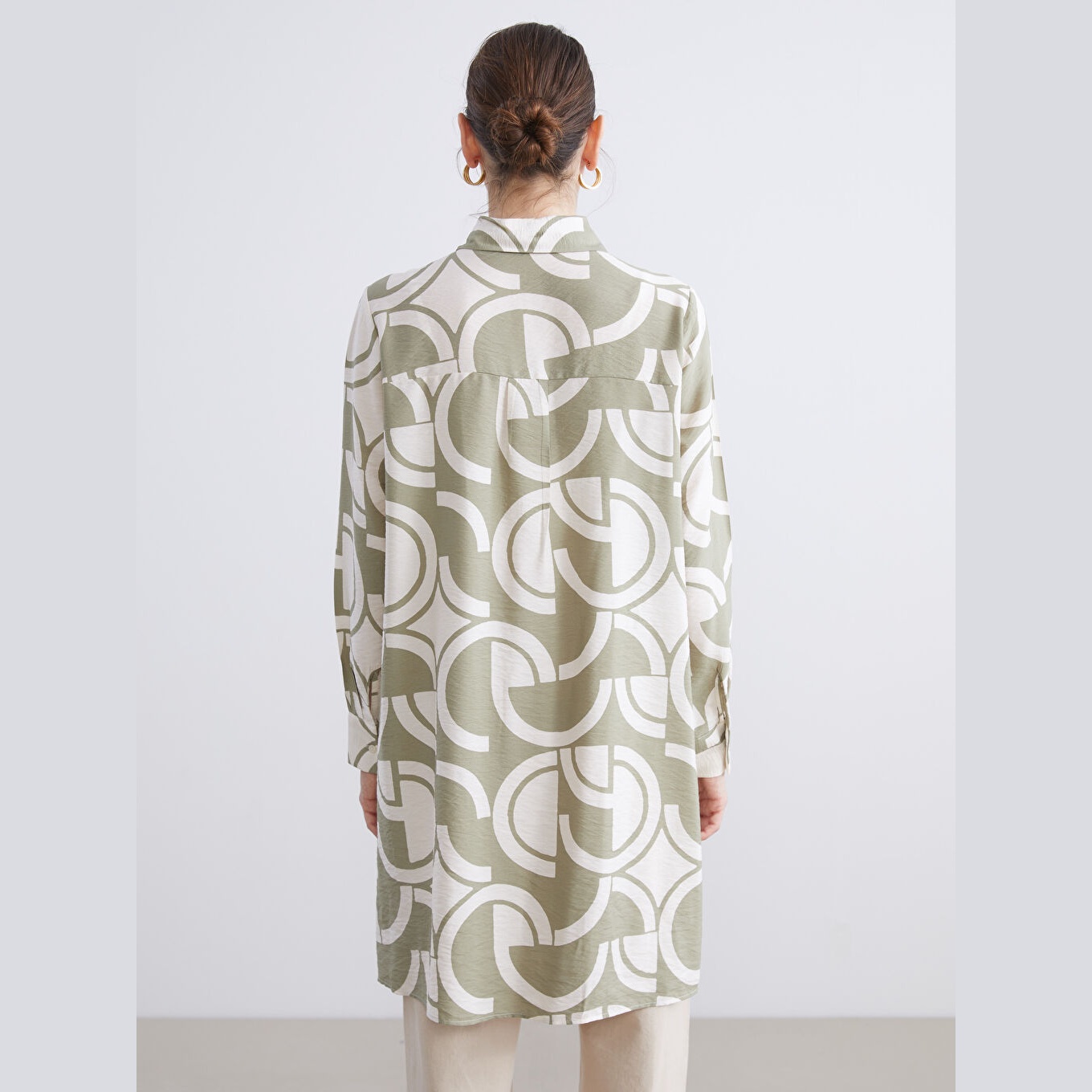تونيك قميص نسائي – أخضر مزخرف (ياقة قميص، خامة فسكوز، قصة قياسية، تصميم بأزرار، بطول الورك)