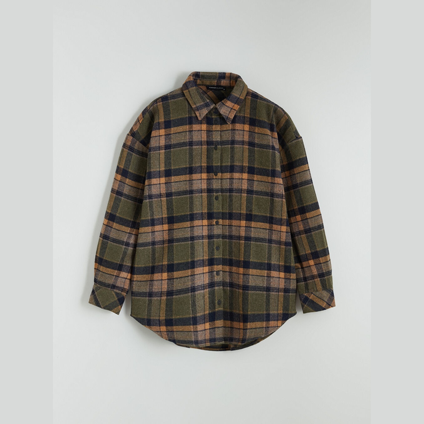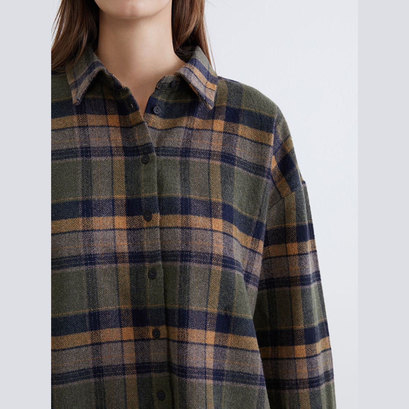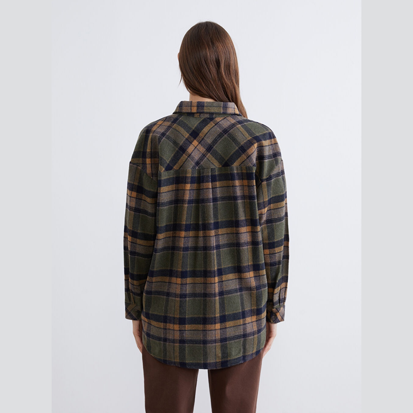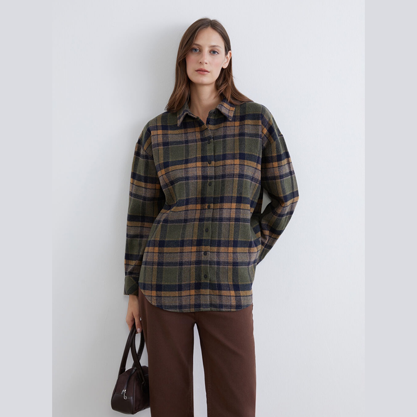 قميص نسائي واسع – أخضر بنقشة مربعات (ياقة كلاسيكية، قصة فضفاضة، تصميم عملي بأزرار، بطول الورك)