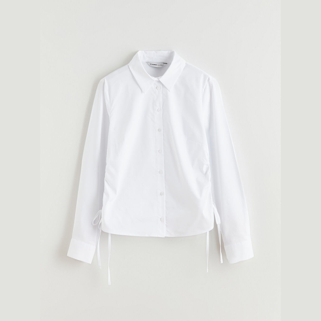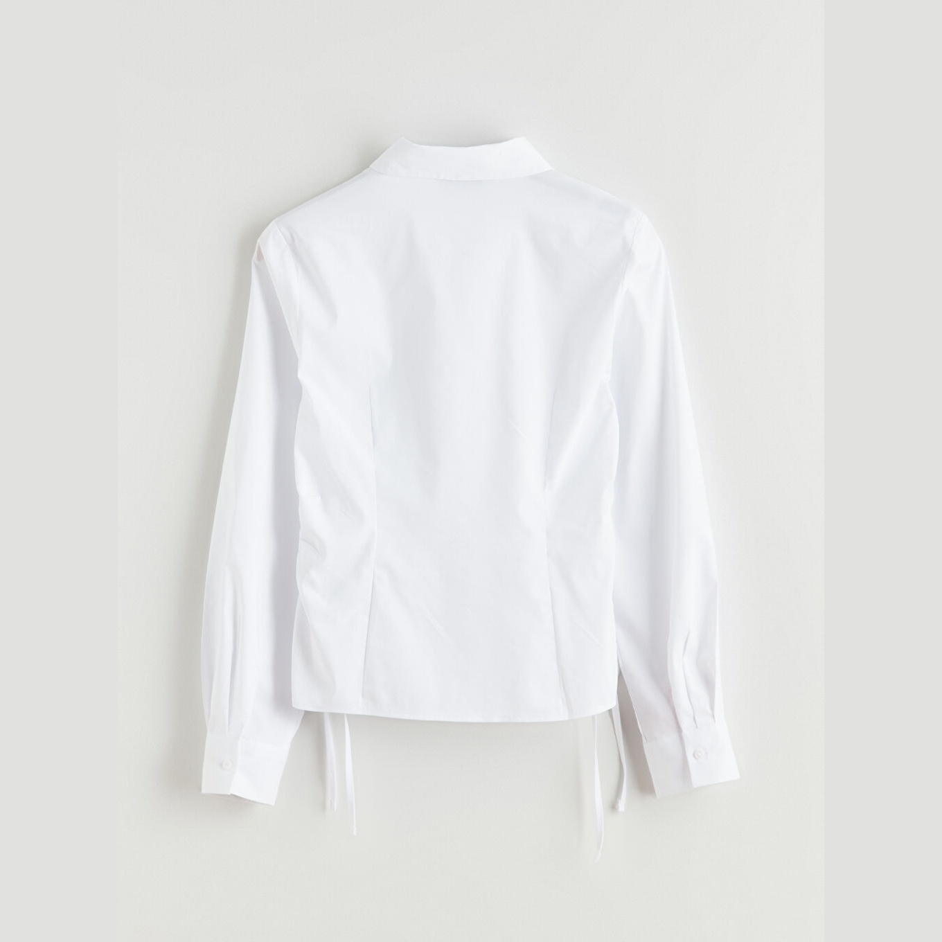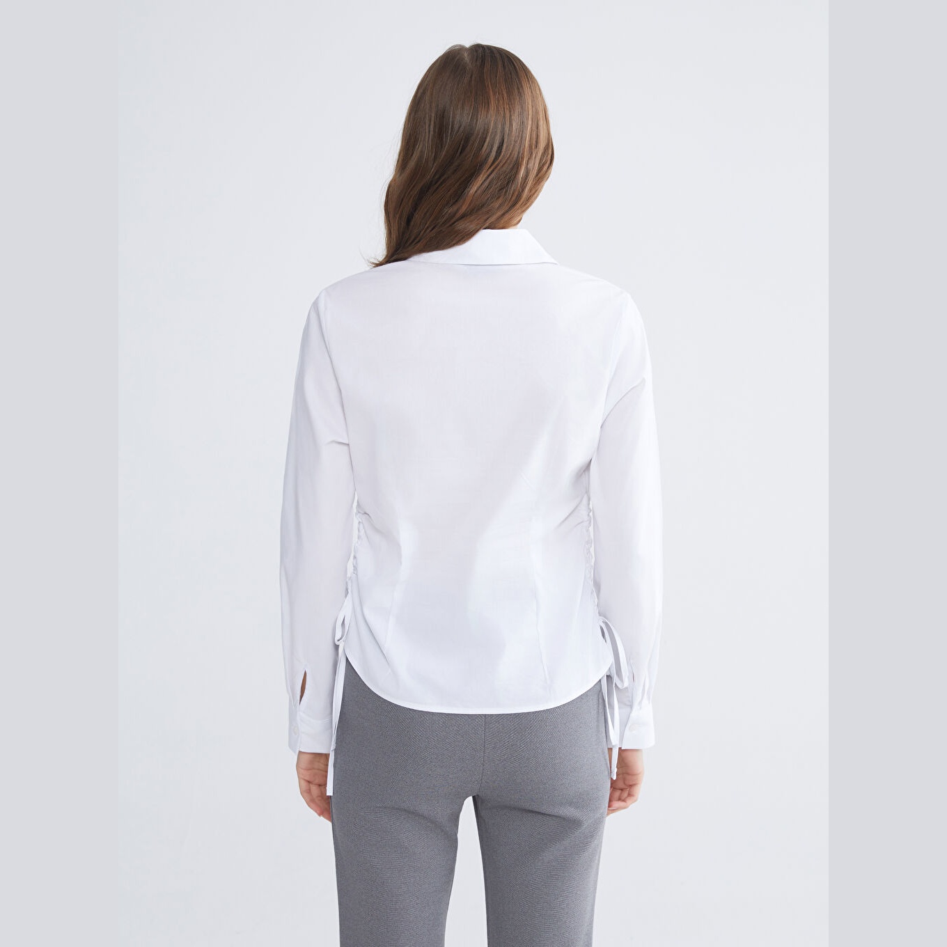 قميص نسائي – أبيض بتفصيل ربطة أمامية (ياقة قميص، خامة بوبلين، قصة قياسية، تصميم عملي بأزرار، مناسب للمقاسات الكبيرة)