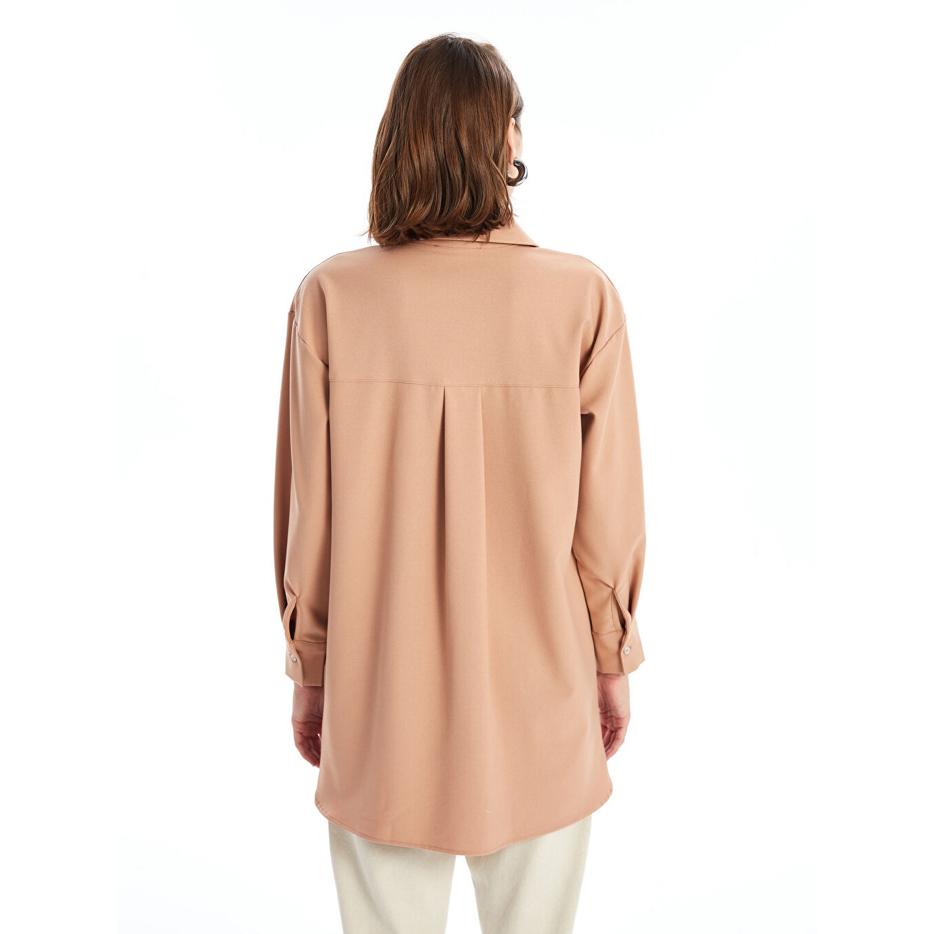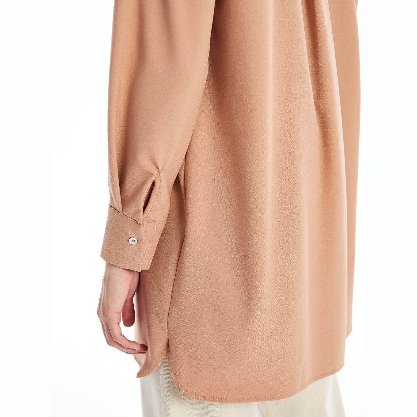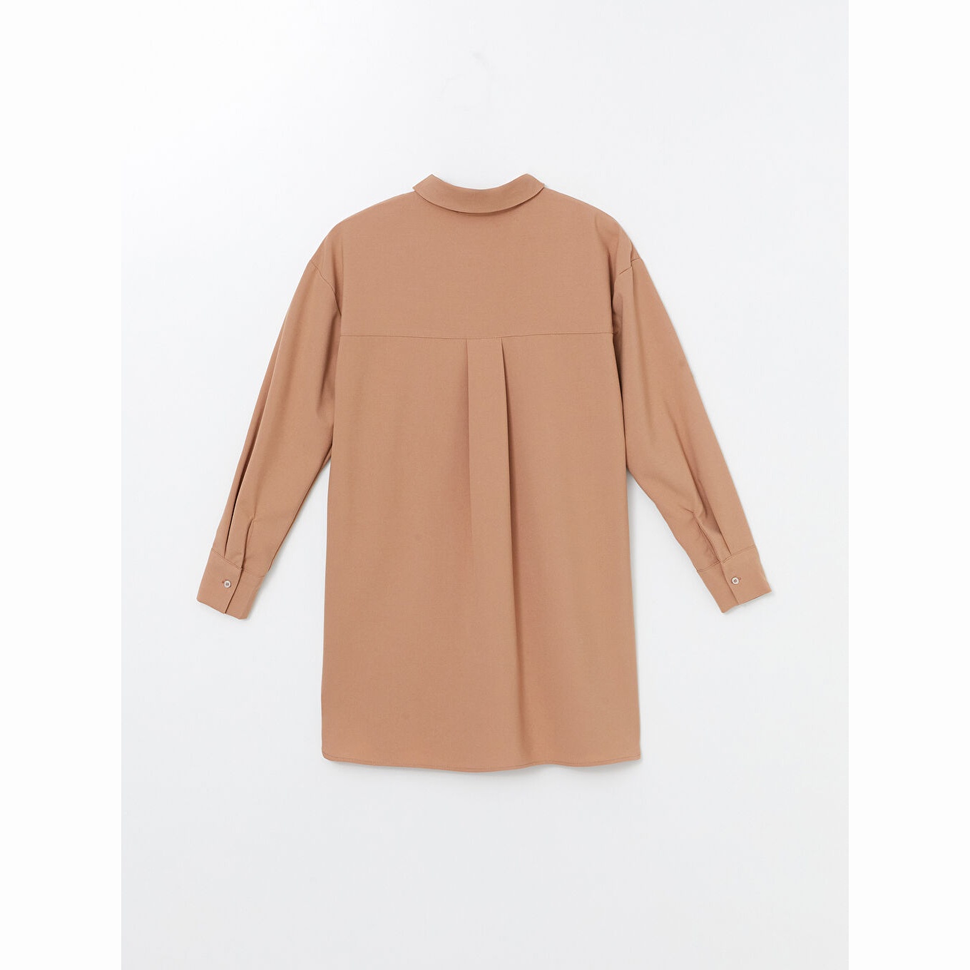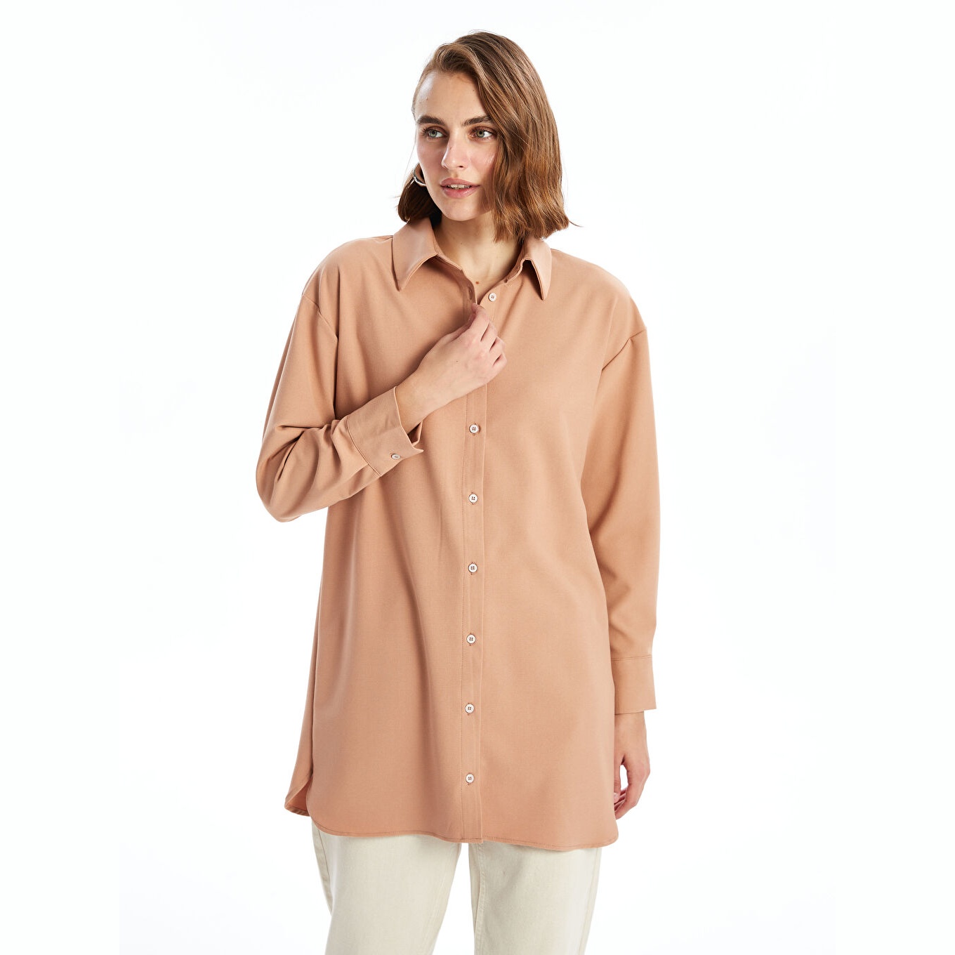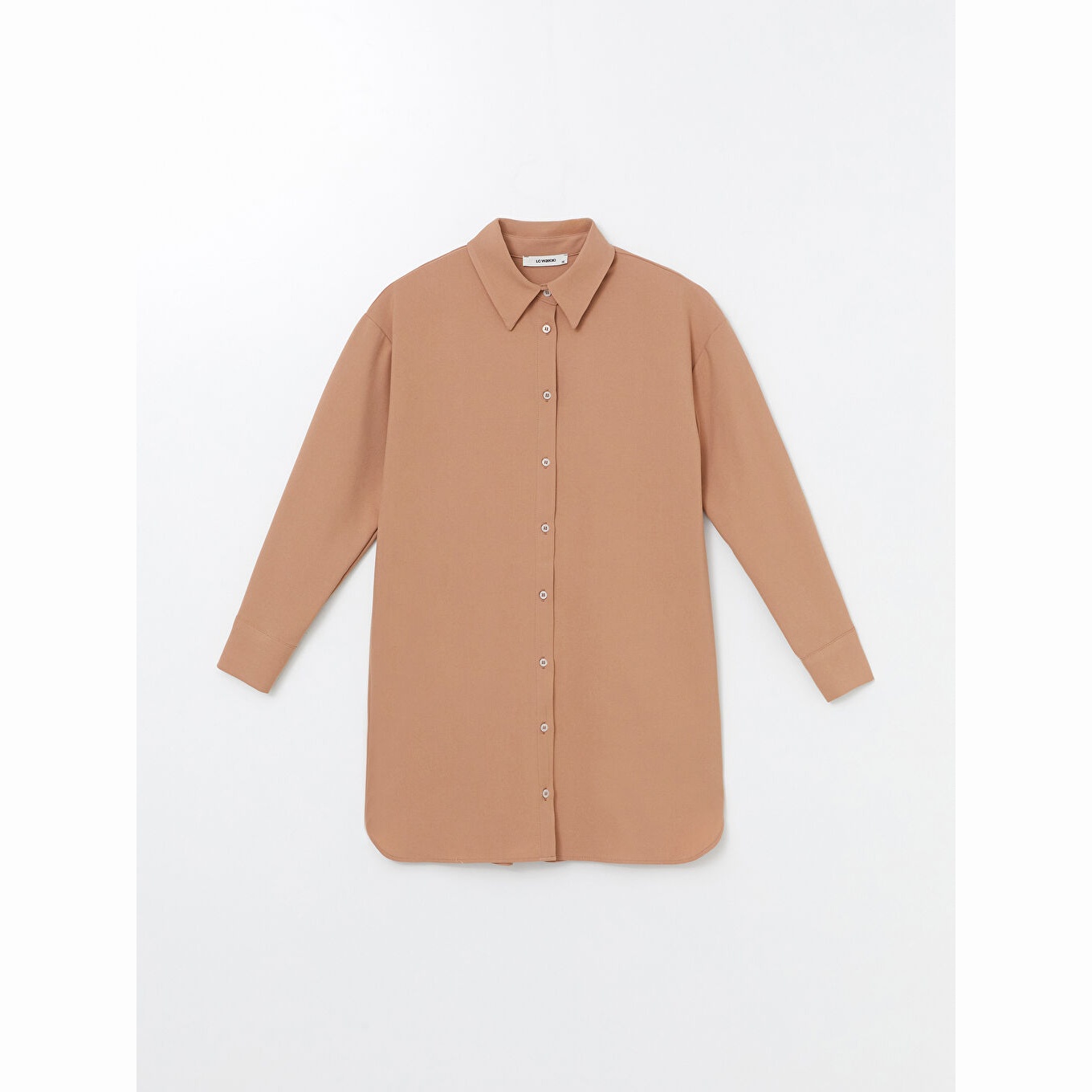 تونيك قميص نسائي واسع – بني سادة (ياقة قميص، خامة بولي فسكوز، قصة فضفاضة، تصميم عملي بأزرار، بطول الورك)