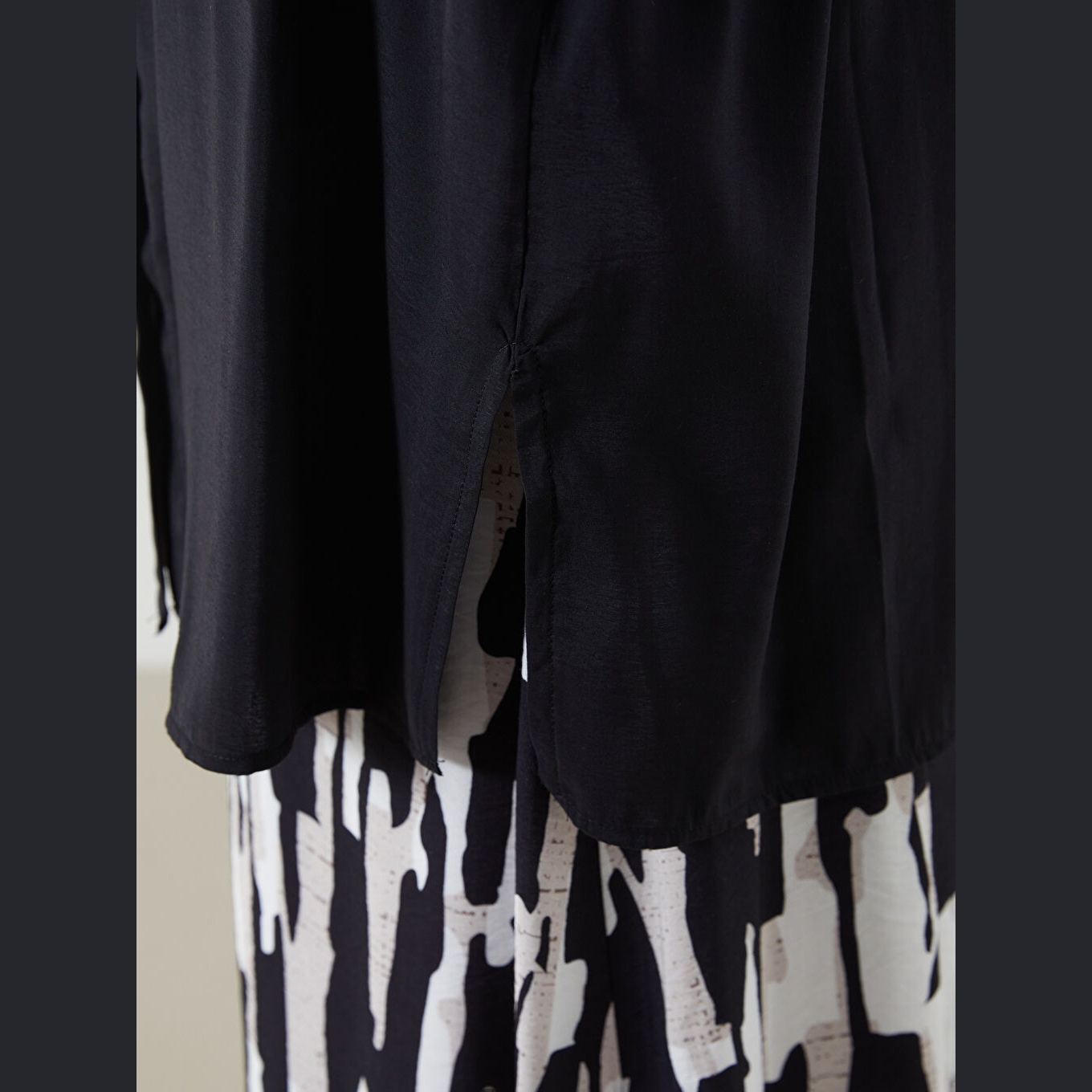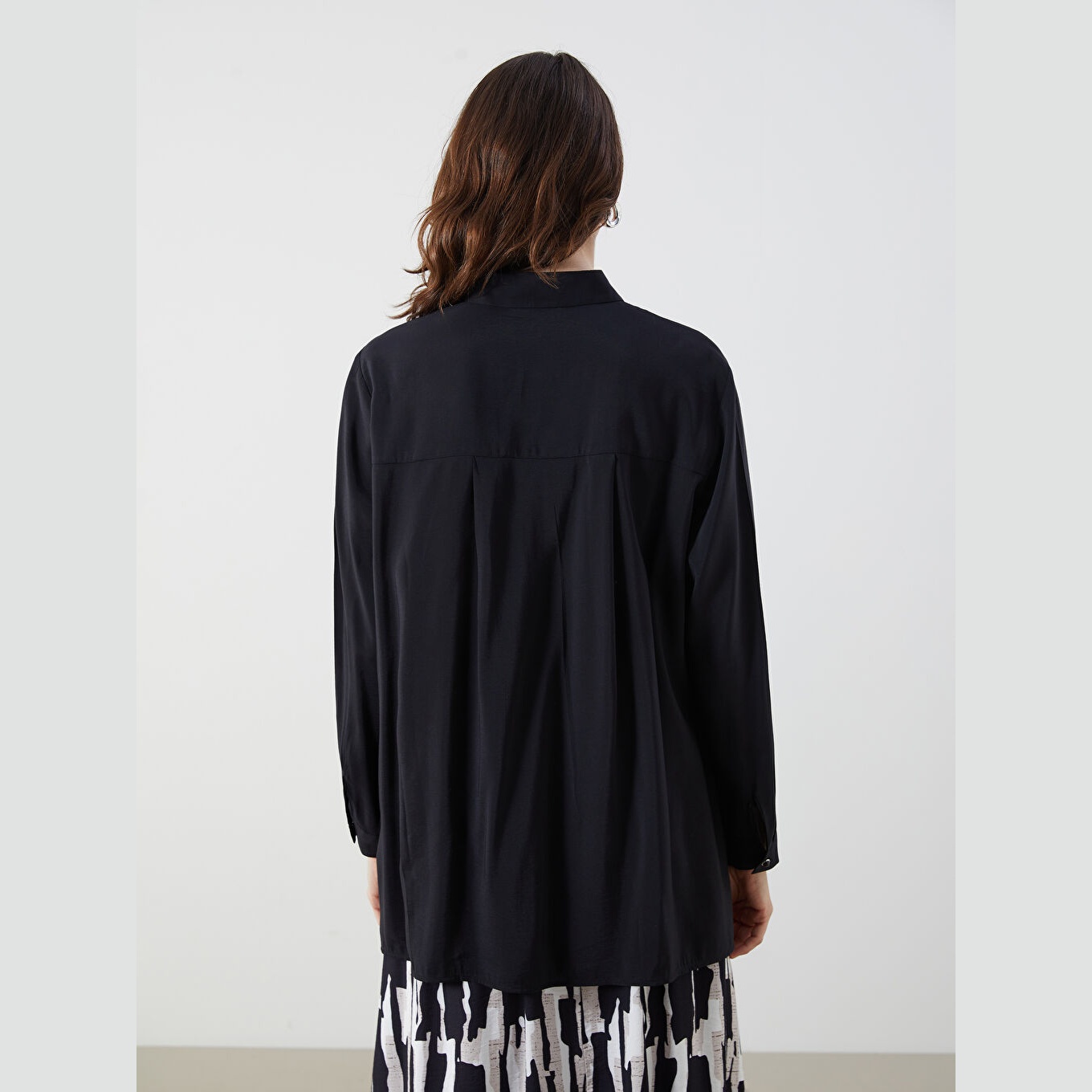 تونيك قميص نسائي واسع – أسود سادة (ياقة قميص، خامة مودال، قصة فضفاضة، تصميم عملي بأزرار، بطول الورك)