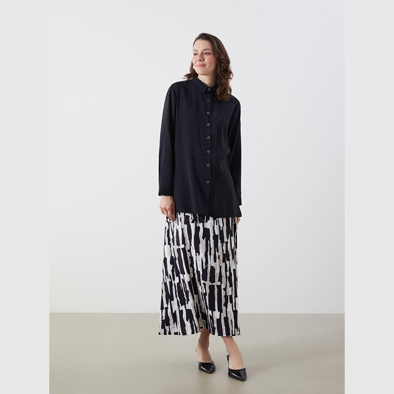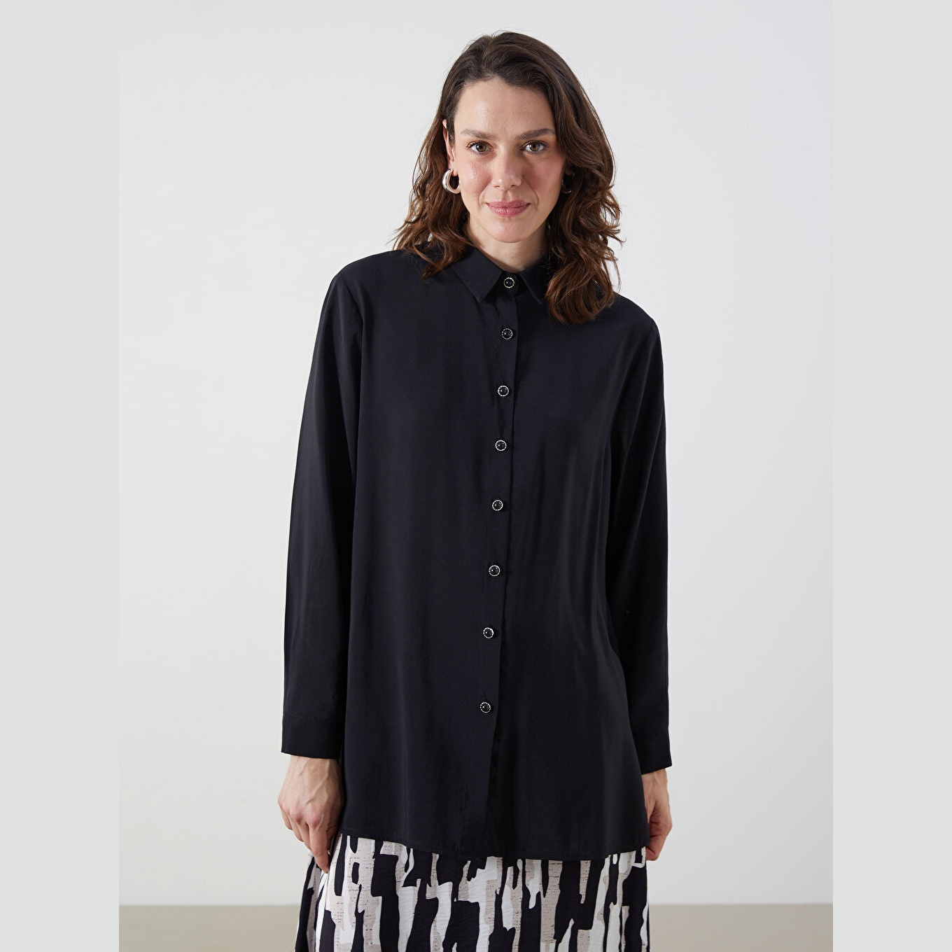 تونيك أنيق بلون أسود سادة من مجموعة LC Waikiki للمقاسات الكبيرة، يتميز بياقة قميص تقليدية تضيف لمسة رسمية ناعمة، وقصة فضفاضة (Loose Fit) تمنحك مظهرًا مريحًا ومحتشمًا. مصنوع من خامة مودال ناعمة بتركيبة %83 مودال، %17 بوليستر، بأكمام طويلة، بسماكة متوسطة، بطول يصل إلى الورك، ويُغلق بأزرار أمامية، مثالي للتنسيق مع البنطال القماشي أو الجينز في الإطلالات اليومية أو العملية.