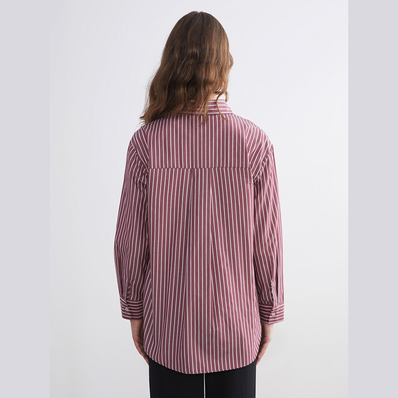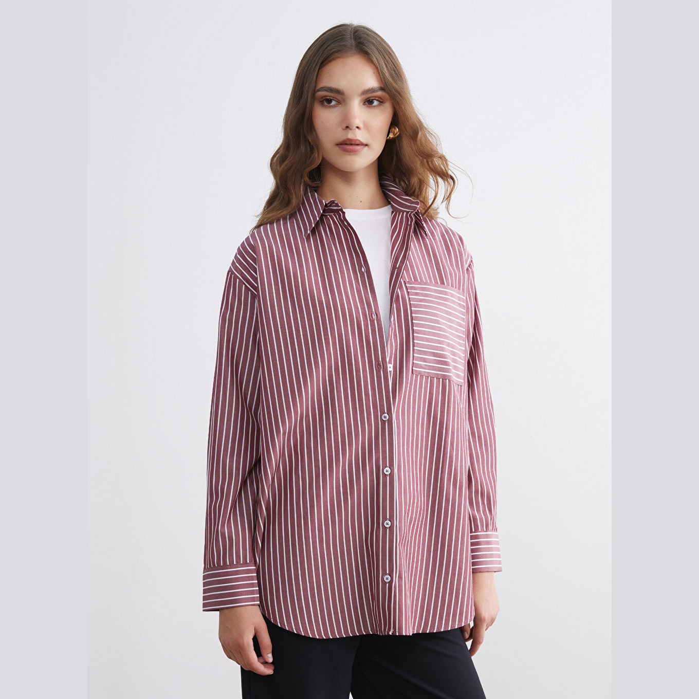 تونيك قميص نسائي واسع – بوردو مخطط (ياقة قميص، خامة بوبلين، قصة فضفاضة، تصميم عملي بأزرار، بطول الورك)