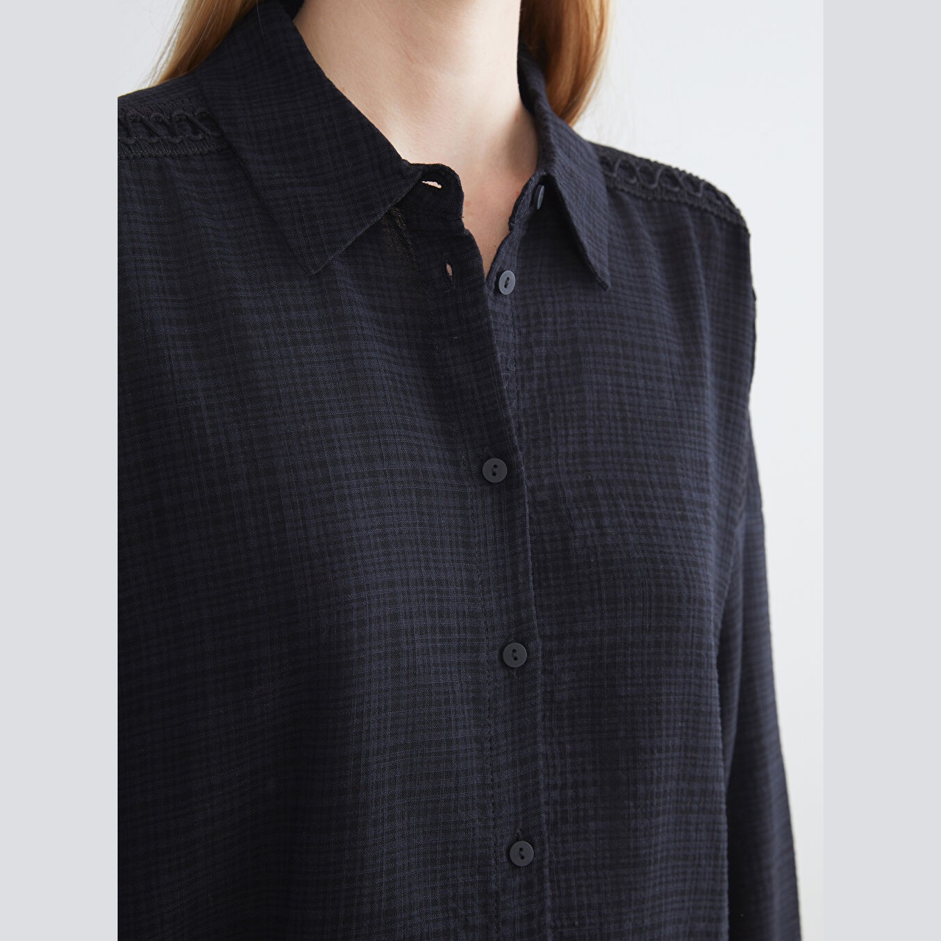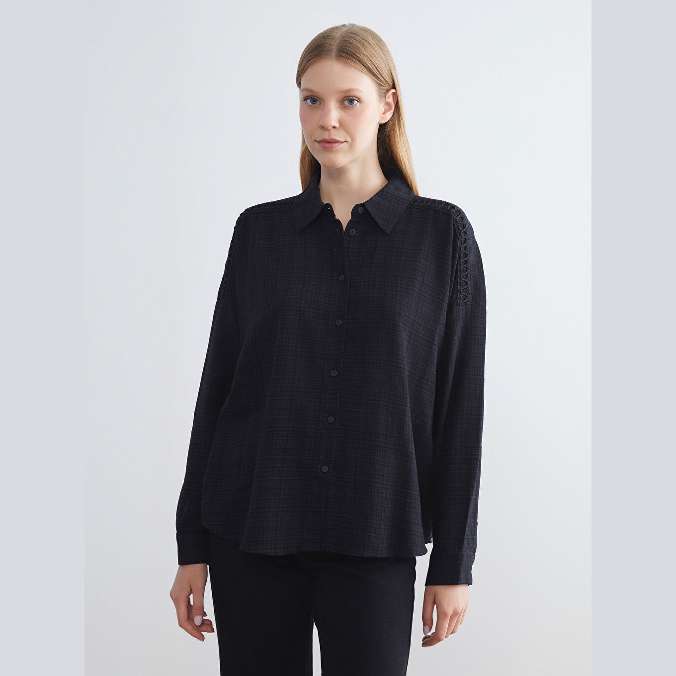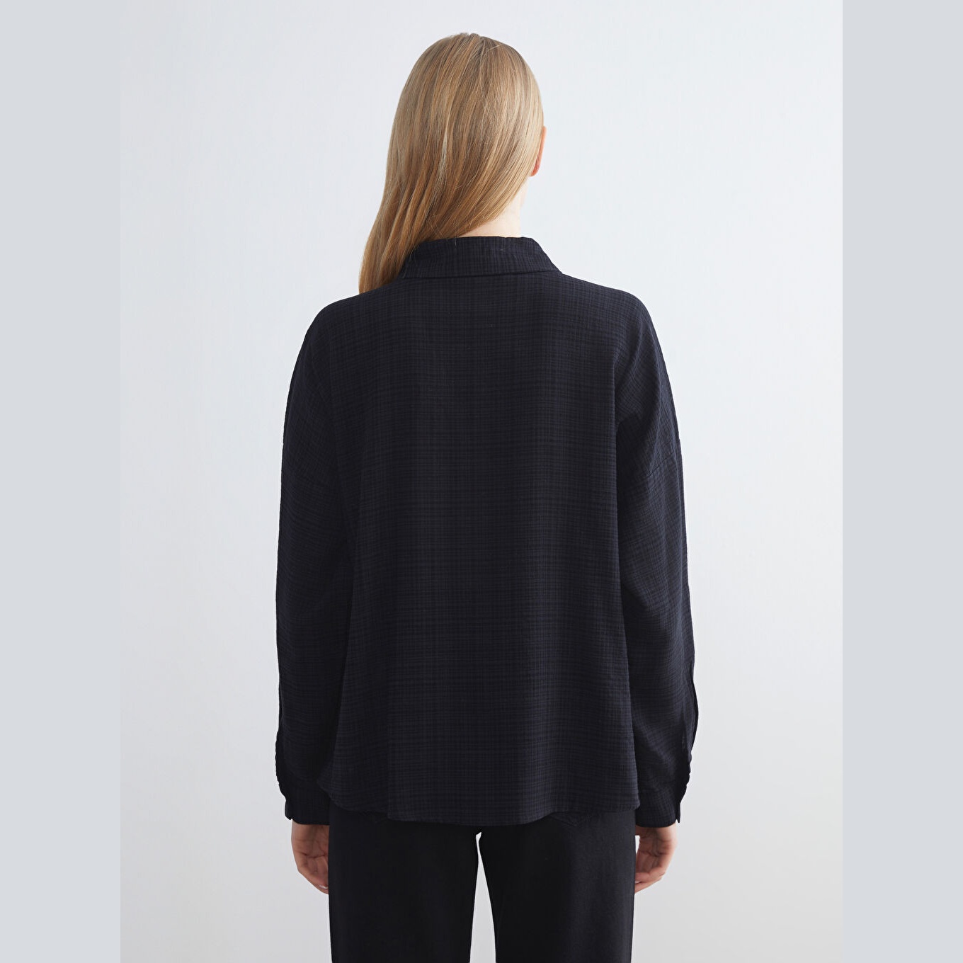 قميص نسائي واسع – أسود سادة (ياقة قميص، خامة كرينكل، قصة فضفاضة، تصميم عملي بأزرار، بطول الورك)