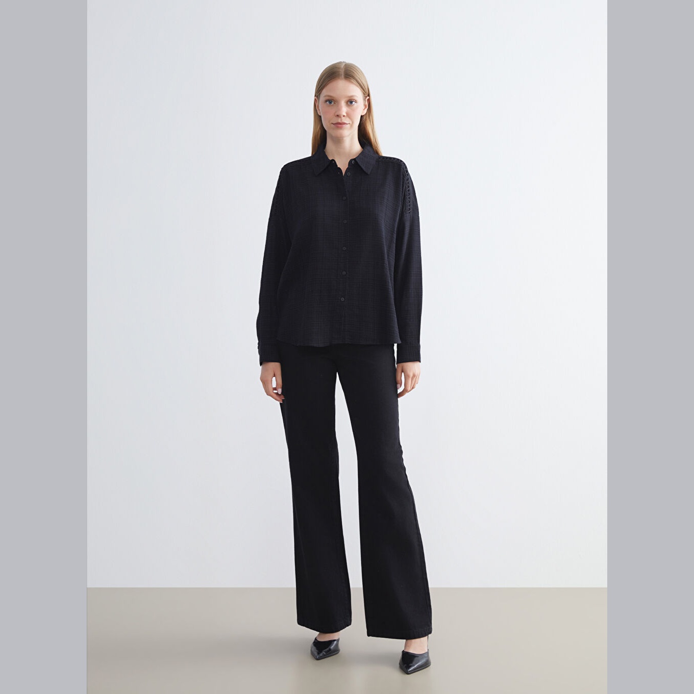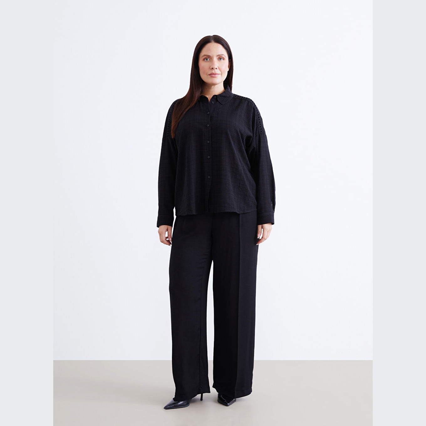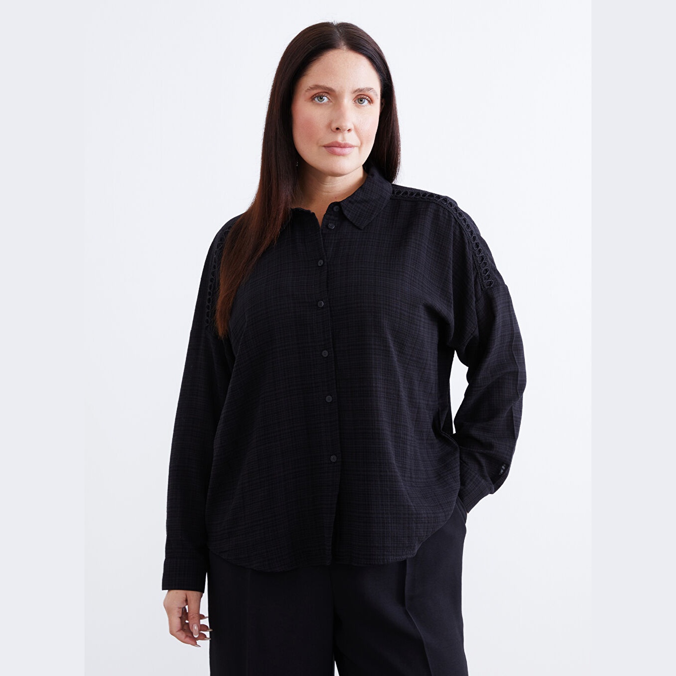 قميص أنيق بلون أسود سادة من مجموعة LC Waikiki للمقاسات الكبيرة، يتميز بياقة قميص تقليدية تضيف لمسة رسمية ناعمة، وقصة واسعة (Oversize) تمنحك مظهرًا مريحًا وعصريًا. مصنوع من خامة كرينكل قطنية بتركيبة %60 قطن، %40 فيسكوز، بأكمام طويلة، بسماكة متوسطة، بطول يصل إلى الورك، ويُغلق بأزرار أمامية، مثالي للتنسيق مع البنطال القماشي أو الجينز في الإطلالات اليومية أو العملية.