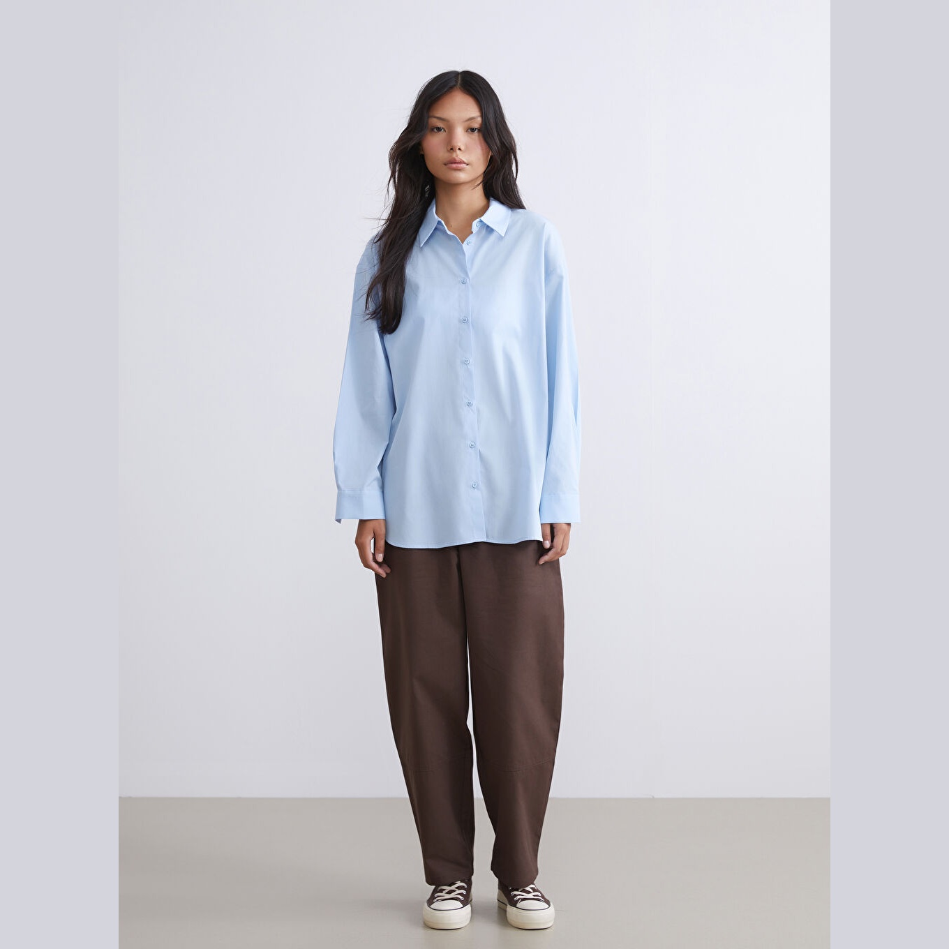تونيك عملي بلون أزرق سادة من مجموعة LCW Modest، يتميز بياقة قميص تقليدية تضيف لمسة رسمية ناعمة، وقصة منتظمة (Regular Fit) تمنحك مظهرًا متوازنًا ومحتشمًا. مصنوع من خامة بوبلين قطنية 100%، بأكمام طويلة، بسماكة متوسطة، بطول يصل إلى الورك، ويُغلق بأزرار أمامية، مثالي للتنسيق مع البنطال القماشي أو الجينز في الإطلالات اليومية أو العملية.