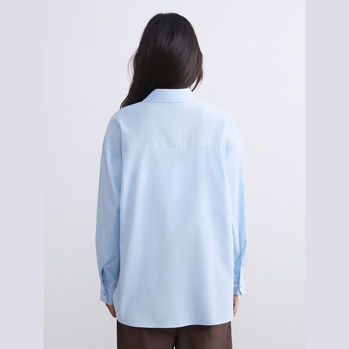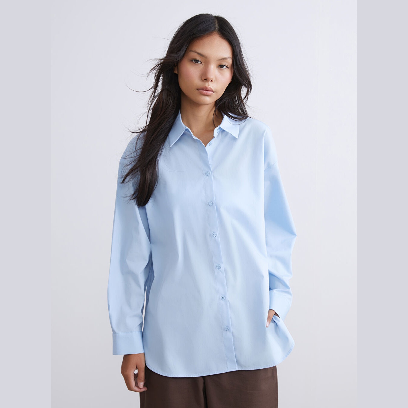 تونيك قميص نسائي كلاسيكي – أزرق سادة (ياقة قميص، خامة بوبلين، قصة منتظمة، تصميم عملي بأزرار، بطول الورك)