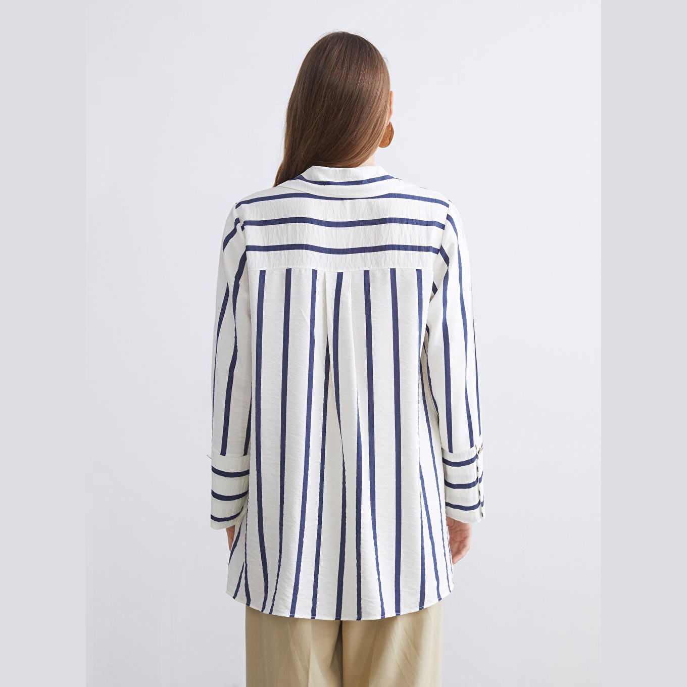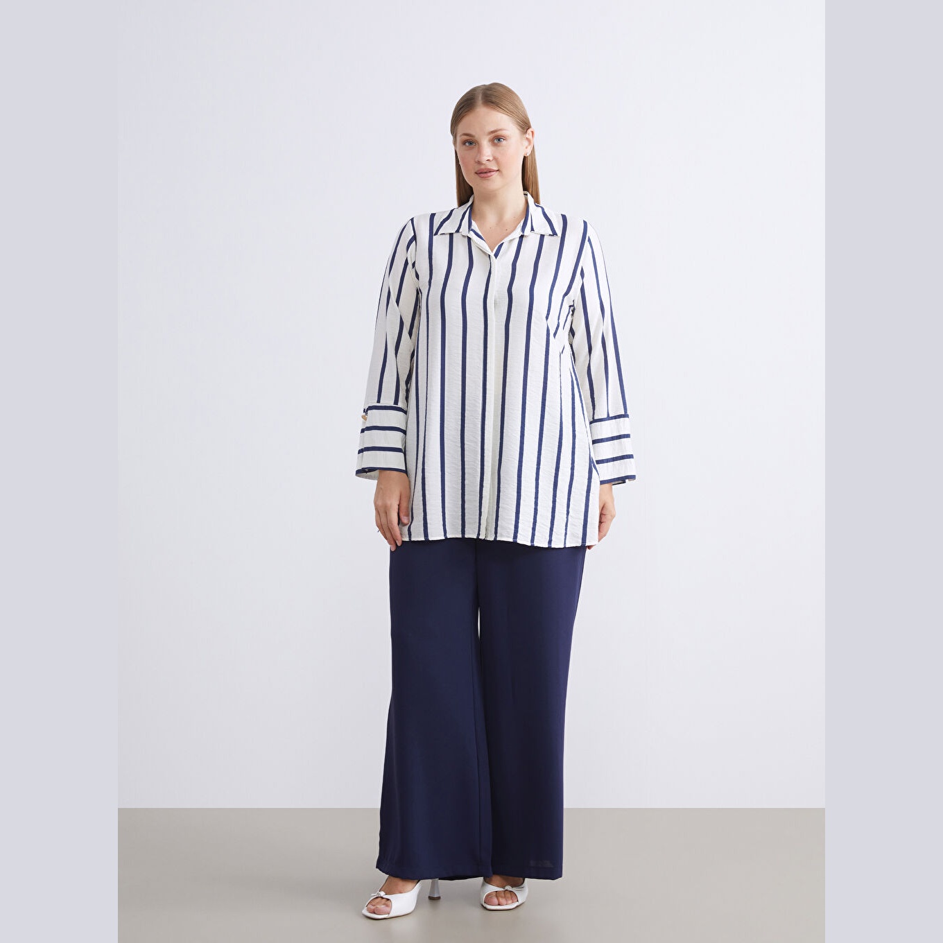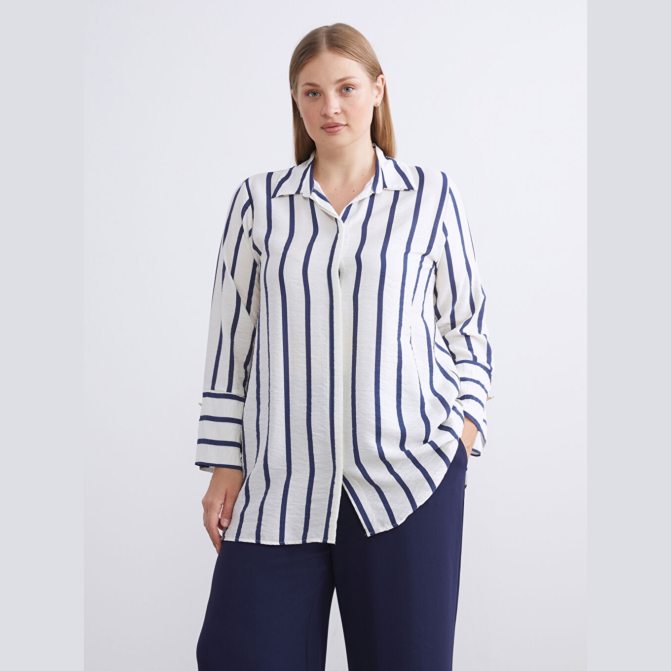 تونيك عملي بلون كحلي بنقشة خطوط ناعمة من مجموعة LC Waikiki للمقاسات الكبيرة، يتميز بياقة قميص تقليدية تضيف لمسة رسمية ناعمة، وقصة منتظمة (Regular Fit) تمنحك مظهرًا متوازنًا ومحتشمًا. مصنوع من خامة ناعمة ومريحة بتركيبة %85 فيسكوز، %15 بولياميد، بأكمام طويلة، بسماكة متوسطة، بطول يصل إلى الورك، ويُغلق بأزرار أمامية، مثالي للتنسيق مع البنطال القماشي أو الجينز في الإطلالات اليومية أو العملية.