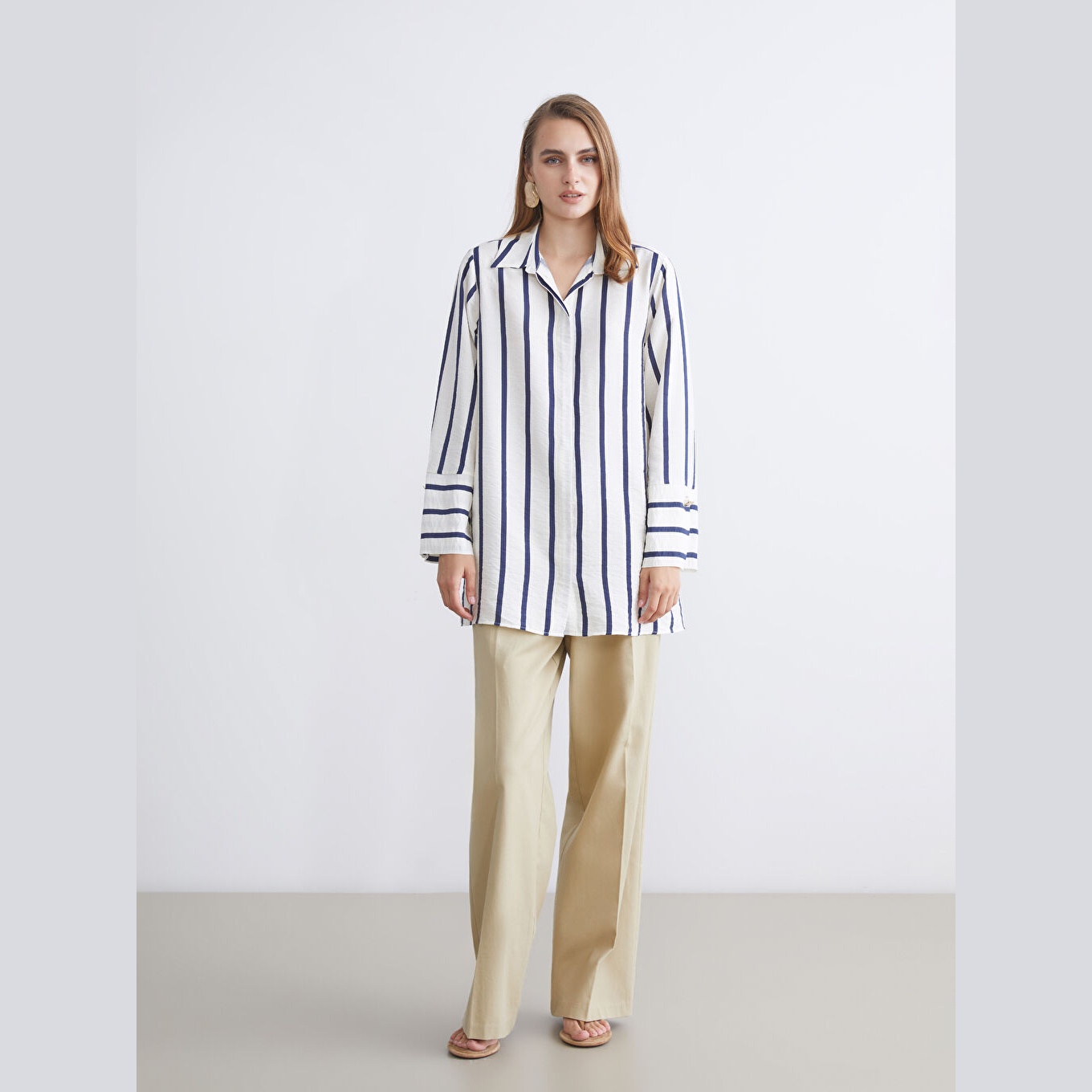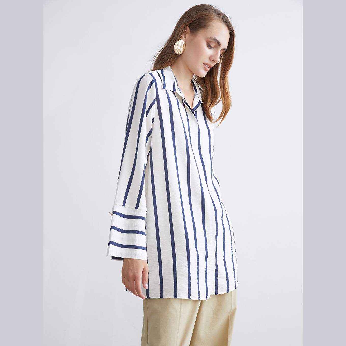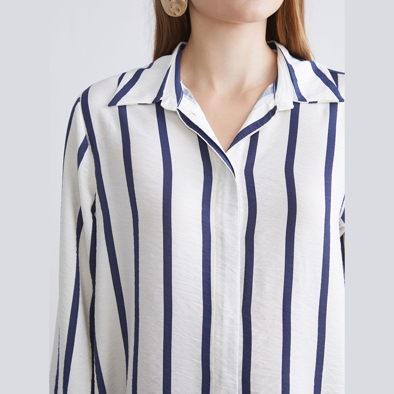 تونيك عملي بلون كحلي بنقشة خطوط ناعمة من مجموعة LC Waikiki للمقاسات الكبيرة، يتميز بياقة قميص تقليدية تضيف لمسة رسمية ناعمة، وقصة منتظمة (Regular Fit) تمنحك مظهرًا متوازنًا ومحتشمًا. مصنوع من خامة ناعمة ومريحة بتركيبة %85 فيسكوز، %15 بولياميد، بأكمام طويلة، بسماكة متوسطة، بطول يصل إلى الورك، ويُغلق بأزرار أمامية، مثالي للتنسيق مع البنطال القماشي أو الجينز في الإطلالات اليومية أو العملية.
