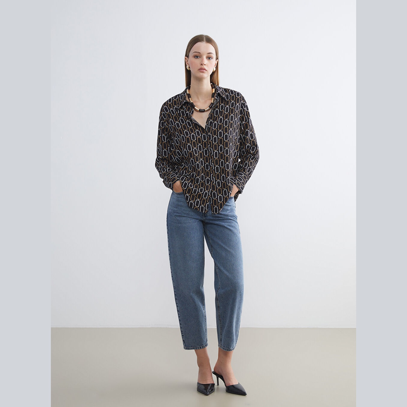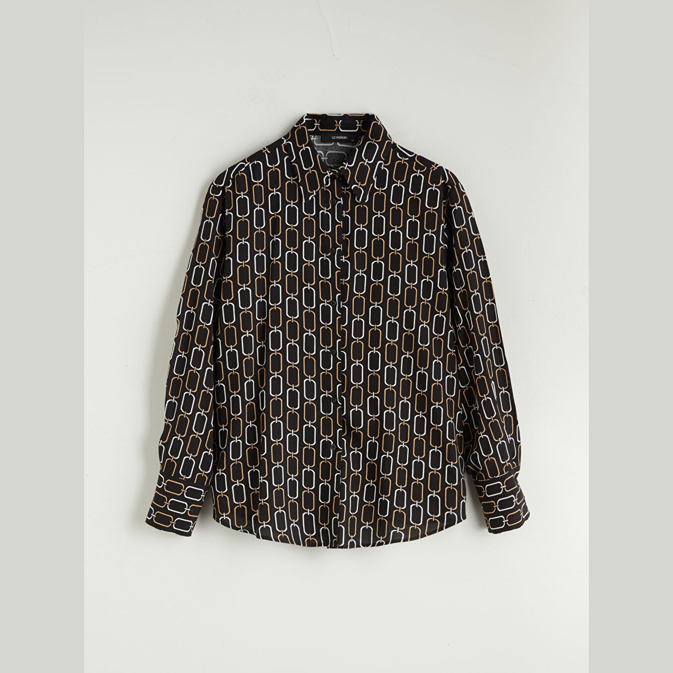 قميص أنيق من مجموعة LCW ECO بلون أسود مزين بنقشة سلاسل ذهبية، يتميز بياقة قميص تقليدية تضيف لمسة رسمية ناعمة، وقصة واسعة (Loose Fit) تمنحك مظهرًا عصريًا ومريحًا. مصنوع من خامة فيسكوز منسوجة (Armürlü) 100%، بأكمام طويلة، بسماكة متوسطة، بطول يصل إلى الورك، ويُغلق بأزرار أمامية، مثالي للتنسيق مع البنطال القماشي أو التنورة لإطلالة أنثوية أنيقة.