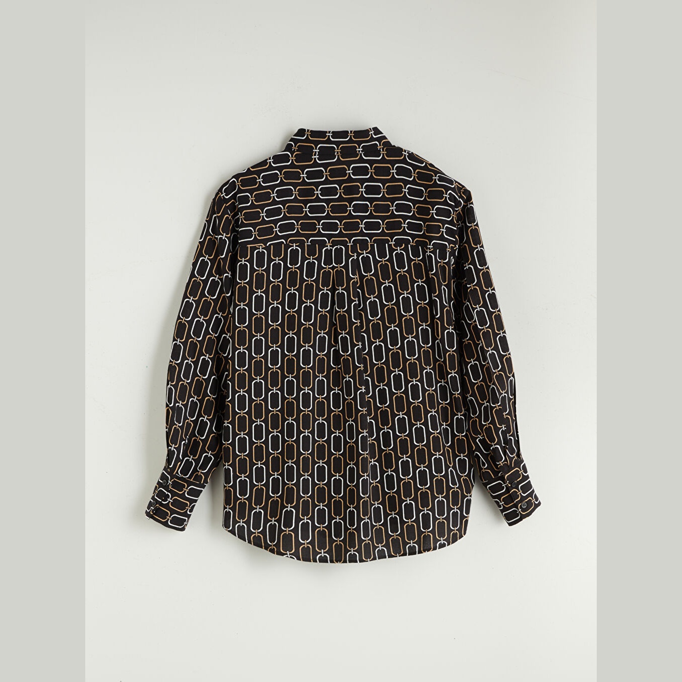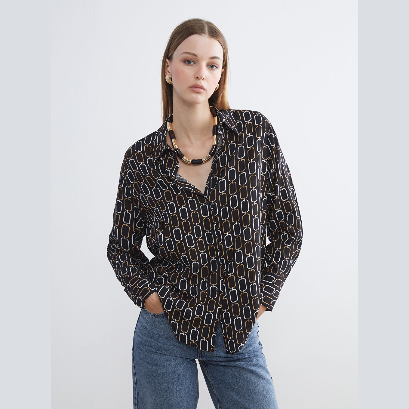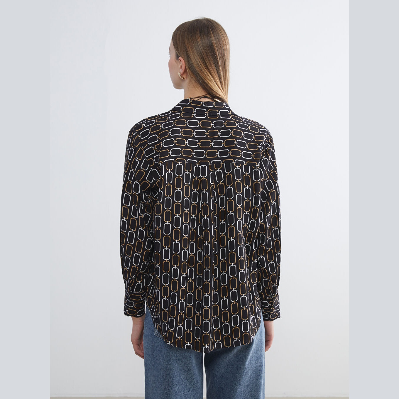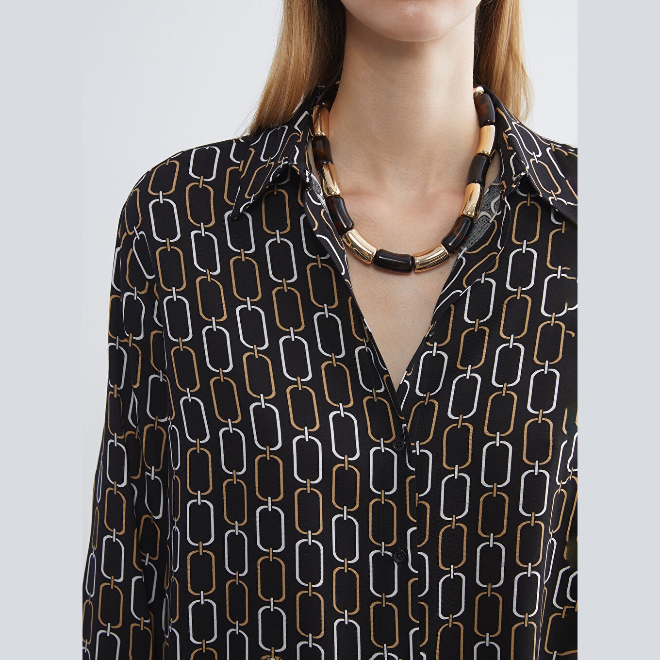 قميص نسائي واسع بنقشة سلاسل – أسود (ياقة قميص، خامة منسوجة، قصة فضفاضة، تصميم عملي بأزرار، بطول الورك)