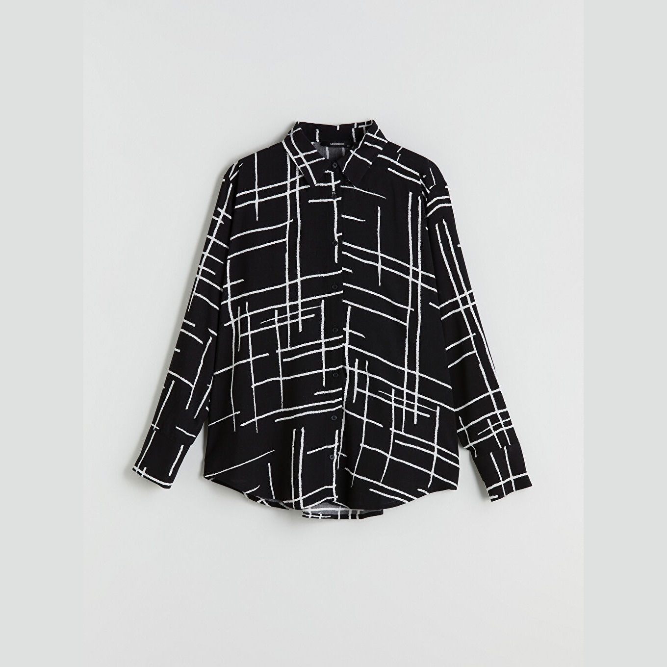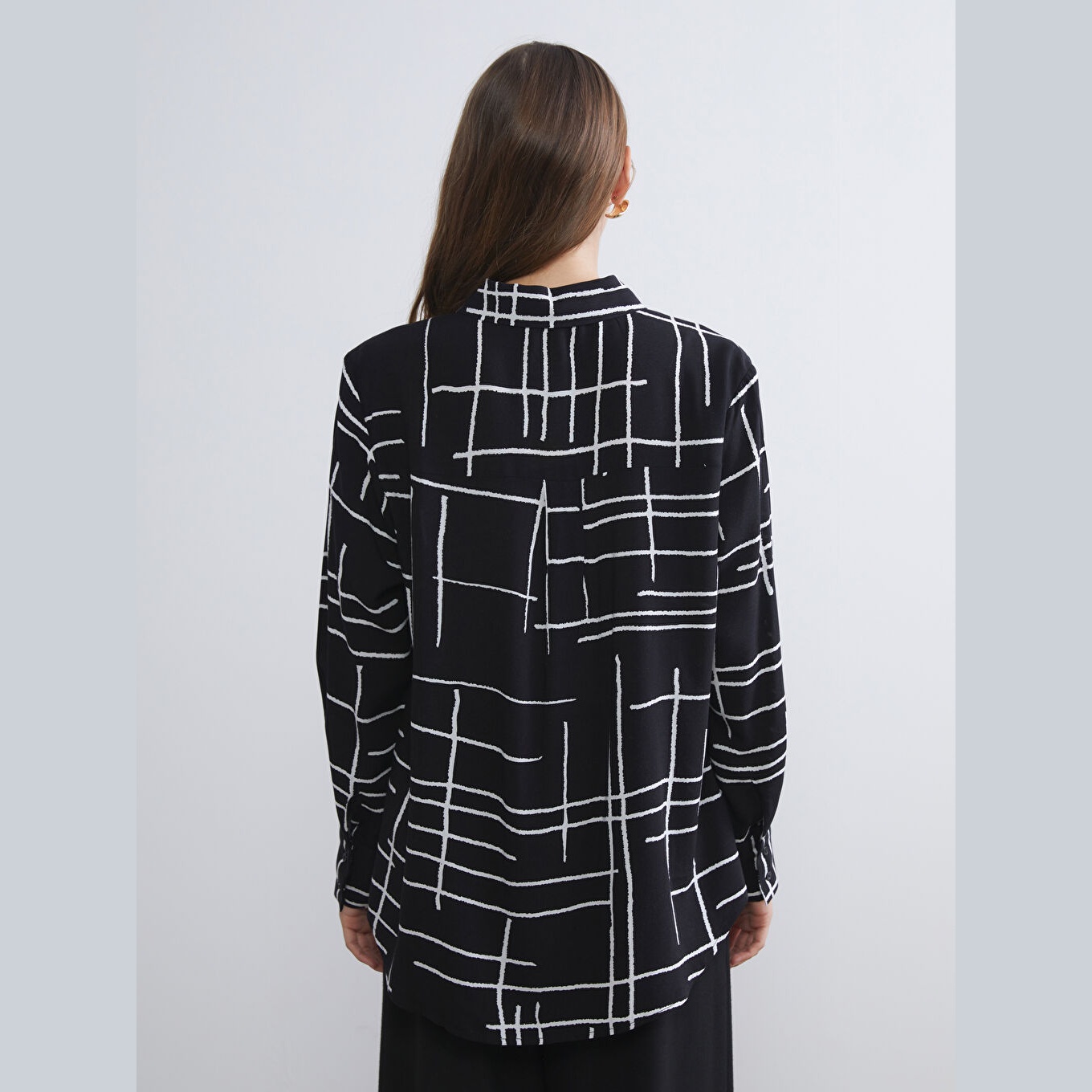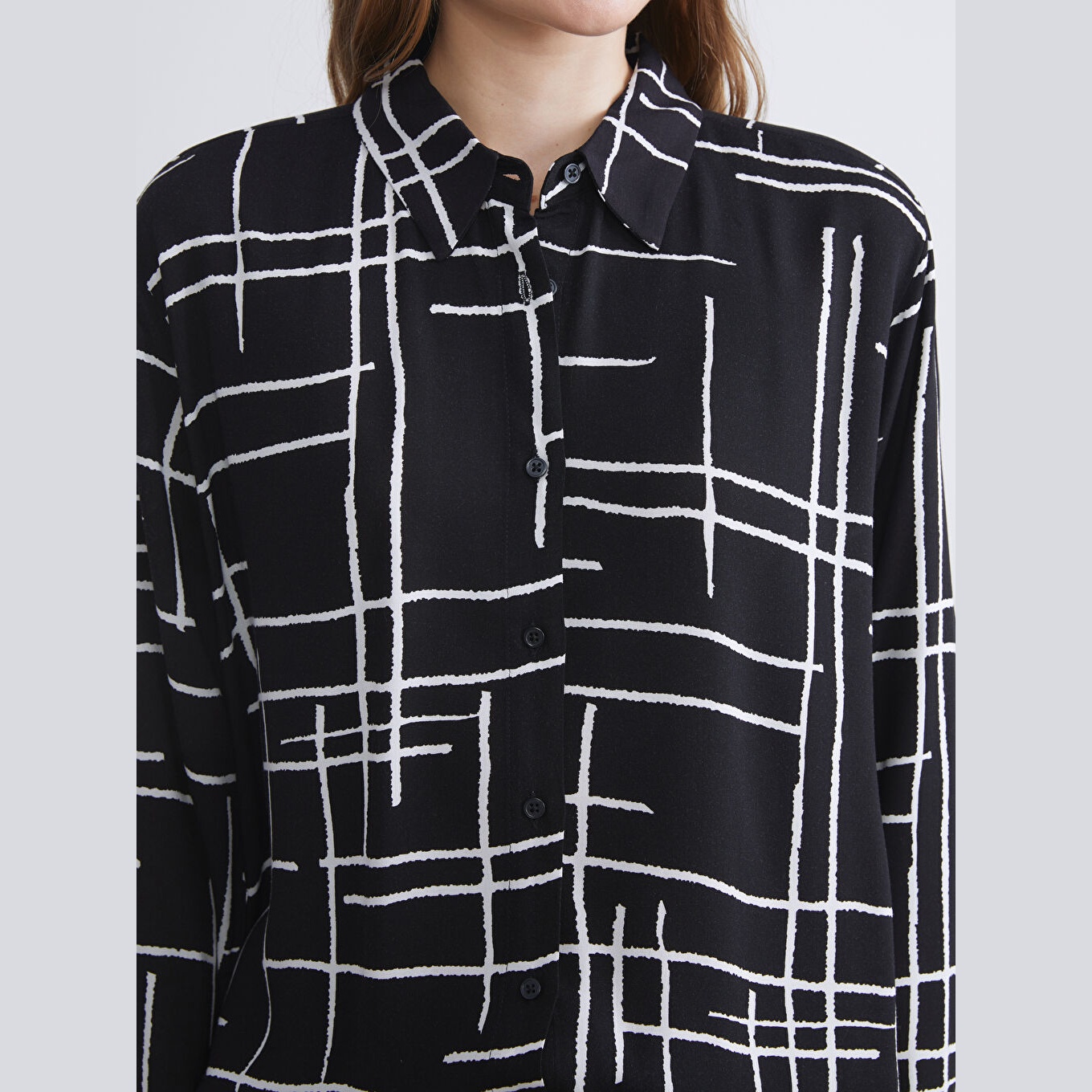 قميص نسائي واسع بنقشة فنية – أسود (ياقة قميص، خامة منسوجة، قصة فضفاضة، تصميم عملي بأزرار، بطول الورك)