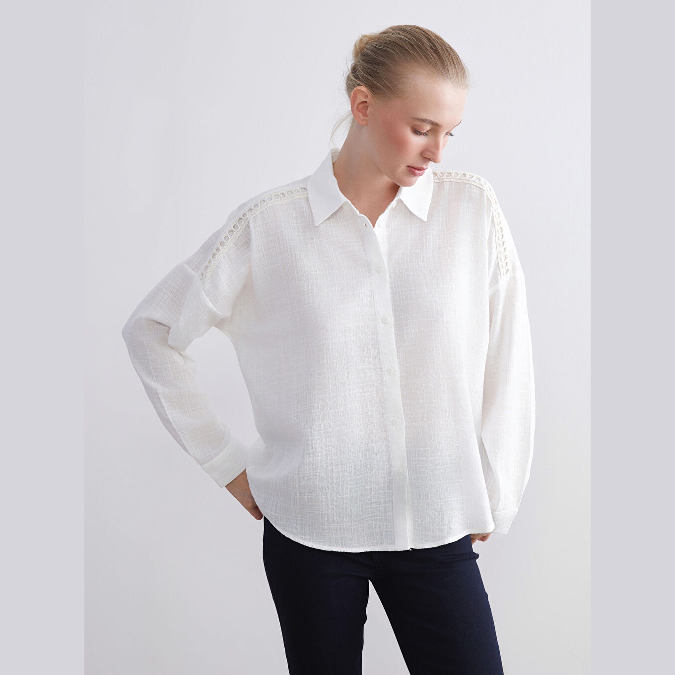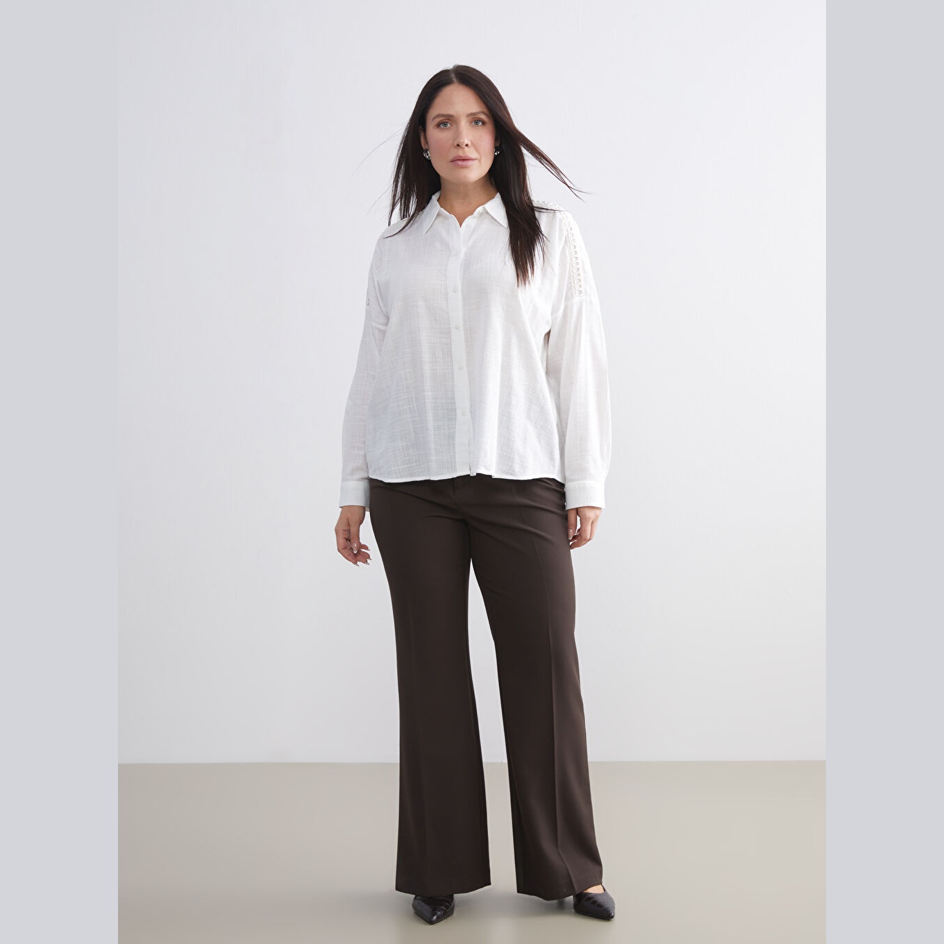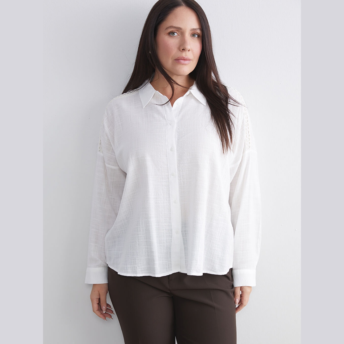 قميص أنيق بلون أبيض سادة من مجموعة LCWAIKIKI Classic – المقاسات الكبيرة، يتميز بياقة قميص تقليدية تضيف لمسة رسمية ناعمة، وقصة واسعة (Loose Fit) تمنحك مظهرًا مريحًا وعصريًا. مصنوع من خامة ناعمة ومريحة بتركيبة %60 قطن، %40 فيسكوز، بأكمام طويلة، بسماكة متوسطة، بطول يصل إلى الورك، ويُغلق بأزرار أمامية، مثالي للتنسيق مع البنطال القماشي أو الجينز في الإطلالات اليومية أو العملية.
