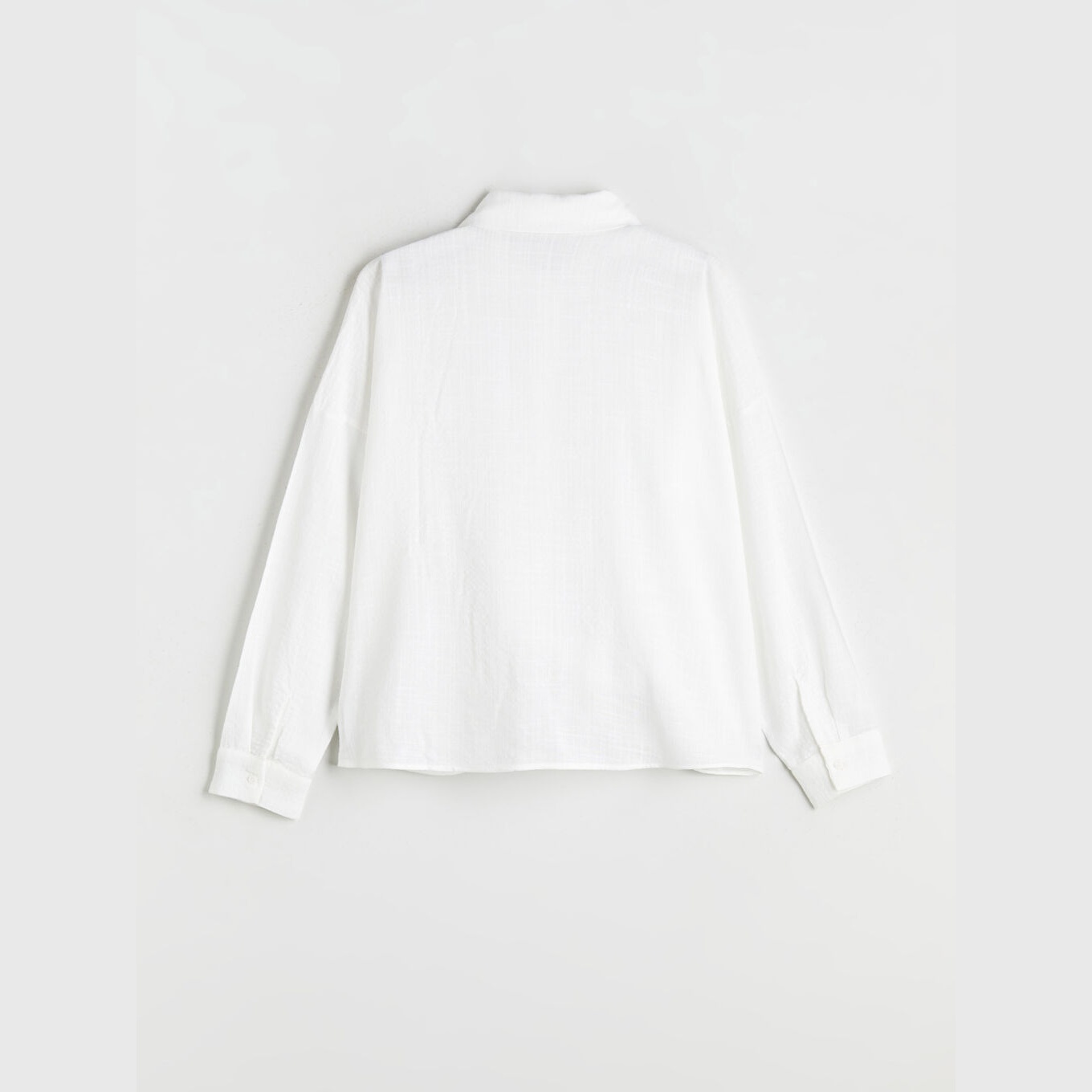 قميص نسائي واسع – أبيض سادة (ياقة قميص، خامة ناعمة، قصة فضفاضة، تصميم عملي بأزرار، بطول الورك)
