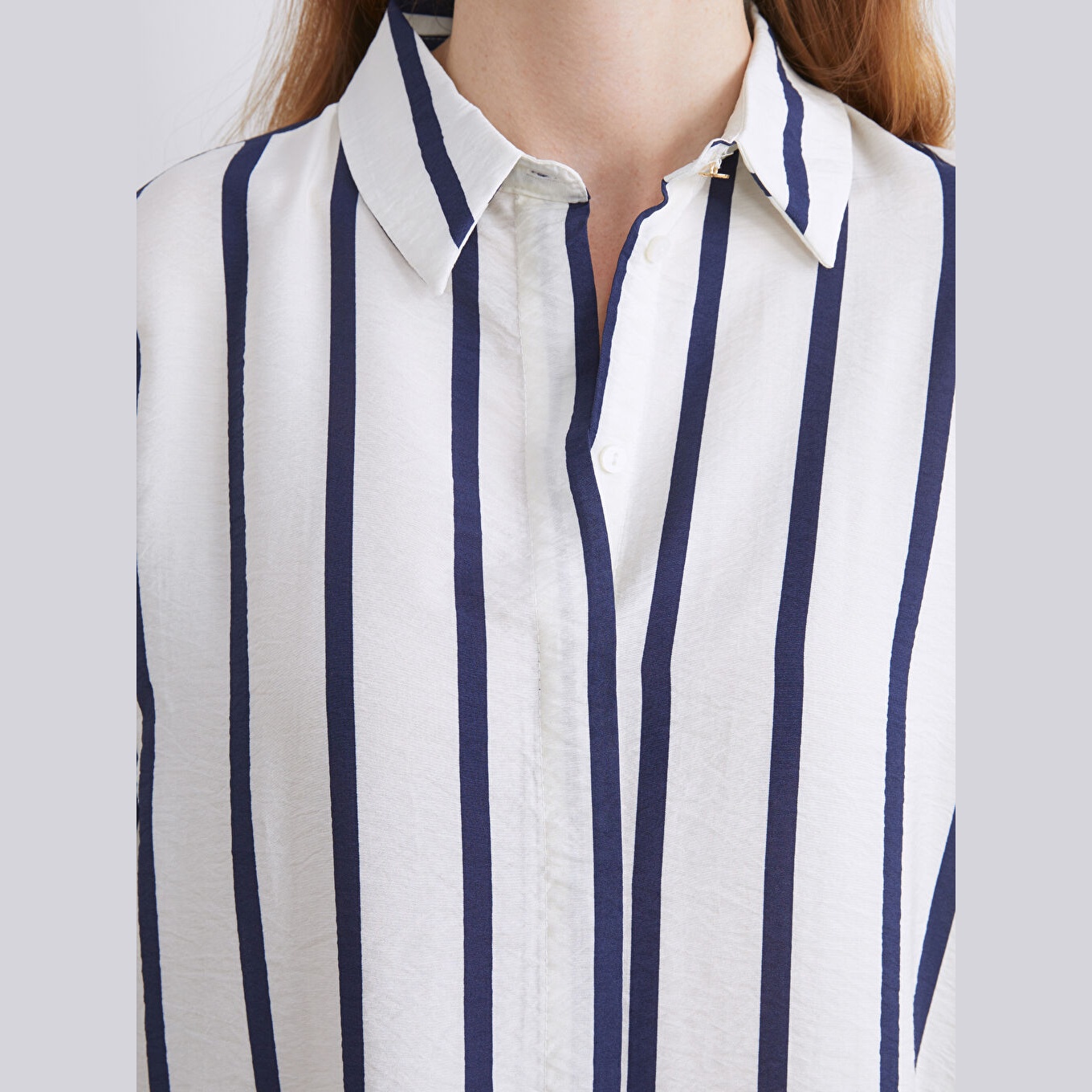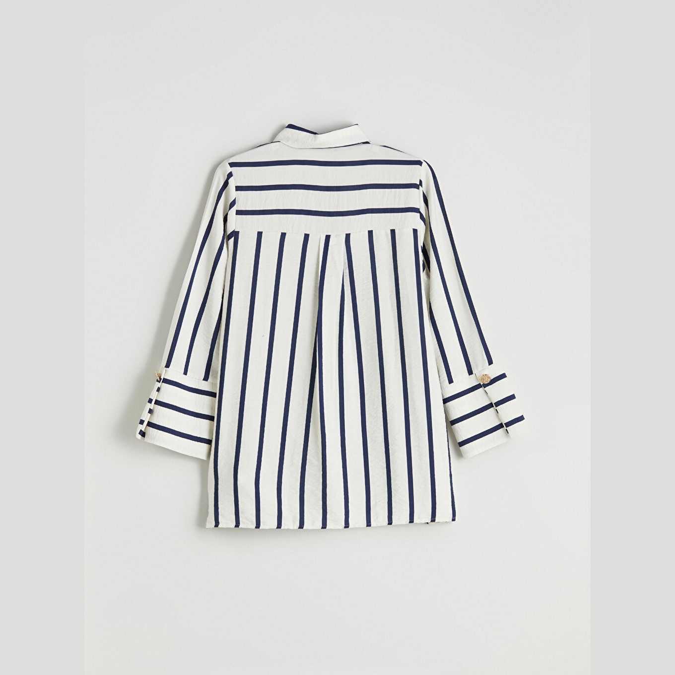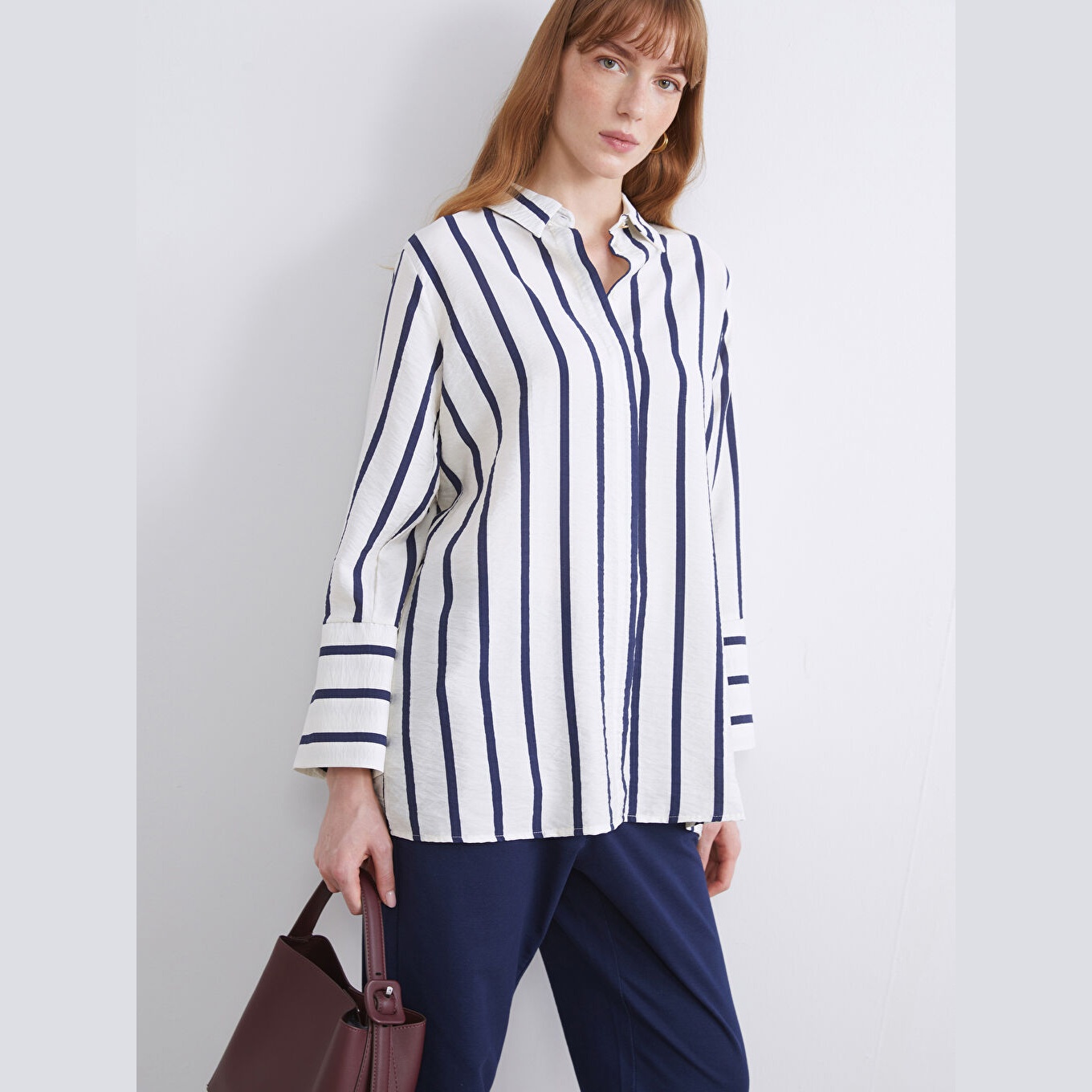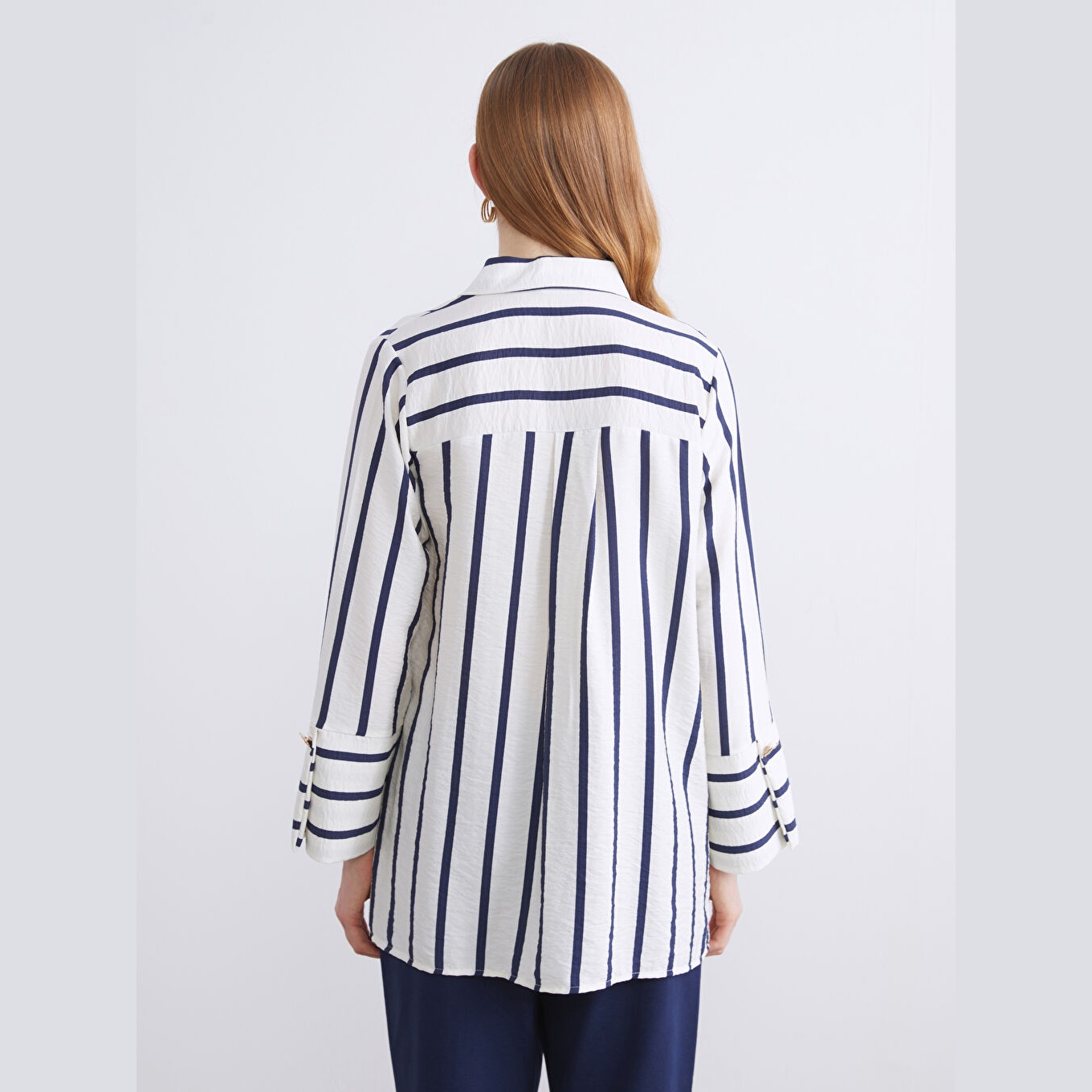 تونيك قميص نسائي مخطط – كحلي (ياقة قميص، خامة ناعمة، قصة قياسية، تصميم عملي بأزرار، بطول الورك)