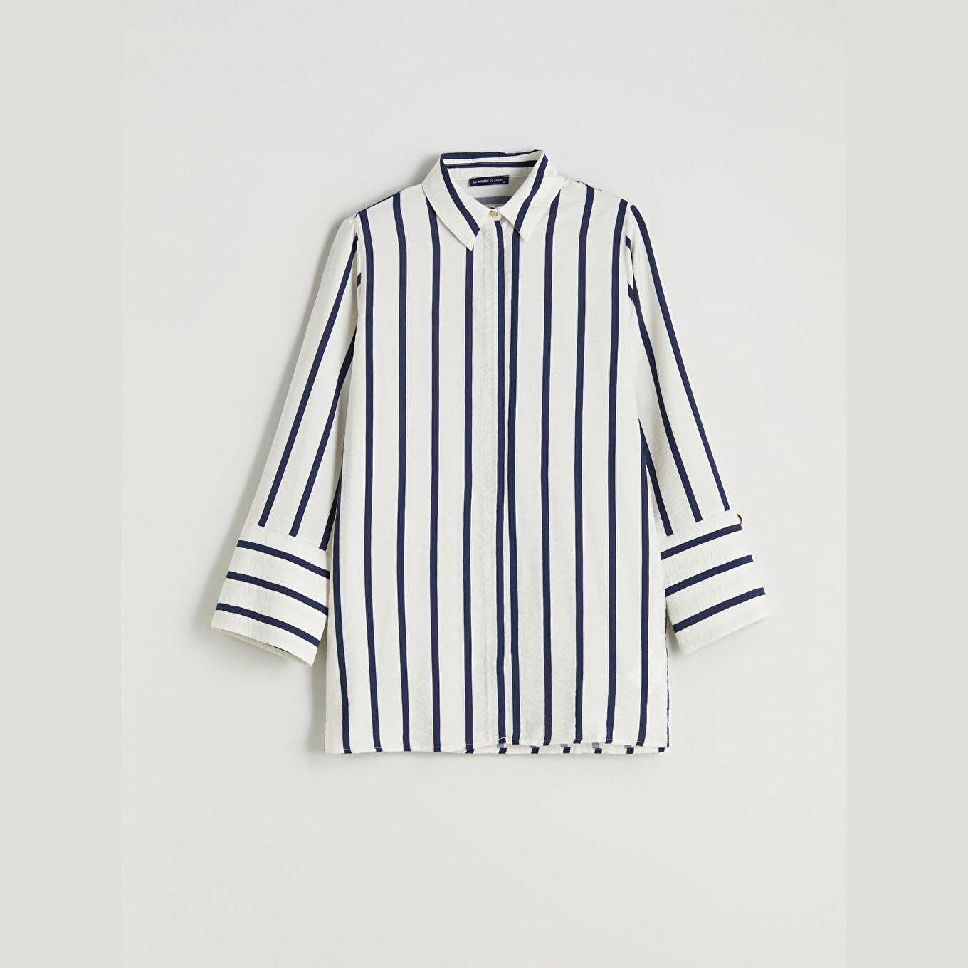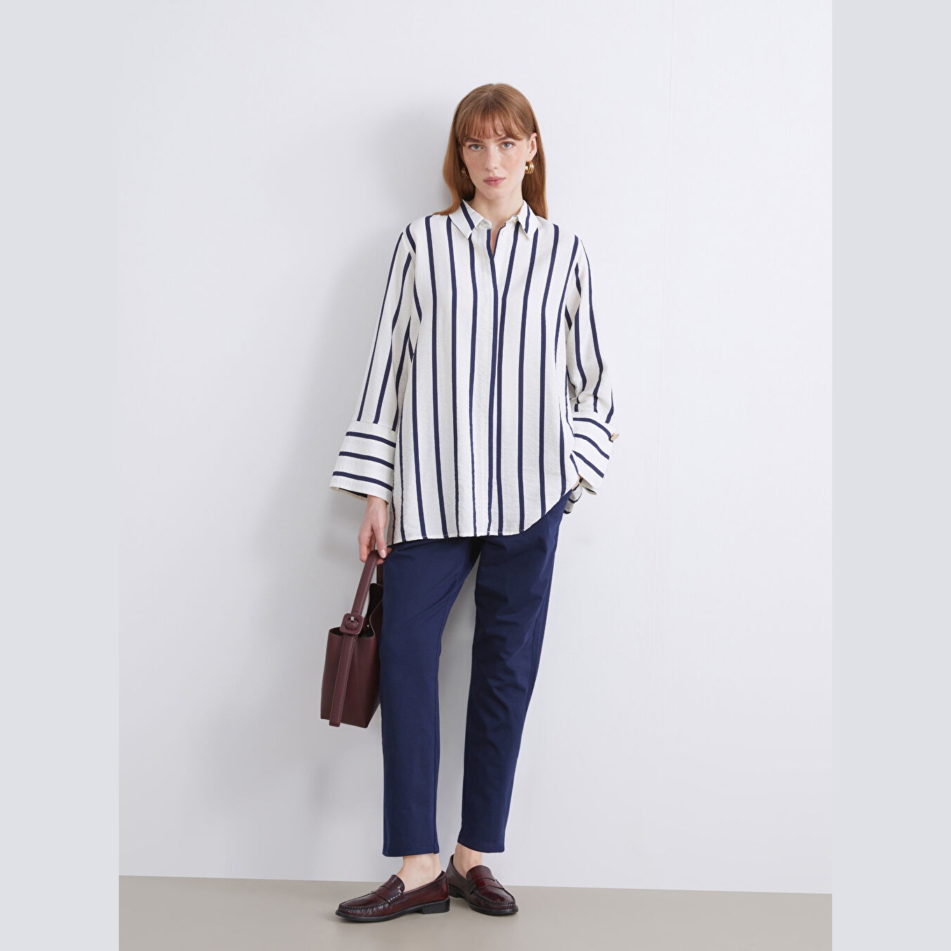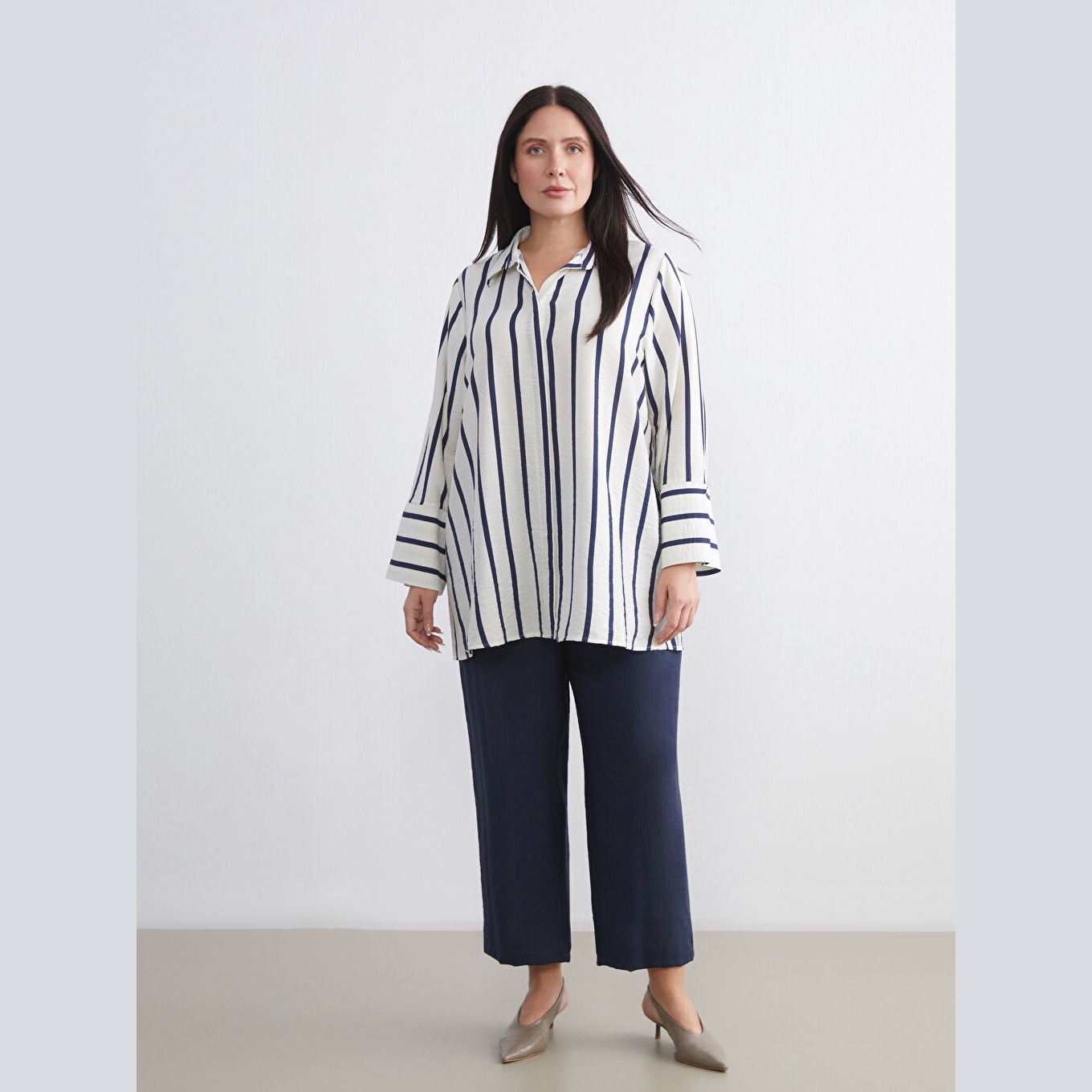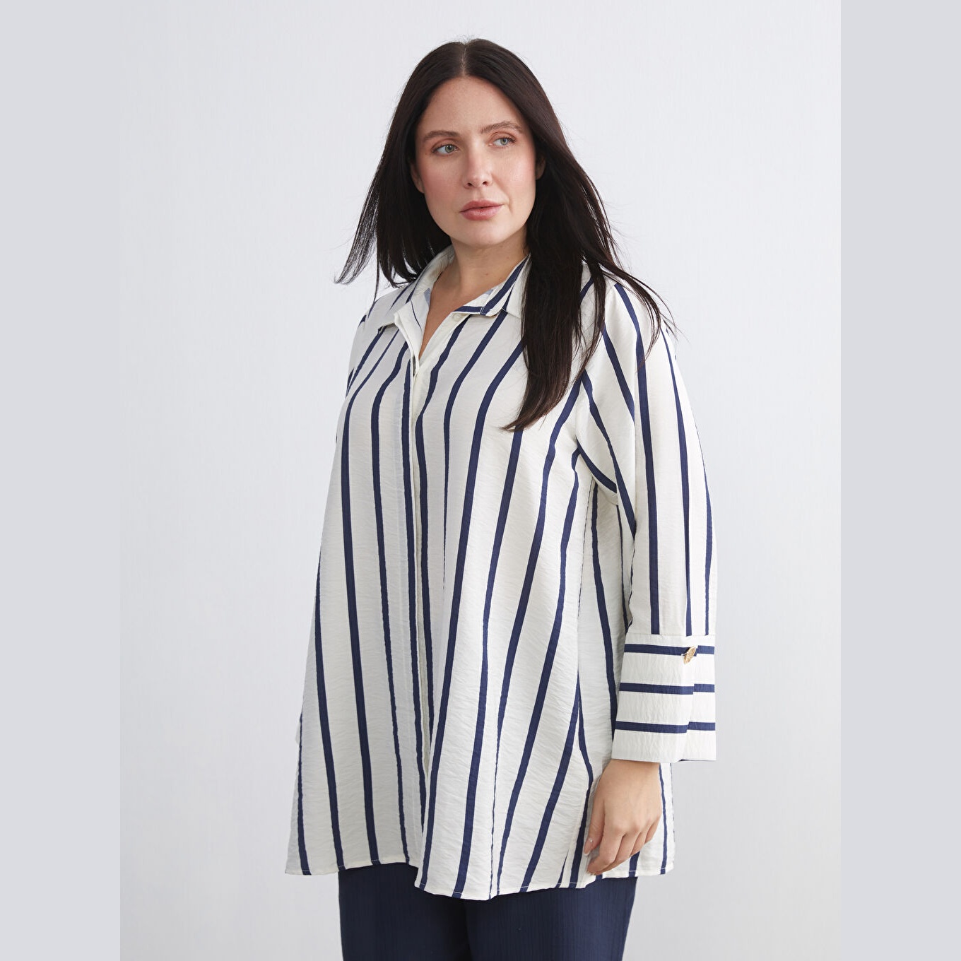 تونيك أنيق بلون كحلي مزين بخطوط ناعمة من مجموعة LCWAIKIKI Classic – المقاسات الكبيرة، يتميز بياقة قميص تقليدية تضيف لمسة رسمية ناعمة، وقصة قياسية (Regular Fit) تمنحك مظهرًا مرتبًا ومريحًا. مصنوع من خامة ناعمة ومريحة بتركيبة %85 فيسكوز، %15 بولياميد، بأكمام طويلة، بسماكة متوسطة، بطول يصل إلى الورك، ويُغلق بأزرار أمامية، مثالي للتنسيق مع البنطال القماشي أو الجينز في الإطلالات اليومية أو العملية.