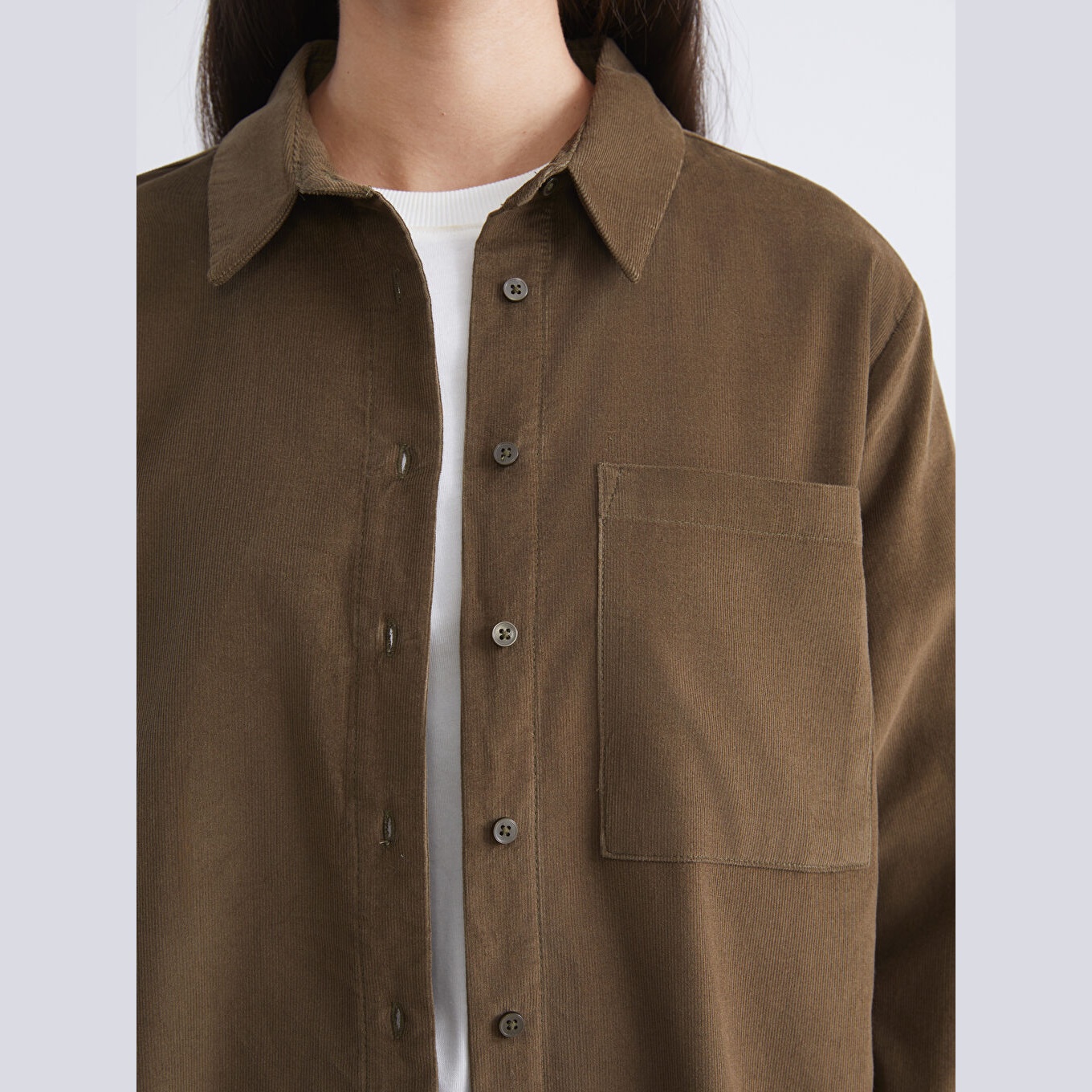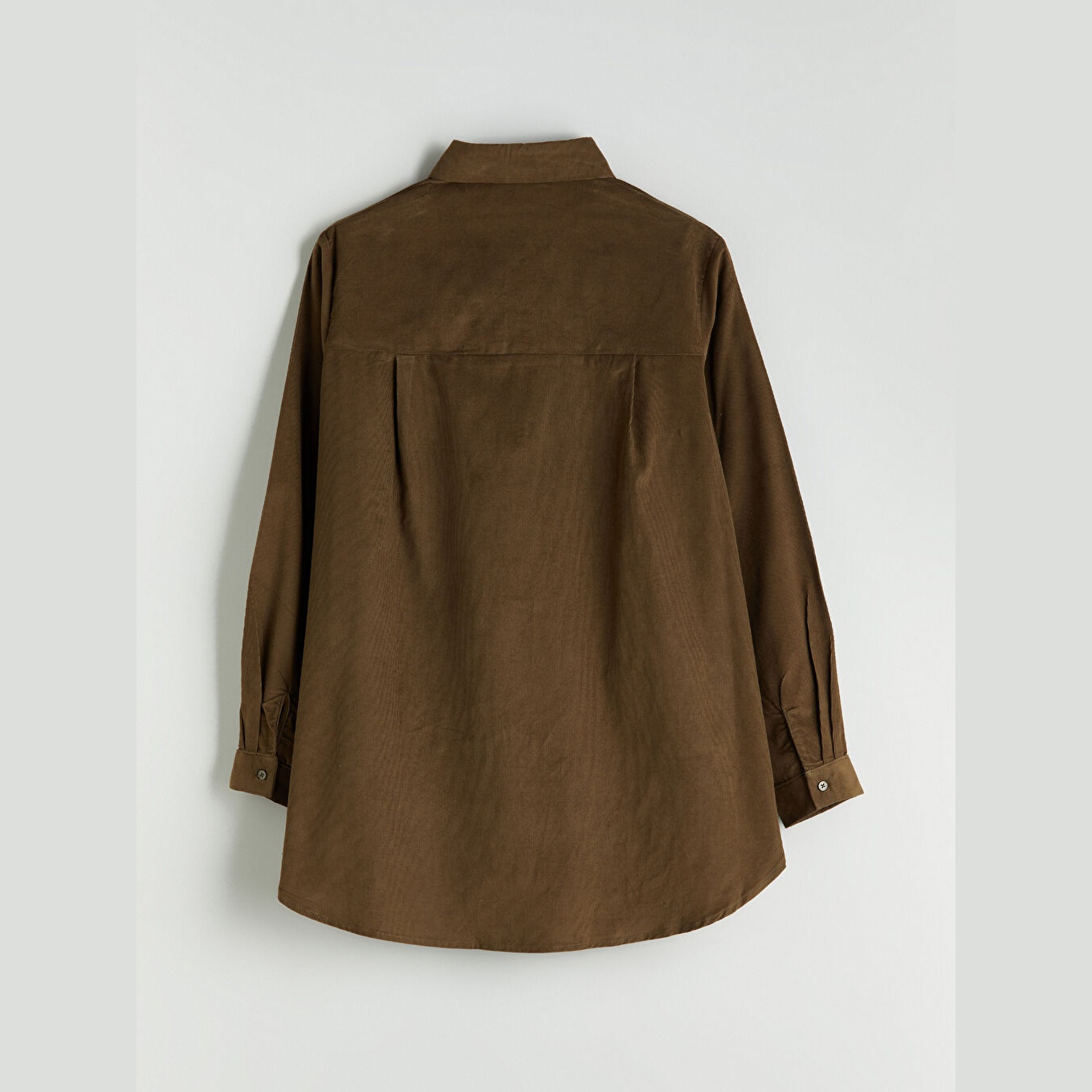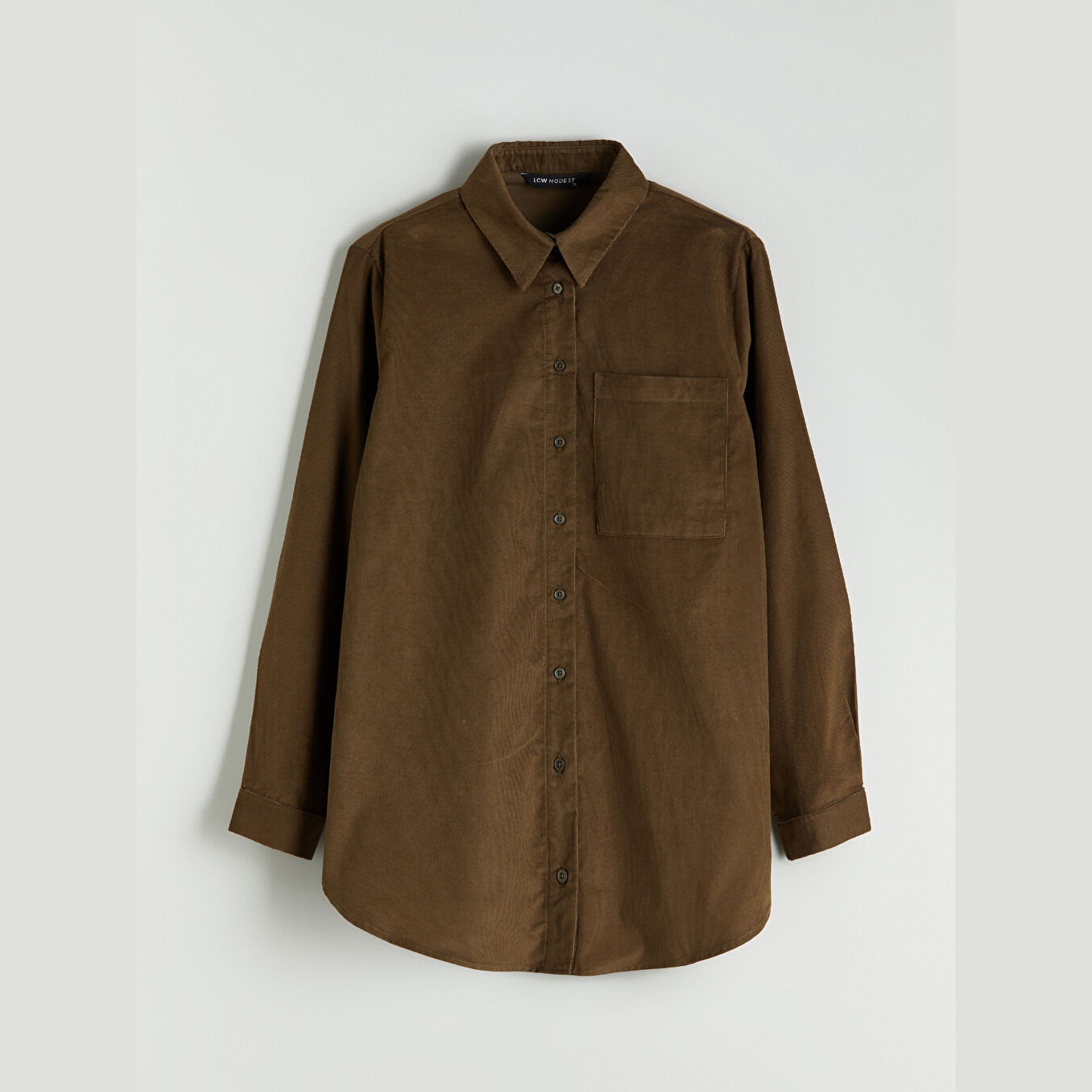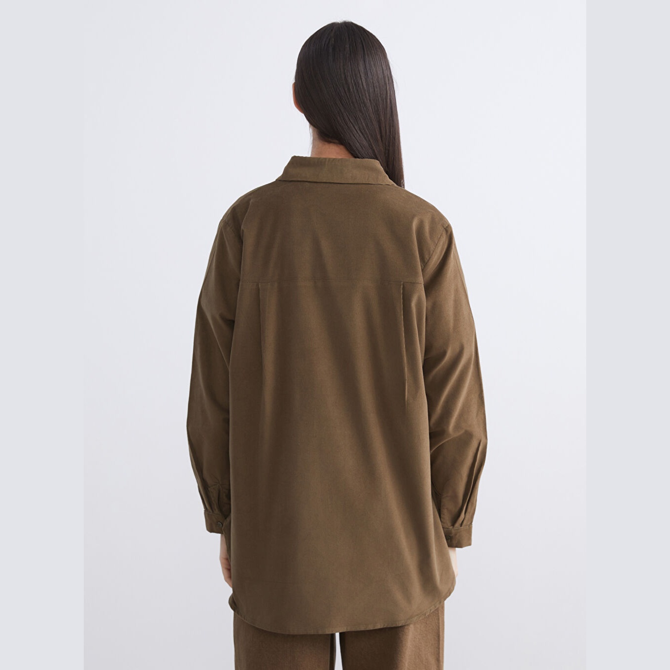تونيك قميص نسائي مخملي – زيتي (ياقة قميص، خامة كاديفه، قصة قياسية، تصميم عملي بأزرار، بطول الورك)