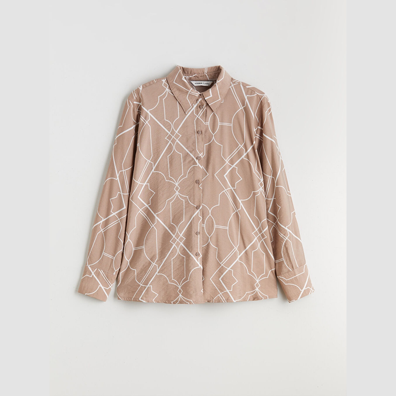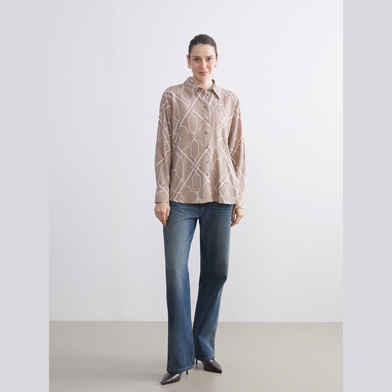 قميص أنيق بلون بني مزخرف بنقشة ناعمة من مجموعة LCWAIKIKI Classic – المقاسات الكبيرة، يتميز بياقة قميص تقليدية تضيف لمسة رسمية ناعمة، وقصة فضفاضة (Loose Fit) تمنحك مظهرًا مريحًا وانسيابيًا. مصنوع من خامة ناعمة ومريحة بتركيبة %85 فيسكوز، %15 بولياميد، بأكمام طويلة، بسماكة متوسطة، بطول يصل إلى الورك، ويُغلق بأزرار أمامية، مثالي للتنسيق مع البنطال القماشي أو الجينز في الإطلالات اليومية أو العملية.