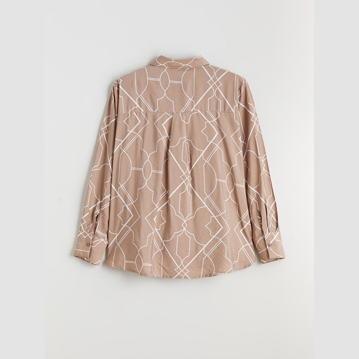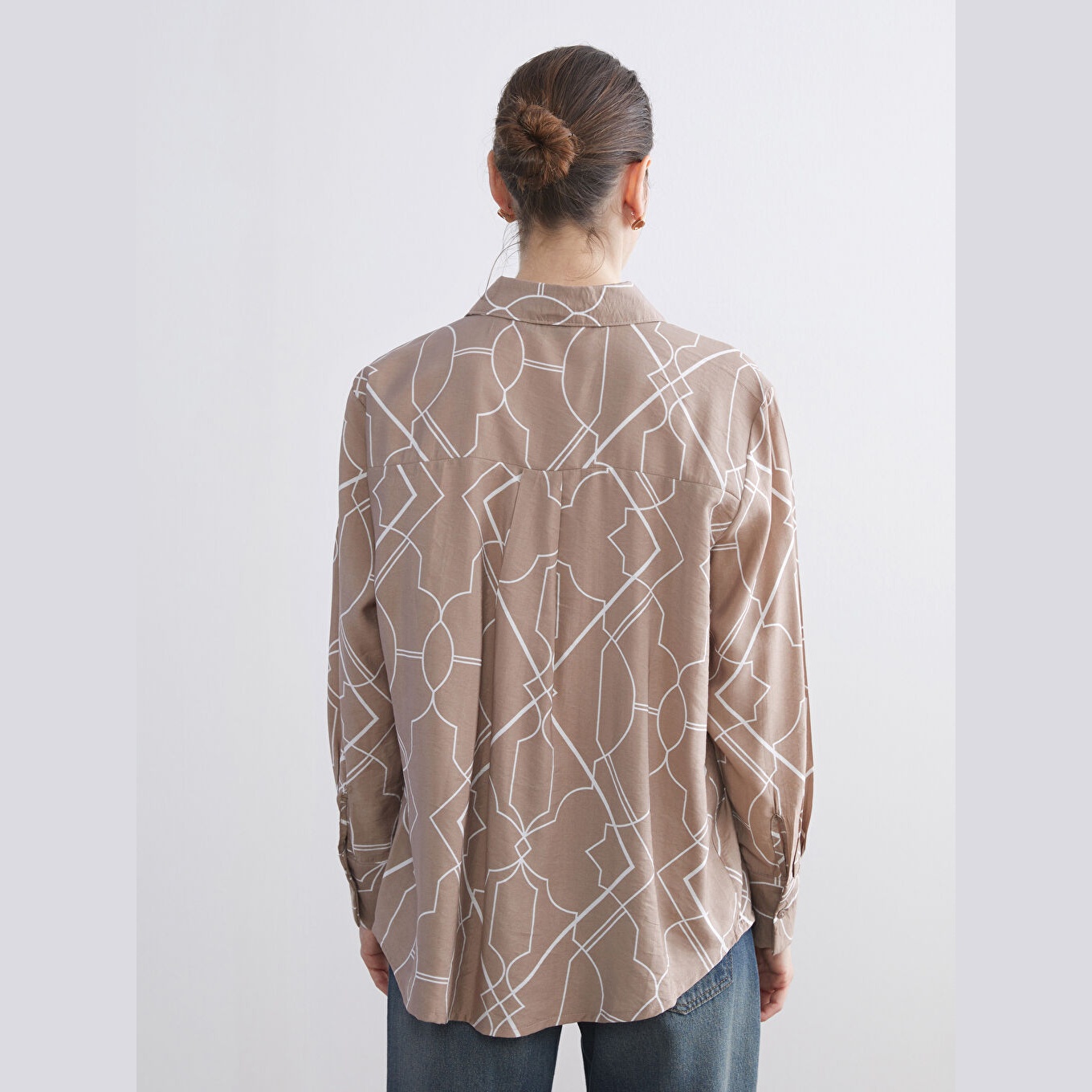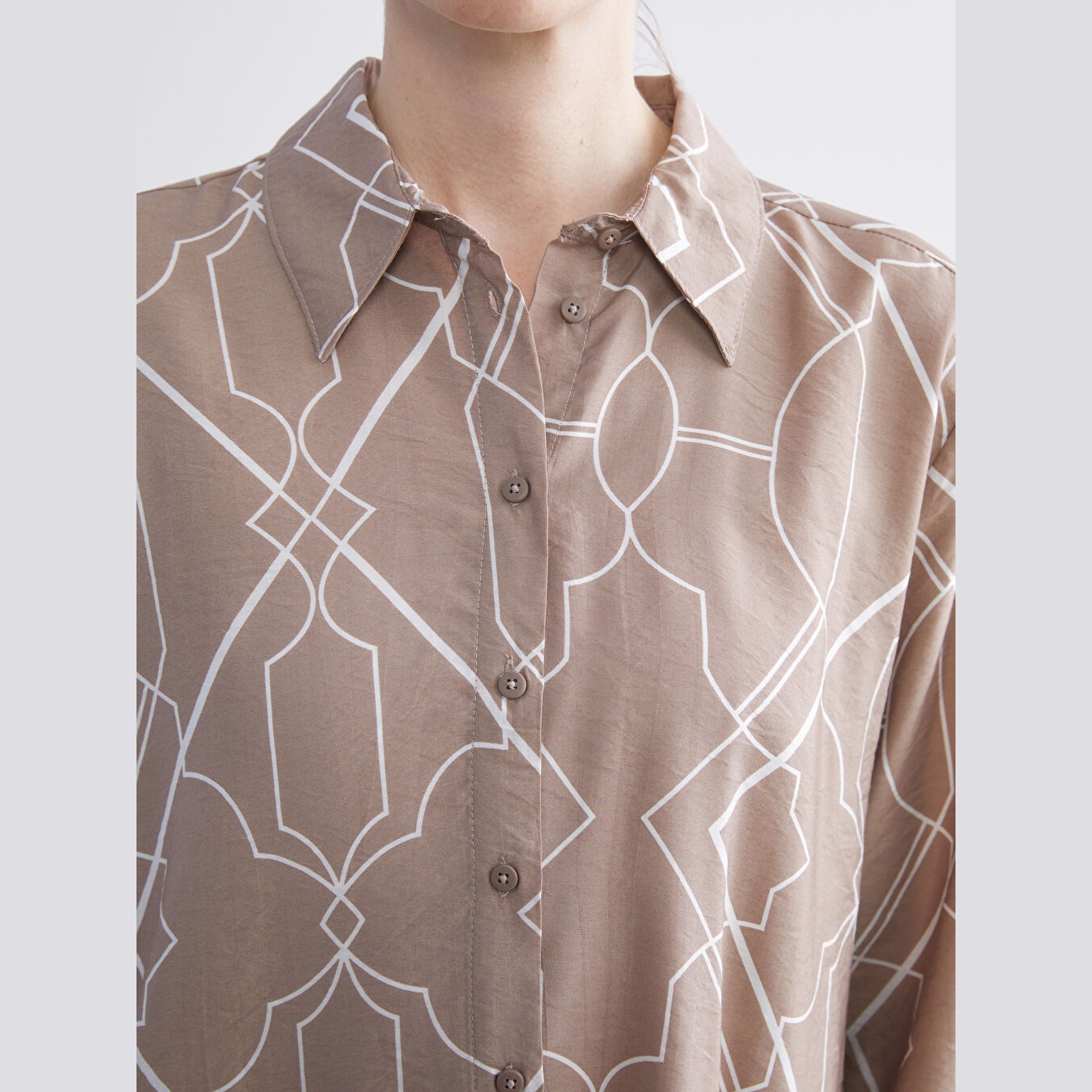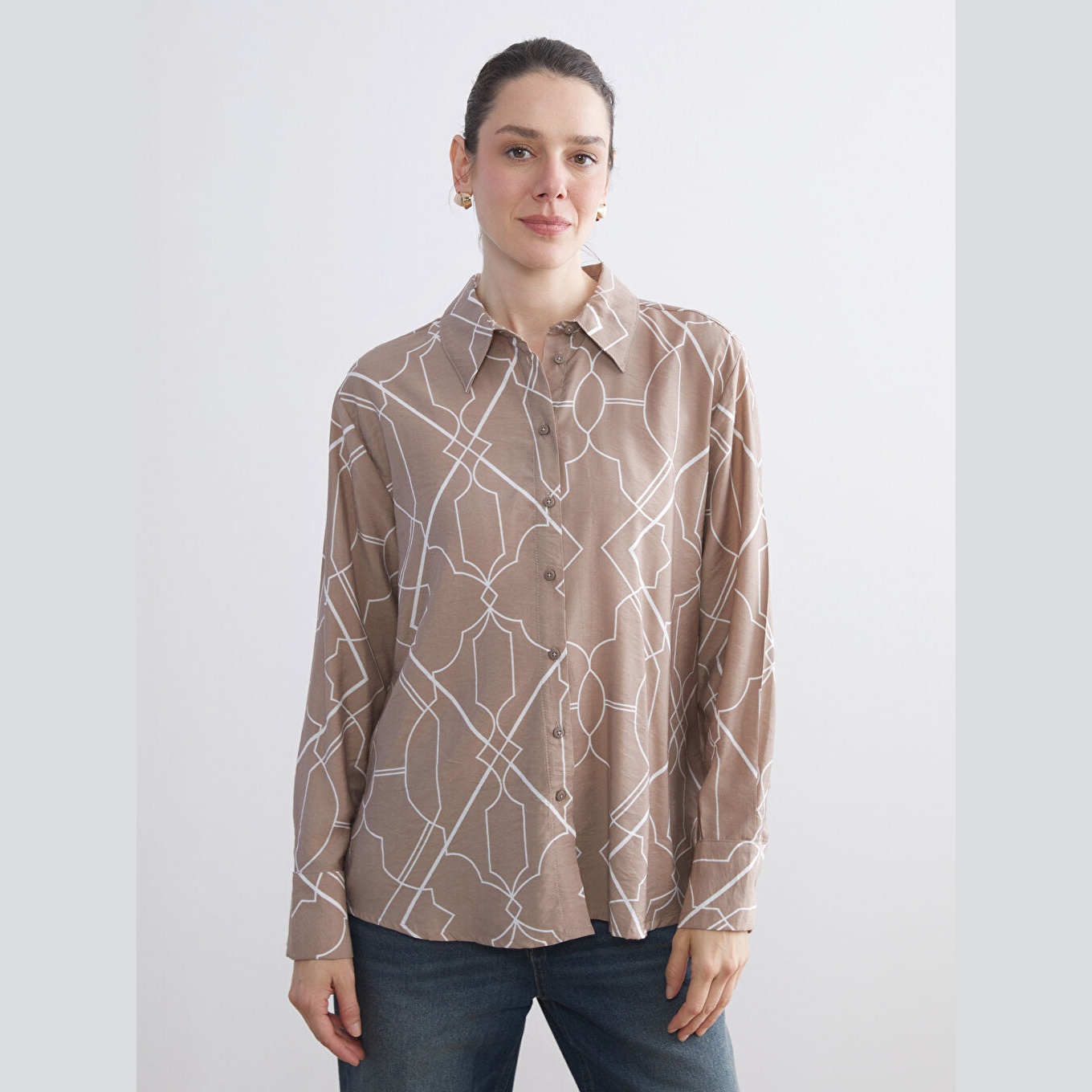 قميص نسائي واسع مزخرف – بني (ياقة قميص، خامة فيسكوز، قصة فضفاضة، تصميم عملي بأزرار، بطول الورك)