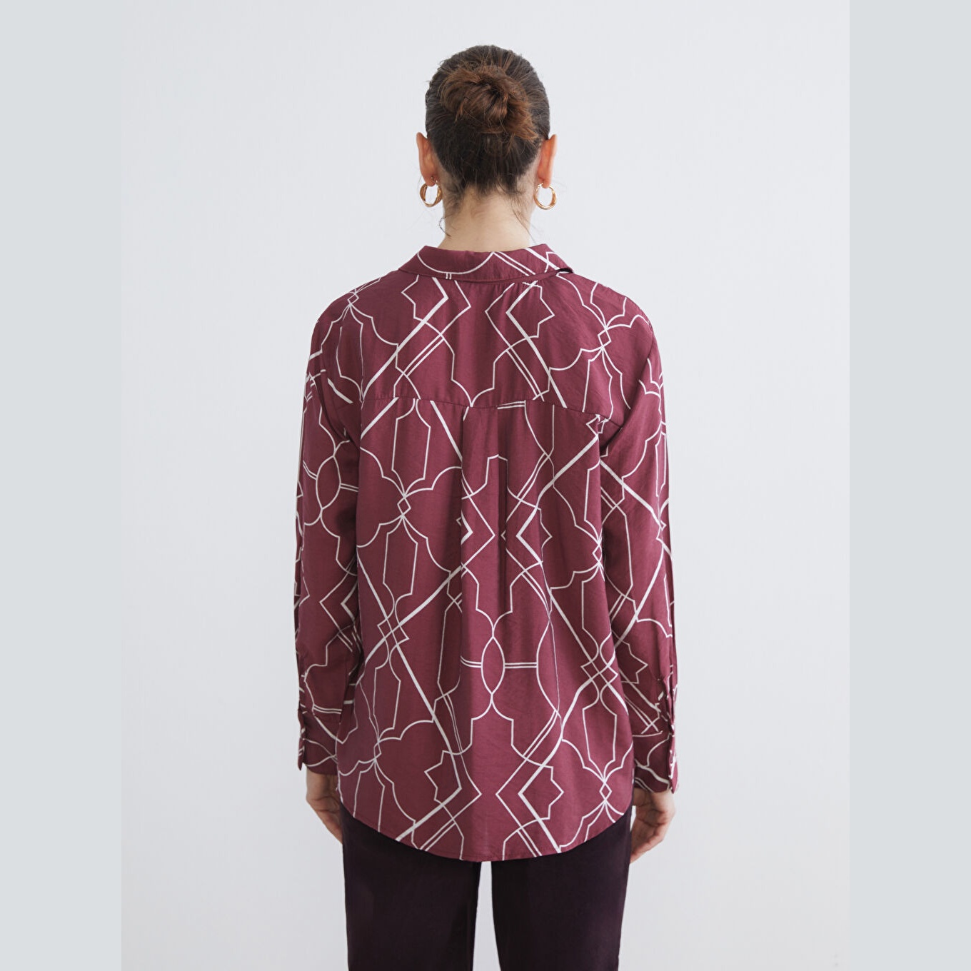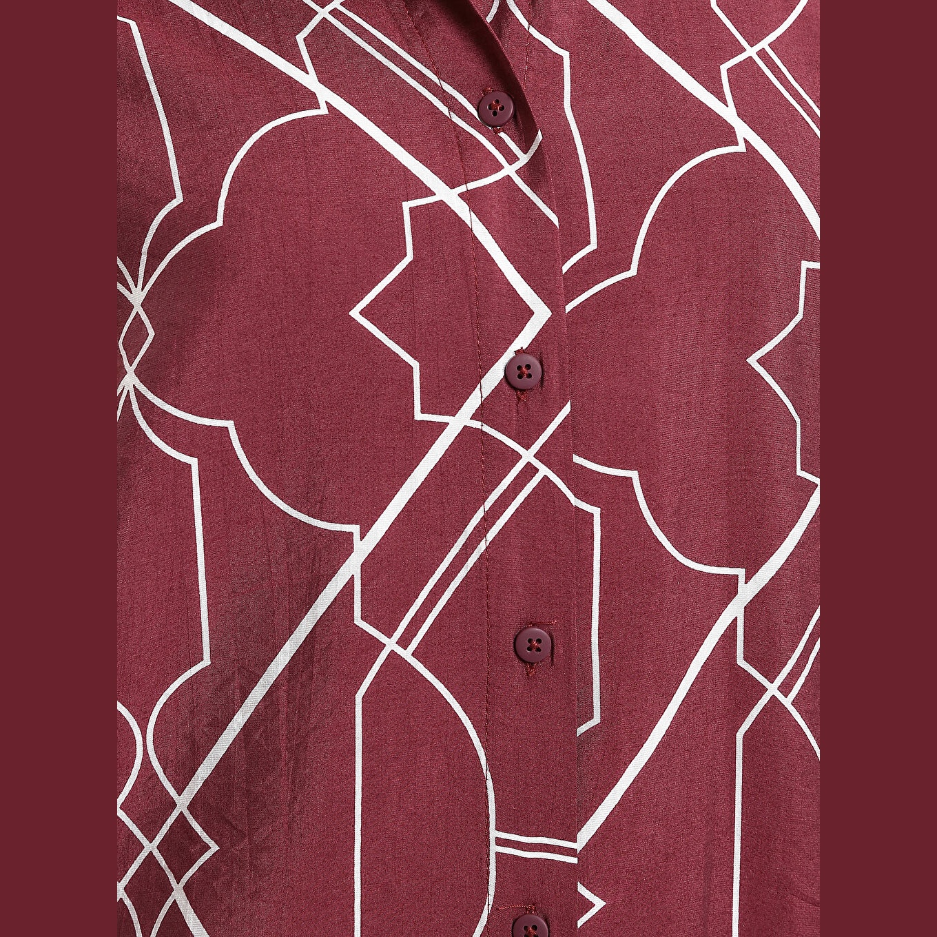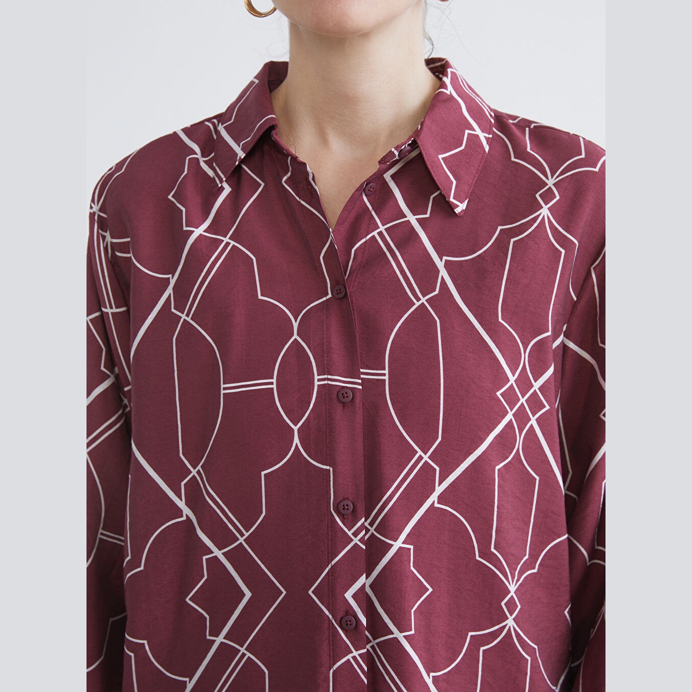 قميص نسائي واسع مزخرف – بوردو (ياقة قميص، خامة فيسكوز، قصة فضفاضة، تصميم عملي بأزرار، بطول الورك)