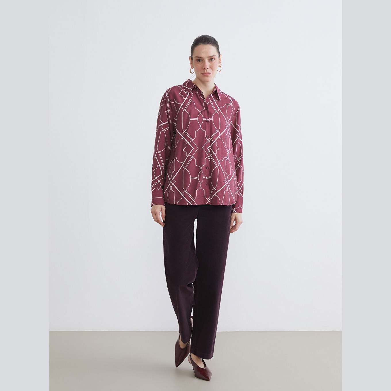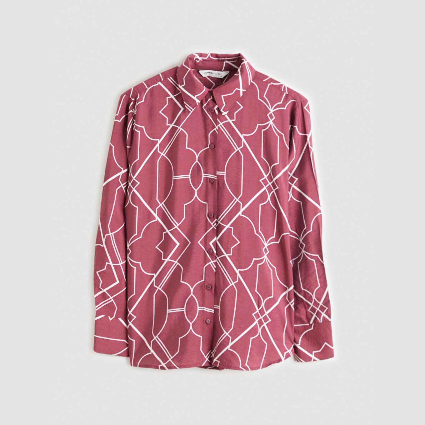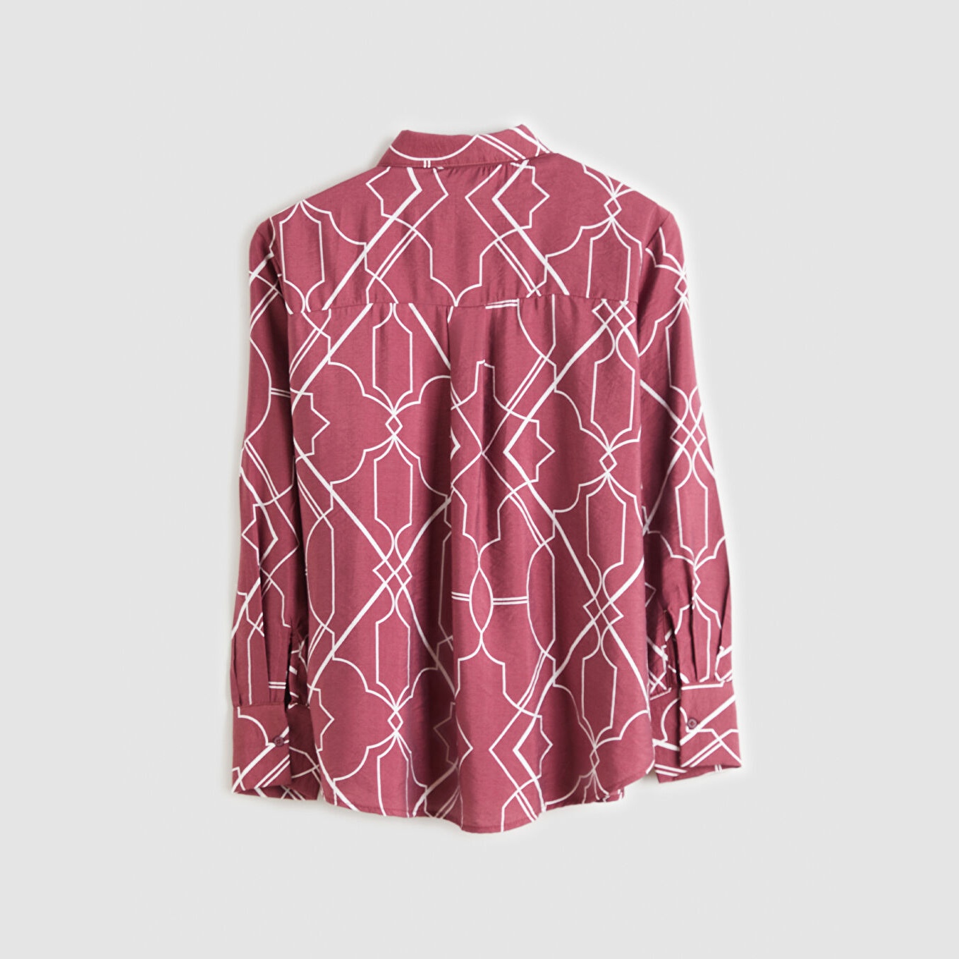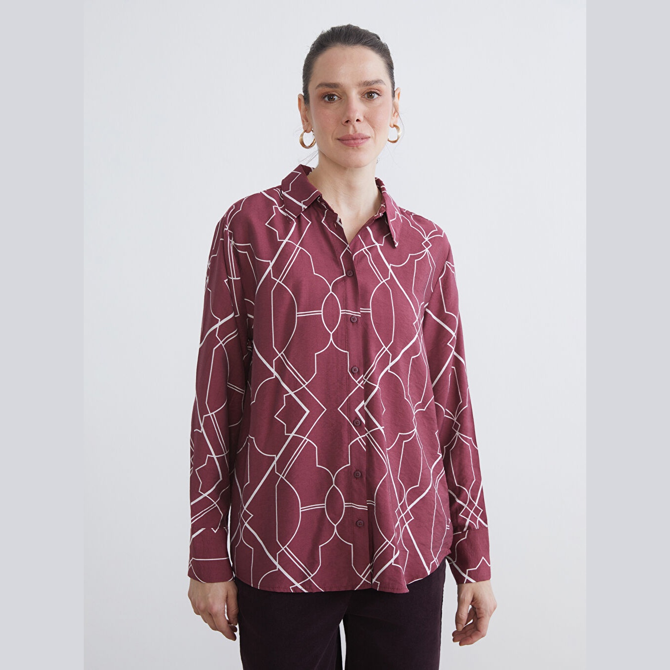 قميص نسائي واسع مزخرف – بوردو (ياقة قميص، خامة فيسكوز، قصة فضفاضة، تصميم عملي بأزرار، بطول الورك)
